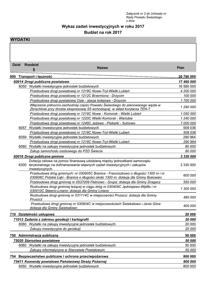 Załącznik nr 3 do Uchwały nr Rady Powiatu Świeckiego z dnia Wykaz zadań inwestycyjnych w roku 2017 Budżet na rok 2017 WYDATKI Dział Rozdział § Nazwa 600 Transport i łączność 60014 Drogi publiczne powiatowe 6050 Wydatki inwestycyjne jednostek budżetowych Przebudowa drogi powiatowej nr 1218C Nowe-Tryl-Wielki Lubień Przebudowa drogi powiatowej nr 1212C Brzemiona - Drzycim Przebudowa drogi powiatowej Osie - stacja kolejowa - Drzycim Włączenie północno-zachodniej części Powiatu Świeckiego do planowanego węzła w Zbrachlinie przy drodze ekspresowej S5 wchodzącej w skład korytarza TEN-T Przebudowa drogi powiatowej nr 1219C Nowe - Komorsk - Wielki Lubień Przebudowa drogi powiatowej nr 1220C Wielki Komorsk - Warlubie Przebudowa drogi powiatowej nr 1249C Jeżewo - Piskarki - Sulnowo 6057 Wydatki inwestycyjne jednostek budżetowych Przebudowa drogi powiatowej nr 1218C Nowe-Tryl-Wielki Lubień 6059 Wydatki inwestycyjne jednostek budżetowych Przebudowa drogi powiatowej nr 1218C Nowe-Tryl-Wielki Lubień 6060 Wydatki na zakupy inwestycyjne jednostek budżetowych Zakup samochodu osobowego do PZD Świecie 60016 Drogi publiczne gminne Dotacja celowa na pomoc finansową udzielaną między jednostkami samorządu 6300 terytorialnego na dofinansowanie własnych zadań inwestycyjnych i zakupów inwestycyjnych Przebudowa dróg gminnych: nr 030905C Branica - Franciszkowo o długości 1300 m i nr 030906C Polskie Łąki - Branica o długości około 1300 m: dotacja dla Gminy Bukowiec Przebudowa drogi gminnej nr 0537009 Fletnowo - Grupa: dotacja dla Gminy Dragacz Rozbudowa drogi gminnej leżącej w ciągu dróg nr 030409C Jędrzejewo-Wętfie i nr 030410C Sławno-Lniano: dotacja dla Gminy Lniano Rozbudowa drogi gminnej nr 031114C w miejscowości Pruszcz: dotacja dla Gminy Pruszcz Przebudowa drogi gminnej nr 030804C w miejscowościach Świekatowo i Jania Góra: dotacja dla Gminy Świekatowo Plan 20 790 000 17 460 000 16 580 000 4 200 000 100 000 1 700 000 1 290 000 1 050 000 1 240 000 7 000 000 509 036 509 036 290 964 290 964 80 000 80 000 3 330 000 3 330 000 600 000 550 000 1 300 000 480 000 400 000 710 Działalność usługowa 71012 Zadania z zakresu geodezji i kartografii 6060 Wydatki na zakupy inwestycyjne jednostek budżetowych Zakupy inwestycyjne do geodezji 20 000 20 000 20 000 20 000 750 Administracja publiczna 75020 Starostwa powiatowe 6060 Wydatki na zakupy inwestycyjne jednostek budżetowych Zakupy informatyczne w Starostwie Powiatowym 50 000 50 000 50 000 50 000 754 Bezpieczeństwo publiczne i ochrona przeciwpożarowa 75411 Komendy powiatowe Państwowej Straży Pożarnej 6050 Wydatki inwestycyjne jednostek budżetowych 800 000 800 000 800 000 Dział Rozdział § Nazwa Budowa jednostki ratowniczo-gaśniczej wraz z Komendą Powiatową Państwowej Straży Pożarnej w Świeciu 852 Pomoc społeczna 85202 Domy pomocy społecznej 6050 Wydatki inwestycyjne jednostek budżetowych Rozbudowa budynku pawilonu o palarnię Dotacja celowa na pomoc finansową udzielaną między jednostkami samorządu 6300 terytorialnego na dofinansowanie własnych zadań inwestycyjnych i zakupów inwestycyjnych Termomodernizacja budynku Międzygminnego Ośrodka Opiekuńczego w Pruszczu: dotacja dla Związku Gmin Międzygminny Ośrodek Opiekuńczy RAZEM WYDATKI Plan 800 000 250 000 250 000 50 000 50 000 200 000 200 000 21 910 000