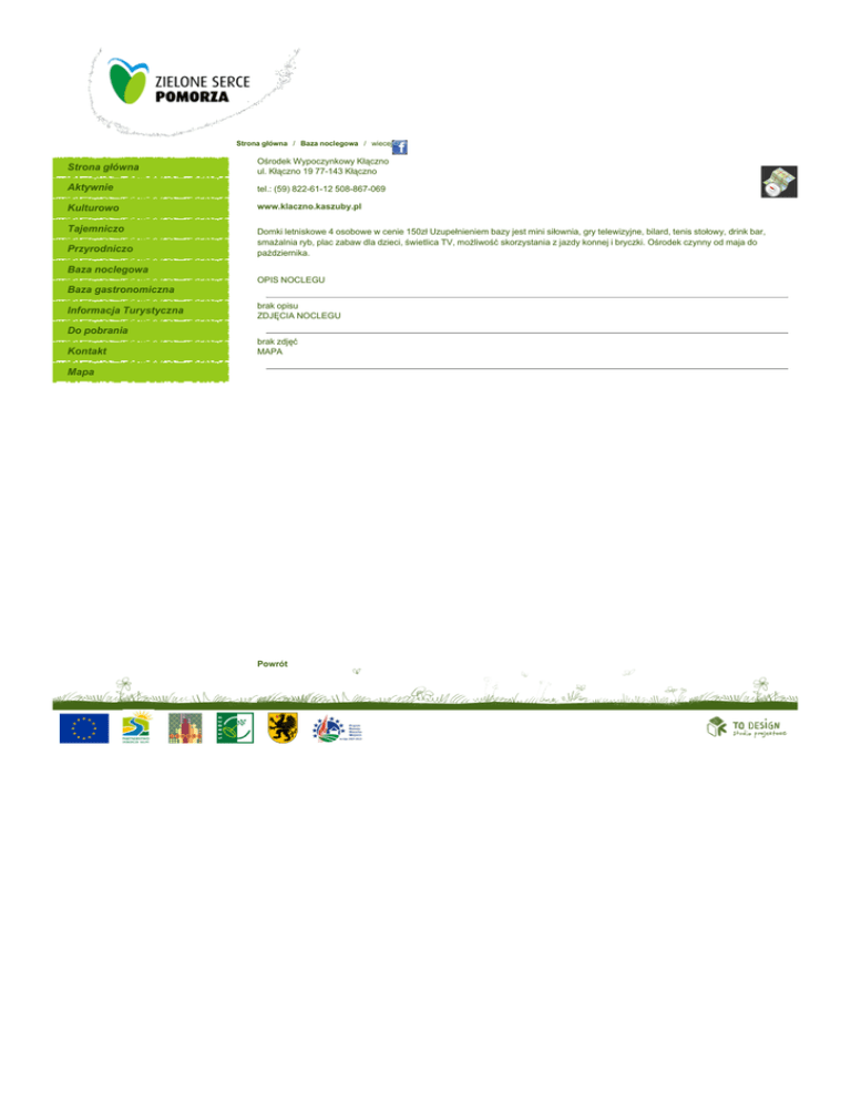 Strona główna / Baza noclegowa / wiecej Strona główna Ośrodek Wypoczynkowy Kłączno ul. Kłączno 19 77-143 Kłączno Aktywnie tel.: (59) 822-61-12 508-867-069 Kulturowo www.klaczno.kaszuby.pl Tajemniczo Domki letniskowe 4 osobowe w cenie 150zł Uzupełnieniem bazy jest mini siłownia, gry telewizyjne, bilard, tenis stołowy, drink bar, smażalnia ryb, plac zabaw dla dzieci, świetlica TV, możliwość skorzystania z jazdy konnej i bryczki. Ośrodek czynny od maja do października. Przyrodniczo Baza noclegowa OPIS NOCLEGU Baza gastronomiczna Informacja Turystyczna brak opisu ZDJĘCIA NOCLEGU Do pobrania Kontakt brak zdjęć MAPA Mapa Powrót