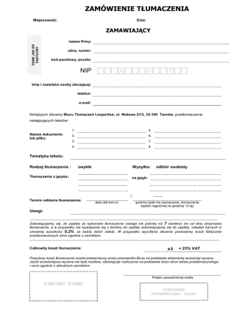 ZAMÓWIENIE TŁUMACZENIA Miejscowość: Dnia: ZAMAWIAJĄCY DANE JAK DO FAKTUYRY nazwa firmy: ulica, numer: kod pocztowy, poczta: NIP - - - imię i nazwisko osoby zlecającej: telefon: e-mail: Niniejszym zlecamy Biuru Tłumaczeń Lexpertise, ul. Wałowa 2/13, 33-100 Tarnów, przetłumaczenie następujących tekstów: Nazwa dokumentu lub pliku: 1. 5. 2. 6. 3. 7. 4. 8. Tematyka tekstu: Rodzaj tłumaczenia : zwykłe Wysyłka: Tłumaczenie z języka: Termin oddania tłumaczenia: odbiór osobisty na język: / data (dd-mm-rr) --godzina (jeśli nie zaznaczono, tłumaczenie będzie najpóźniej na godzinę 12-tą) Uwagi: Zobowiązujemy się, że zapłata za wykonane tłumaczenie nastąpi nie później niż 7 (siedem) dni od dnia otrzymania tłumaczenia, a w przypadku nie wywiązania się z terminu do zapłaty zobowiązujemy się do zapłaty, odsetek karnych w umownej wysokości 0,2% za każdy dzień zwłoki. W przypadku wycofania zlecenia poniesiemy koszt faktycznie przetłumaczonych stron zgodnie z cennikiem. Całkowity koszt tłumaczenia: zł + 23% VAT Powyższy koszt tłumaczenia został potwierdzony przez pracownika Biura na podstawie dokonanej wcześniej wyceny. Jeżeli wcześniejsza wycena nie była możliwa, obowiązuje rozliczenie na podstawie ilości stron tekstu przetłumaczonego i cena zgodnie z aktualnym cennikiem. Podpis upoważnionej osoby PIECZĘĆ FIRMY PIECZĄTKA UPOWAŻNIONEJ OSOBY
