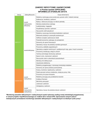 ZAWODY DEFICYTOWE I NADWYŻKOWE w Powiat opolski (OPOLSKIE) INFORMACJA SYGNALNA 2015 R. Sekcja Zaklasyfikowanie Grupa elementarna Robotnicy wykonujący prace proste przy uprawie roślin i hodowli zwierząt Kodowacze, korektorzy i pokrewni zawód maksymalnie deficytowy Rybacy i zbieracze pracujący na własne potrzeby Monterzy budownictwa wodnego Audiofonolodzy i logopedzi Klasyfikatorzy żywności i pokrewni Nauczyciele szkół specjalnych Robotnicy czyszczący konstrukcje budowlane i pokrewni Mistrzowie produkcji w przemyśle przetwórczym Szlifierze narzędzi i polerowacze metali Pozostali pracownicy zajmujący się sprzątaniem DEFICYT Kierownicy do spraw finansowych Operatorzy maszyn do produkcji wyrobów gumowych Pracownicy zakładów pogrzebowych zawód deficytowy Operatorzy urządzeń wiertniczych i wydobywczych ropy, gazu i innych surowców Pracownicy świadczący usługi na ulicach Technicy technologii chemicznej i pokrewni Dyżurni ruchu, manewrowi i pokrewni Nauczyciele sztuki w placówkach pozaszkolnych Monterzy linii elektrycznych Inżynierowie elektronicy Robotnicy przygotowujący i wznoszący konstrukcje metalowe Kierownicy do spraw produkcji przemysłowej Krawcy, kuśnierze, kapelusznicy i pokrewni Średni personel ochrony środowiska, medycyny pracy i bhp Pracownicy do spraw transportu zawód nadwyżkowy NADWYŻKA Robotnicy pracujący przy przeładunku towarów Analitycy finansowi Mechanicy precyzyjni Listonosze i pokrewni Introligatorzy i pokrewni zawód maksymalnie nadwyżkowy Operatorzy maszyn do produkcji obuwia i pokrewni *Monitoring zawodów deficytowych i nadwyżkowych został wykonany według nowej metodologii przygotowanej w ramach projektu współfinansowanego ze środków UE w ramach EFS „Opracowanie nowych zaleceń metodycznych prowadzenia monitoringu zawodów deficytowych i nadwyżkowych na lokalnym rynku pracy".