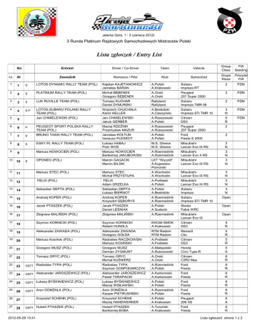 40 Rajd Świdnicki KRAUSE Jelenia Góra, 1 - 3 czerwca 2012r. 3 Runda Platinum Rajdowych Samochodowych Mistrzostw Polski Lista zgłoszeń / Entry List No Entrant Driver / Co-Driver Team Vehicle Group Class FIA Seeding Lp. Nr Zawodnik Kierowca / Pilot Klub Samochód Grupa Klasa Priorytet FIA 1 1 S LOTOS DYNAMIC RALLY TEAM (POL) Kajetan KAJETANOWICZ Jarosław BARAN A.Polski A.Krakowski Subaru Impreza RT 2 PZM 2 2 S PLATINUM RALLY TEAM (POL) Michał BĘBENEK Grzegorz BĘBENEK A.Orski A.Orski Peugeot 207 Super 2000 2 PZM 3 3 S LUK RUVILLE TEAM (POL) Tomasz KUCHAR Daniel DYMURSKI Rallyland Rallyland Subaru Impreza TMR 08 2 PZM 4 4 SP LOTOS-SUBARU POLAND RALLY TEAM (POL) Wojciech CHUCHAŁA Kamil HELLER A.Beskidzki A.Cieszyński Subaru Impreza STi TMR 10 3 N PZM 5 5 Jan CHMIELEWSKI (POL) Jan CHMIELEWSKI Jakub GERBER A.Rzeszowski A.Polski Citroen DS3 5 R PZM 6 6 P PEUGEOT SPORT POLSKA RALLY TEAM (POL) Maciej RZEŹNIK Przemysław MAZUR A.Rzeszowski A.Rzeszowski Peugeot 207 Super 2000 2 7 7 S BRUNO TASSI RALLY TEAM (POL) Jarosław KOŁTUN Ireneusz PLESKOT A.Polski A.Polski Ford Fiesta S 2000 2 8 8 S ESKY.PL RALLY TEAM (POL) Łukasz HABAJ Piotr WOŚ M.S. Gliwice M.S. Gliwice Mitsubishi Lancer Evo IX RS 3 N 9 9 Mariusz NOWOCIEŃ (POL) Mariusz NOWOCIEŃ Bartłomiej JAKUBOWSKI A.Rzemieślnik A.Rzemieślnik Mitsubishi Lancer Evo X RS 3 N 10 10 OPONEO (POL) Marcin GAGACKI Marcin BILSKI LKT "Wyczół" A.KujawskoPomorski Mitsubishi Lancer Evo IX RS 3 N 11 11 Mariusz STEC (POL) Mariusz STEC Michał PRZYSTUPA A.Wschodni A.Wschodni Mitsubishi Lancer Evo IX RS 3 N 12 12 FELIX (POL) FELIX Adam GRZELKA A.Podlaski A.Polski Mitsubishi Lancer Evo IX RS 3 N 13 14 Sebastian DEPTA (POL) Sebastian DEPTA Łukasz BIERNOT A.Polski A.Beskidzki Subaru Impreza 3 N 14 15 Andrzej KOPER (POL) Andrzej KOPER Krzysztof GĘBORYS A.Rzemieślnik A.Rzemieślnik Subaru Impreza STi TMR 10 Open 15 16 Jacek PTASZEK (POL) Jacek PTASZEK Daniel LEŚNIAK A.Polski A.Sudecki Skoda Fabia WRC Open 16 17 Zbigniew MALIŃSKI (POL) Zbigniew MALIŃSKI A.Rzemieślnik Mitsubishi Lancer Evo IX Open 17 18 Szymon KORNICKI (POL) Szymon KORNICKI Robert HUNDLA KKCiM SMOK A.Krakowski Citroen DS3 5 R 18 19 Aleksander ZAWADA (POL) Aleksander ZAWADA Grzegorz GOŁDA RTM Radom RTM Radom Renault Clio 5 R 19 20 Mariusz Kosiński (POL) Radosław RACZKOWSKI Mariusz KOSIŃSKI A.Podlaski A.Podlaski Citroen DS3 5 R 20 21 Grzegorz MUSZ (POL) Grzegorz MUSZ Damian ZYGMUNT A.Małopolski A.Rzeszowski Honda Civic Type-R 5 A 21 22 Tomasz GRYC (POL) Tomasz GRYC Michał KUŚNIERZ A.Orski A.Orski Citroen C2R2 Max 6 R 22 23 CEFT Radosław TYPA (POL) Radosław TYPA Szymon GOSPODARCZYK A.Rzemieślnik A.Polski Ford Fiesta 6 R 23 24 CEFT Aleksander JAROSZEWICZ (POL) Aleksander JAROSZEWICZ Paweł TARAPACKI A.Karkonoski A.Karkonoski Ford Fiesta 6 R 24 25 CEFT Łukasz BYŚKINIEWICZ (POL) Łukasz BYŚKINIEWICZ Maciej WISŁAWSKI A.Polski A.Polski Ford Fiesta 6 R 25 26 CEFT Aron DOMŻAŁA (POL) Aron DOMŻAŁA Kacper PIETRUSIŃSKI A.Rzemieślnik A.Polski Ford Fiesta 6 R 26 27 Krzysztof SCHENK (POL) Krzysztof SCHENK Maciej HANDWERKER A.Polski A.Krakowski Peugeot 206 XS 6 A 27 28 Hubert PTASZEK (POL) Hubert PTASZEK Bartłomiej BOBA A.Toruński A.Krakowski Ford Fiesta 6 R S CEFT 2012-05-29 13:41 Lista zgłoszeń strona 1 z 2 No Entrant Driver / Co-Driver Team Vehicle Group Class FIA Seeding Lp. Nr Zawodnik Kierowca / Pilot Klub Samochód Grupa Klasa Priorytet FIA 28 29 29 30 30 Tomasz ŻEREBECKI (POL) Tomasz ŻEREBECKI Michał GRUDZIŃSKI AZK Kłodzko A.Kielecki Citroen C2 R2 6 R CEFT Jerzy TOMASZCZYK (POL) Jerzy TOMASZCZYK Kamil KOZDROŃ A.Cieszyński A.Galicyjski Ford Fiesta 6 R 31 CEFT Marcin NIVETTE (POL) Marcin NIVETTE Wojciech BREJLAK A.Rzemieślnik A.Polski Ford Fiesta 6 R 31 32 CEFT Filip NIVETTE (POL) Filip NIVETTE Artur NATKANIEC A.Rzemieślnik A.Krakowski Ford Fiesta 6 R 32 33 Martyna Zarębska (POL) Michał KOCHANOWSKI LAREN Martyna ZARĘBSKA A.Centrum A.Rzemieślnik Renault Twingo 6 R 33 34 HERBI (POL) HERBI Bartosz HOLDENMAYER A.Leszczyński A.Leszczyński Honda Civic Type-R 8 N 34 35 Dawid DOBRODZIEJ (POL) Dawid DOBRODZIEJ Łukasz WŁOCH A.Polski A.Karkonoski Honda Civic 8 N 35 36 Marcin BERLIŃSKI (POL) Marcin BERLIŃSKI Michał BOJAR A.Polski A.Lubelski Sport Peugeot 206 RC 8 N 36 37 Piotr WITKOWSKI (POL) Piotr WITKOWSKI Jerzy MUSKALSKI A.Częstochowski Honda A.Częstochowski Civic 8 N 37 38 Mirosław WŁODARCZYK (POL) Mirosław WŁODARCZYK A.Galicyjski Renault Clio Ragnotti 8 N 38 39 Piotr LIP (POL) Piotr LIP Marcin CELIŃSKI A.Polski A.Centrum Honda Civic Type-R 8 N 39 40 Jacek POLOK (POL) Jacek POLOK Mateusz FORTUNA A.Ziemi Tyskiej A.Rzeszowski Honda Civic 8 N 40 41 Arkadiusz URBANOWICZ (POL) Arkadiusz URBANOWICZ Adam JAROS A.Karkonoski A.Karkonoski BMW M3 HR 41 42 OC Marcin GÓRNY (POL) Marcin GÓRNY Marcin ROIK A.Beskidzki A.Beskidzki Opel Astra HR 42 43 OC Paweł WINCZASZEK (POL) Paweł WINCZASZEK Paweł SKRZYWAN A.Karkonoski A.Polski Opel Astra HR 43 44 OC Łukasz RYZNAR (POL) Łukasz RYZNAR Leszek JANUSZ A.Karkonoski TKM Białystok Opel Kadett HR 44 45 OC Paweł KRYSIAK (POL) Paweł KRYSIAK Paweł GACEK AZK Kłodzko A.Beskidzki Opel Astra HR 45 46 Paweł HANKIEWICZ (POL) Paweł HANKIEWICZ Agnieszka HANKIEWICZ A.Rzemieślnik A.Rzemieślnik Renault Clio Williams HR 46 47 Artur GILEWSKI (POL) Artur GILEWSKI Maciej GILEWSKI AZK Kłodzko AZK Kłodzko Opel Corsa Gsi HR 47 48 Dariusz NOWICKI (POL) Dariusz NOWICKI Łukasz BUŁAT A.Dolny Śląsk A.Karkonoski FSO 125 P HR 48 49 Antoni MALINOWSKI (POL) Antoni MALINOWSKI Bartosz SAJDAK A.Centrum A.Zamkowy Peugeot 106 HR 49 50 Łukasz LEWANDOWSKI (POL) Łukasz LEWANDOWSKI Wojciech SKIBA A.Rzemieślnik A.Orski Opel Astra Gsi HR 50 51 Witold ZIMNY (POL) Witold ZIMNY Szczepan MIREK A.Rzeszowski A.Rzeszowski Renault Clio 16S HR OC OC Dyrektor Rajdu Marek Kisiel 2012-05-29 13:41 Lista zgłoszeń strona 2 z 2