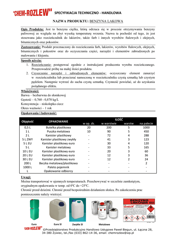SPECYFIKACJA TECHNICZNO - HANDLOWA NAZWA PRODUKTU: BENZYNA LAKOWA Opis Produktu: Jest to benzyna ciężka, którą odrzuca się w procesie otrzymywania benzyny paliwowej ze względu na zbyt wysoką temperaturę wrzenia. Nazwa ta pochodzi od tego, że jest stosowana jako rozcieńczalnik do lakierów, także farb i innych wyrobów ftalowych i olejnych, bitumicznych oraz pokostów. Zastosowanie: Produkt przeznaczony do rozcieńczania farb, lakierów, wyrobów ftalowych, olejnych, bitumicznych i pokostów oraz do oczyszczania części, narzędzi i elementów zabrudzonych po malowaniu i klejeniu. Sposób użycia: 1. Rozcieńczanie: postępować zgodnie z instrukcjami producenta wyrobu rozcieńczanego. Przeprowadzić próbę na małej ilości produktu. 2. Czyszczenie narzędzi i zabrudzonych elementów: oczyszczany element zanurzyć w rozcieńczalniku lub przecierać namoczoną w rozcieńczalniku czystą szmatką lub czystym pędzlem. Następnie wytrzeć do sucha czystą szmatką. Czynność powielać, aż do uzyskania pożądanego efektu. Właściwości: Barwa – bezbarwna do słomkowej Gęstość – 0,760 - 0,870 kg/L Konsystencja – niskolepka ciecz Okres ważności – 1 rok Opakowania i ładowność: Objętość OPAKOWANIE 0,5 L 1L 2L 5 L ZWY 5 L EU 5L 10 L EU 20 L EU 30 L EU 200 L 1000 L L Butelka plastikowa Puszka metalowa Kanister plastikowy Kanister plastikowy zwykły Kanister plastikowy euro Kanister metalowy Kanister plastikowy euro Kanister plastikowy euro Kanister plastikowy euro Beczka metalowa/plastikowa Paleto pojemnik Opakowanie odbiorcy w op. zb. 20 10 - ILOŚĆ w warstwie warstw 200 5 90 5 72 4 41 3 30 4 33 5 20 3 12 3 12 2 - na palecie 1000 450 288 123 120 165 60 36 24 2 - Uwagi: Można transportować w ujemnych temperaturach. Przechowywać w szczelnie zamkniętym, oryginalnym opakowaniu w temp. od 0ºC do +25ºC. Chronić przed dziećmi. Chronić przed bezpośrednim działaniem słońca. Po zakończeniu prac pomieszczenie należy wietrzyć. Euro Euro 5l Zwykłe 5l Metalowe ©Przedsiębiorstwo Produkcyjno Handlowo Usługowe Paweł Biegun, ul. Łączna 28, 34-380 Żywiec, tel./fax (033) 862-14-36, email: [email protected]