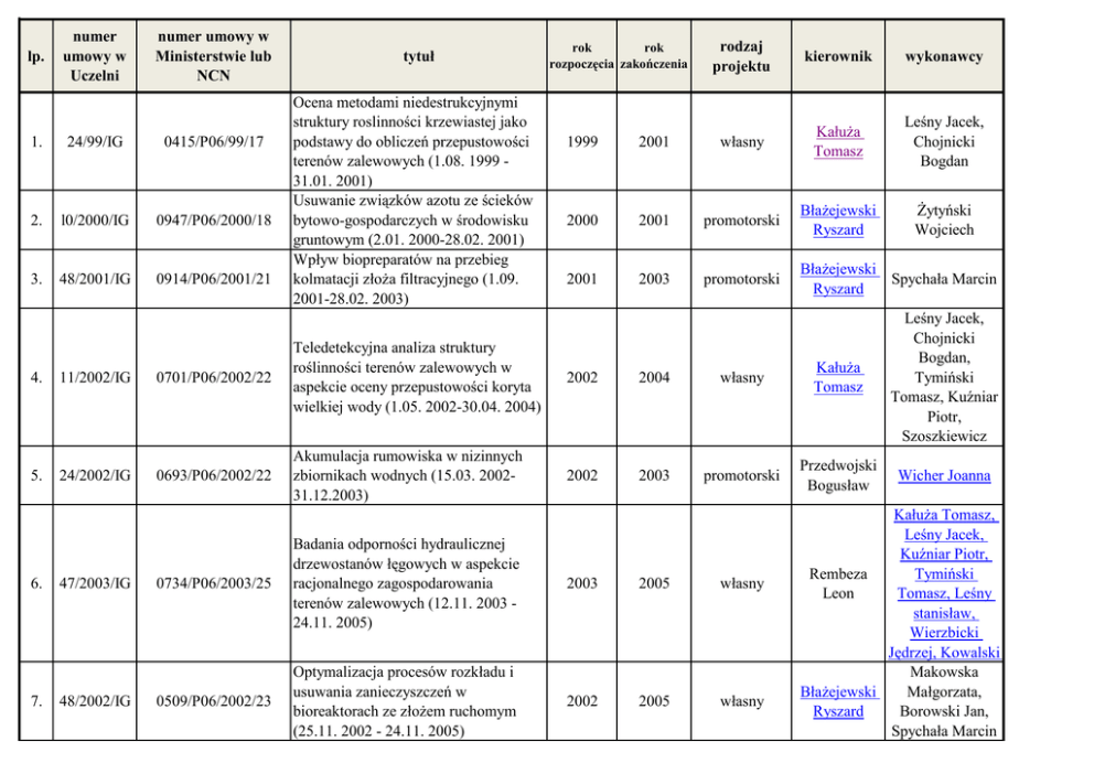 lp. numer umowy w Uczelni numer umowy w Ministerstwie lub NCN 1. 24/99/IG 0415/P06/99/17 2. l0/2000/IG 0947/P06/2000/18 3. 48/2001/IG 0914/P06/2001/21 4. 5. 6. 7. 11/2002/IG 24/2002/IG 47/2003/IG 48/2002/IG tytuł Ocena metodami niedestrukcyjnymi struktury roslinności krzewiastej jako podstawy do obliczeń przepustowości terenów zalewowych (1.08. 1999 31.01. 2001) Usuwanie związków azotu ze ścieków bytowo-gospodarczych w środowisku gruntowym (2.01. 2000-28.02. 2001) Wpływ biopreparatów na przebieg kolmatacji złoża filtracyjnego (1.09. 2001-28.02. 2003) rok rok rozpoczęcia zakończenia rodzaj projektu kierownik wykonawcy Leśny Jacek, Chojnicki Bogdan Żytyński Wojciech 1999 2001 własny Kałuża Tomasz 2000 2001 promotorski Błażejewski Ryszard 2001 2003 promotorski Błażejewski Spychała Marcin Ryszard 0701/P06/2002/22 Teledetekcyjna analiza struktury roślinności terenów zalewowych w aspekcie oceny przepustowości koryta wielkiej wody (1.05. 2002-30.04. 2004) 2002 2004 własny Kałuża Tomasz Leśny Jacek, Chojnicki Bogdan, Tymiński Tomasz, Kuźniar Piotr, Szoszkiewicz 0693/P06/2002/22 Akumulacja rumowiska w nizinnych zbiornikach wodnych (15.03. 200231.12.2003) 2002 2003 promotorski Przedwojski Bogusław Wicher Joanna 0734/P06/2003/25 Badania odporności hydraulicznej drzewostanów łęgowych w aspekcie racjonalnego zagospodarowania terenów zalewowych (12.11. 2003 24.11. 2005) 2003 2005 własny 0509/P06/2002/23 Optymalizacja procesów rozkładu i usuwania zanieczyszczeń w bioreaktorach ze złożem ruchomym (25.11. 2002 - 24.11. 2005) 2002 2005 własny Kałuża Tomasz, Leśny Jacek, Kuźniar Piotr, Rembeza Tymiński Leon Tomasz, Leśny stanisław, Wierzbicki Jędrzej, Kowalski Makowska Błażejewski Małgorzata, Ryszard Borowski Jan, Spychała Marcin 8. 37/2004/IG 0892/P06/2004/27 9. 38/2004/IG 0891/P06/2004/27 10. 9/62/WI/04 11. 14/2006/IG 0801/P01/2006/30 12.6/62/WI/06/AE 13. 38/2006/IG 14. 46/2006/IG 3288/P01/2006/31 3402/H03/2006/31 Optymalizacja techniczno-ekonomiczna kanalizacji na terenach wiejskich z wykorzystaniem systemu informacji przestrzennej (14.10. 2004 - 13.04. 2006) Analiza układu poziomego i topografii dna naturalnych koryt rzecznych (30.08. 2004 - 28.02. 2006) Wykorzystanie dżdżownic do bioremediacji i przeciwdziałania kolmatacji filtrów gruntowych oczyszczających ścieki bytowe oraz ocena ryzyka środowiskowego stwarzanego przez powstające odcieki przy użyciu testów skotoksykologicznych (1.09. 200410.09. 2005) Analiza wpływu czynników morfodynamicznych i wegetacyjnych na kształtowanie warunków hydraulicznych w cofkowej części nizinnych zbiorników wodnych (5.05. Zakres inwentaryzacji przyrodniczej na potrzeby zarządzania środowiskowego i planowania przestrzennego w gminie (31.03. 2006-31.12. 2006) Metody oceny przyatności gruntów do podziemnego rozsączania wód zanieczyszczonych (4.10. 2006-3.06. 2007) Oczyszczanie ścieków bytowych w bioreaktorze włókninowym (13.11. 2006 - 12.11. 2008) 2004 2006 promotorski Błażejewski Ryszard Matz Radosław 2004 2006 promotorski Przedwojski Boguslaw Wierzbicki Michał 2004 2005 interdyscyplinarny własny Spychała Marcin Przedwojski Boguslaw 2006 2008 2006 2006 interdyscyplinarny Spychała Marcin 2006 2007 Rembeza Leon 2006 2008 promotorski własny Dysarz T., Wicher -Dysarz Joanna, Kałuża Tomasz, Wierzbicki Nieć Jakub Makowska Błażejewski Małgorzata, Ryszard Spychała Marcin, Jackowiak Hanna 15. 17/2007/GW 16. 53/2009/GP 2740/P01/2007/32 Zastosowanie zdjęć LIDAR-owych do oceny gęstości zakrzaczeń, w aspekcie oceny szorstkości terenów zalewowych (14.05. 2007-13.11. 2009) Prognozowanie zmian erozyjnych dna 2084/B/P01/2009/37 koryta poniżej budowli piętrzących (19.10. 2009-7.09. 2011) Badania bakterioplanktonu metodą mikroskopową i hodowlana w 17. 51200073 z Uniwersytetem sezonowym aspekcie jakości wód i ich przepływu. Ocena metod badawczych na przykładzie wód rzeki Warty (2009) Badania i modelowanie procesów zachodzących podczas oczyszczania 18. 22/2010/GP 3714/B/P01/2010/38 ścieków bytowych w osadniku gnilnym (13.04. 2010 - 30.09. 2011) Badania i modelowanie przepływów ścieków i powietrza w kanalizacji 19. 30/2010/GW 5654/B/T02/2010/38 podciśnieniowej (16.04. 2010 - 15.04. 2012) 20 11/862/WI/10 21 8/2011/GW 2007 Hammerling Mateusz 2009 Michałkiewicz WasielewskaMichał, 2009 interdyscyplinarny Szeląg Dysarz Tomasz, Elżbieta Joniak Tomasz 2010 2011 promotorski Błażejewski Ryszard Pawlak Maciej 2010 2012 własny Matz Radosław Błażejewski Ryszard Modelowanie i analiza działania wstępnej części osadowej w małych 2967/B/P01/2011/40 nizinnych zbiornikach wodnych (10.05. 2011 - 9.01. 2014) 2011 22 9/2011/GW 3167/B/P01/2011/40 promotorski Przedwojski Bogusław / Błażejewski Ryszard 2011 2010 Modelowanie procesów oczyszczania ścieków w gruncie (17.05. 2011 r. do 9.07. 2013) własny Mokwa Marian, Leśny Jacek, Tymiński Tomasz 2009 Wpływ miasta Poznania na jakość wód rzeki Warty (4.05. 2010 r. - 30.11. 2010 r.) z Politechniką Poznańską 2009 Kałuża Tomasz 2011 SzelągWasielewska Michałowicz Elżbieta, 2010 interdyscyplinarny Michał Dysarz Tomasz, Mądrecka Beata, Joniak Tomasz, Dysarz Tomasz WicherKałuża Tomasz 2014 własny Dysarz Sojka Mariusz Joanna Kanclerz Jolanta Siepak Marcin 2013 własny Rembeza Leon Nieć Jakub Spychała Marcin 23 29/2011/GP 7511/B/T02/2011/40 24 39/2011/GW 7515/B/T02/2011/40 Modelowanie systemu odciążonej kanalizacji małośrednicowej (13.05. 2011 r. do 12.11. 2012 r.) Rozpoznanie i modelowanie procesów zachodzących w filtrach włókninowych podczas oczyszczania ścieków byytowych (16.05. 2011 r. do 15.07. 2013 r.) Analiza zjawiska transportu i deponowania drobnego rumoszu 25 87/2011/GW UMO-2011/01/B/ST10/06959 roślinnego w obrębie koryta rzeki (19.12. 2011 r. do 18.12. 2014 r.) 2011 2011 2011 2012 2013 2014 promotorski Błażejewski Ryszard Nawrot Tadeusz własny Błażejewski Ryszard Spychała Marcin Ni