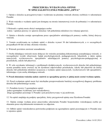 PROCEDURA WYDAWANIA OPINII W SPECJALISTYCZNEJ PORADNI „OPTA” 1. Opinie o dziecku są przygotowywane i wydawane na pisemny wniosek złożony osobiście w sekretariacie Poradni. 2. Wzór wniosku o wydanie opinii jest dostępny na stronie internetowej (wzór do pobrania) i w sekretariacie Poradni. 3.Wniosek o opinię może złożyć następująca osoba: rodzic / opiekun prawny (w sprawie dziecka) lub pełnoletnia młodzież (we własnej sprawie). 4. Opinia o dziecku zostaje sporządzona przez specjalistów udzielających pomocy osobie, której dotyczy wniosek. 5. Termin oczekiwania na wydanie opinii o dziecku wynosi 30 dni kalendarzowych, a w szczególnych przypadkach 60 dni od daty złożenia wniosku. 6. Wniosek powinien zawierać uzasadnienie. 7. Osoba składająca wniosek może dołączyć do wniosku posiadaną dokumentację uzasadniającą wniosek, w szczególności wyniki obserwacji, badań psychologicznych, pedagogicznych, lekarskich, a także opinię nauczycieli, wychowawców, specjalistów udzielających pomocy psychologiczno-pedagogicznej w przedszkolu, szkole lub placówce. 8. W celu uzyskania informacji o problemach dydaktycznych, wychowawczych dziecka lub pełnoletniego ucznia poradnia może zwrócić się do dyrektora odpowiednio przedszkola, szkoły lub placówki do której dziecko lub pełnoletnia młodzież uczęszcza o wydanie opinii nauczycieli, wychowawców lub specjalistów, informując o tym osobę składającą wniosek. 9. Przed złożeniem wniosku należy omówić ze specjalistą sprawę w jakiej może zostać wydana opinia. 10. Przed wydaniem opinii może być niezbędne przeprowadzenie bardziej szczegółowej diagnozy problemu dziecka lub pełnoletniego ucznia. 11. Poradnia tworzy 2 egzemplarze opinii: jeden egzemplarz wydawany jest wnioskodawcy, drugi egzemplarz pozostaje w Poradni i jest przechowywany w jej archiwum. 12. Na opinii znajdują się podpisy specjalisty, który przygotował opinię oraz Dyrektora Poradni. 13. Opinia zostaje wydana przez pracownika sekretariatu Poradni bezpośrednio wnioskującej osobie po okazaniu przez nią dokumentu tożsamości ze zdjęciem. 14. Odbiór opinii wnioskodawca potwierdza podpisem na egzemplarzu opinii pozostającym w Poradni oraz w rejestrze opinii. Procedura z dnia 14.03.2014