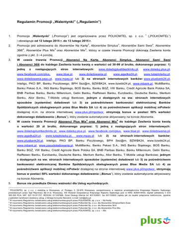 Regulamin Promocji „Walentynki” („Regulamin”) 1. Promocja „Walentynki” („Promocja”) jest organizowana przez POLKOMTEL sp. z o.o. 1 („POLKOMTEL”) i obowiązuje od 12 lutego 2015 r. do 13 lutego 2015 r. 2. 2 3 3 Promocja jest adresowana do Abonentów Na Kartę , Abonentów Simplus , Abonentów Sami Swoi , Abonentów 4 5 6 36i6 , Abonentów Plus Mix oraz Abonentów Mix , którzy w czasie trwania Promocji dokonają Zasilenia konta zgodnie z pkt. 3 i 4 poniżej. 3. W czasie trwania Promocji Abonenci Na Kartę, Abonenci Simplus, Abonenci Sami Swoi i Abonenci 36i6 do każdego Zasilenia konta kwotą o wartości od 30-99 zł brutto, dokonanego poprzez: 1) jedną z następujących www.facebook.com/plus, stron internetowych: www.blue.pl, www.doladujplushbezlimitu.pl, www.doladowania.pl, www.agadka24.pl, www.doladuj.plus.pl, www.tutajdoladuj.pl, www.doladowania.payu.pl, www.mpay.pl lub 2) na stronach internetowych banków: www.plusbank24.pl, Inteligo, PKO BP, Banku Pocztowego, BPH Sez@m, BZWBK24, www.bzwbk24.pl, www.mbank.pl, MultiBanku, Banku Pekao S.A., ING Banku Śląskiego, BOŚ Banku, Banku BGŻ, VW Banku, Credit Agricole Bank Polska SA, BNB Paribas Banku, Banku Millennium, Getin Banku, Raiffeisen Banku, Eurobanku, Deutsche Banku, Meritum Banku, Alior Banku, T-Mobile usługi Bankowe, jednym z dostępnych na ww. stronach internetowych sposobów (systemów) doładowań lub 3) za pośrednictwem bankowości elektronicznej Banków Spółdzielczych obsługiwanych przez Blue Media SA lub 4) za pośrednictwem aplikacji mobilnej mPotwór dostępnej m.in. na stronie internetowej www.plus.pl/mpotwor, otrzymają bonus w postaci 50% wartości dokonanego doładowania („Bonus”), który zostanie automatycznie aktywowany na koncie Abonenta. 4. 5 6 W czasie trwania Promocji Abonenci Plus Mix oraz Abonenci Mix do każdego Zasilenia konta kwotą o wartości 20 zł brutto, dokonanego poprzez: 1) jedną z następujących stron internetowych: www.doladujplushbezlimitu.pl, www.doladuj.plus.pl, www.facebook.com/plus, www.blue.pl, www.doladowania.pl, www.agadka24.pl, www.tutajdoladuj.pl, www.mpay.pl lub 2) na stronach internetowych banków: www.plusbank24.pl, Inteligo, PKO BP, Banku Pocztowego, BPH Sez@m, BZWBK24, www.bzwbk24.pl, www.mbank.pl, www.payudoladowania.pl, MultiBanku, Banku Pekao S.A., ING Banku Śląskiego, BOŚ Banku, Banku BGŻ, VW Banku, Credit Agricole Bank Polska SA, BNB Paribas Banku, Banku Millennium, Getin Banku, Raiffeisen Banku, Eurobanku, Deutsche Banku, Meritum Banku, Alior Banku, T-Mobile usługi Bankowe; jednym z dostępnych na ww. stronach internetowych sposobów (systemów) doładowań lub 3) za pośrednictwem bankowości elektronicznej Banków Spółdzielczych obsługiwanych przez Blue Media SA lub 4) za pośrednictwem aplikacji mobilnej mPotwór dostępnej na stronie internetowej www.plus.pl/mpotwor, otrzymają bonus w postaci 50% wartości dokonanego doładowania („Bonus”), który zostanie automatycznie aktywowany na koncie Abonenta. 5. 1 Bonus nie przedłuża Okresu ważności dla Usług wychodzących. POLKOMTEL sp. z o.o. z siedzibą w Warszawie, ul. Postępu 3, 02-676 Warszawa, zarejestrowana w rejestrze przedsiębiorców Krajowego Rejestru Sądowego prowadzonym przez Sąd Rejonowy dla m.st. Warszawy, XIII Wydział Gospodarczy Krajowego Rejestru Sądowego pod nr KRS: 0000419430, kapitał zakładowy 3 510 300 000 PLN, NIP: 527-10-37-727, REGON: 011307968, Dział Obsługi Klienta tel. 601102601, fax 601102602 (opłaty jak za zwykłe połączenie telefoniczne, zgodnie z pakietem taryfowym dostawcy usług, z którego korzysta Abonent), e-mail: [email protected]. 2 W rozumieniu Regulaminu świadczenia usług telekomunikacyjnych przez POLKOMTEL sp. z o.o. – Na Kartę. 3 W rozumieniu Regulaminu świadczenia usług telekomunikacyjnych przez Polkomtel Sp. z o.o. dla Abonentów Simplus/Sami Swoi. 4 W rozumieniu Regulaminu świadczenia usług telekomunikacyjnych przez Polkomtel Sp. z o.o. dla Abonentów 36.6. 5 W rozumieniu Regulaminu świadczenia usług telekomunikacyjnych przez Polkomtel Sp. z o.o. dla Abonentów Plus Mix. 6 W rozumieniu Regulaminu świadczenia usług telekomunikacyjnych przez POLKOMTEL sp. z o.o. – Mix. 6. Bonus może być wykorzystany na wszystkie usługi telekomunikacyjne dostępne dla danego Abonenta określonego w pkt. 2 Regulaminu zgodnie z taryfą, z której korzysta. 7. W kwestiach nieuregulowanych Regulaminem zastosowanie mają odpowiednio postanowienia Regulaminu świadczenia usług telekomunikacyjnych przez POLKOMTEL Sp. z o.o. dla Abonentów Simplus/Sami Swoi (dla Umów zawartych przed 25.12.2014r.), Regulaminu świadczenia usług telekomunikacyjnych przez POLKOMTEL Sp. z o.o. dla Abonentów 36.6 (dla Umów zawartych przed 25.12.2014r.), Regulaminu świadczenia usług telekomunikacyjnych przez POLKOMTEL sp. z o.o. – Na Kartę (dla Umów zawartych od 25.12.2014 r.), Regulaminu świadczenia usług telekomunikacyjnych przez POLKOMTEL Sp. z o.o. dla Abonentów Plus Mix (dla Umów zawartych przed 25.12.2014 r.) lub Regulaminu świadczenia usług telekomunikacyjnych przez POLKOMTEL sp. z o.o. – Mix (dla Umów zawartych przed 25.12.2014 r.), o ile Regulamin nie stanowi inaczej. 8. POLKOMTEL może zakończyć świadczenie usług w ramach aktywowanej Promocji lub dokonać zmiany warunków Promocji na podstawie wypowiedzenia dokonanego na 30 dni przed zakończeniem Promocji lub wejściem w życie nowych warunków Promocji. Wypowiedzenie nastąpi SMS-em wysłanym na numer telefonu Abonenta, który skorzystał z Promocji. 9. Informacja o odwołaniu Promocji zostanie podana przez Polkomtel do wiadomości publicznej na stronie internetowej www.plus.pl oraz na stronach internetowych www.doladuj.plus.pl, www.facebook.com/plus. 10. Regulamin dostępny jest na stronach internetowych, www.plus.pl, www.facebook.com/plus, w siedzibie POLKOMTEL oraz w Punktach Sprzedaży i Salonach Firmowych sieci Plus.