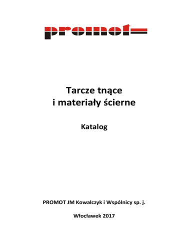Tarcze tnące i materiały ścierne Katalog PROMOT JM Kowalczyk i Wspólnicy sp. j. Włocławek 2017 PROMOT JM Kowalczyk i Wspólnicy sp. j. to Firma z ponad dwudziestoletnim doświadczeniem w produkcji i sprzedaży szczotek węglowych. Nasza oferta skierowana jest do firm zajmujących się remontem i konserwacją elektrycznych maszyn wirujących, jak i również do warsztatów mechaniki lub elektromechaniki pojazdowej oraz firm handlowych świadczących usługi dla rynku motoryzacyjnego. W naszej ofercie dla branży motoryzacyjnej znajdziecie Państwo następujący asortyment: - szczotki węglowe do wózków transportowych, wind i wyciągarek samochodowych oraz suwnic - szczotki węglowe do alternatorów i rozruszników - szczotkotrzymacze do rozruszników oraz regulatory napięcia do alternatorów - szczotki do wentylatorów, nagrzewnic i małych silników 6/12/24V, - zestawy naprawcze układów hamulcowych, - tulejki ślizgowe i łożyska toczne do wentylatorów, nagrzewnic, rozruszników oraz alternatorów - złącza elektryczne, - chemia techniczna – oleje, smary, pasty do docierania zaworów - kleje, silikony i inne preparaty marki Technicqll, - tarcze i materiały ścierne, Firma PROMOT ma ugruntowaną pozycję na rynku w produkcji szczotek węglowych do różnych maszyn elektrycznych, w tym elektronarzędzi i sprzętu AGD oraz dystrybucji innych części zamiennych do tych urządzeń. Ofertę tych wyrobów obejmują następujące katalogi: - szczotki węglowe do elektronarzędzi oraz AGD - uchwyty wiertarskie do elektronarzędzi, - koła zębate do elektronarzędzi - łożyska do elektronarzędzi, - wyłączniki do elektronarzędzi, - komutatory do elektronarzędzi, - kondensatory do elektronarzędzi, - przewody i odgiętki do elektronarzędzi, - paski napędowe do elektronarzędzi, - wirniki i inne części do elektronarzędzi, Jesteśmy Przedstawicielem Handlowym słowackich firm Elektrokarbon Topol'cany a.s. i Kompozitum s.r.o. specjalizujących się w produkcji wyrobów węglowo-grafitowych, takich jaki pierścienie uszczelniające, łożyska ślizgowe, łopatki do pomp i kompresorów, kokile, tygle, rotory. Oferujemy także inne produkty grafitowe wykonywane ściśle na zamówienie na podstawie rysunku technicznego lub dosłanego wzoru. Dysponujemy szeregiem gatunków materiałów węglowo-grafitowych i metalo-grafitowych, z których konkretny typ dobieramy dla wymaganych przez klienta parametrów. W przypadku zainteresowania innymi naszymi produktami, prosimy o kontakt – doślemy odpowiednią ofertę. Zapraszamy do współpracy. dr inż. Jan Mieczysław Kowalczyk oraz zespół PROMOT str. 2 www.szczotkiweglowe.pl KONTAKT: PROMOT JM Kowalczyk i Wspólnicy spółka jawna ul. Metalowa 9 87-800 Włocławek tel. +48 54 235 55 00 fax. +48 54 235 46 06 e-mail: [email protected] PRZEDSTAWICIEL HANDLOWY: Piotr Jezierski tel. kom. +48 506 069 378 tel. +48 54 235 55 00 wew. 3 e-mail: [email protected] Łukasz Masłowski tel. kom. +48 516 278 504 tel. +48 54 235 55 00 wew. 4 e-mail: [email protected] Agnieszka Różycka tel. kom. +48 506 069 408 tel. +48 54 235 26 31 e-mail: [email protected] Monika Skierkowska tel. kom. +48 505 430 929 tel. +48 54 235 26 31 e-mail: [email protected] Marian Majewski tel. kom. +48 506 069 377 tel. +48 54 235 26 31 e-mail: [email protected] Uwaga: Nazwy marek i numery katalogowe części służą tylko do identyfikacji. Opracowanie: Ł. Masłowski, P. Jezierski Data aktualizacji: 09 styczeń 2017 r. www.szczotkiweglowe.pl str. 3 Rozmiar TM-01 115x1,6x22,23 Tarcza do cięcia metalu Obroty: 13300 rpm 25 szt. TM-02 180x2,0x22,23 Tarcza do cięcia metalu Obroty: 8500 rpm 10 szt. TM-03 230x2,5x22,23 Tarcza do cięcia metalu Obroty: 6640 rpm 10 szt. TM-04 230x3,0x22,23 Tarcza do ciecia metalu Obroty: 6640 rpm 10 szt. TM-05 180x1,6x22,23 Tarcza do cięcia metalu Obroty: 8500 rpm 10 szt. TM-06 125x2,5x22,23 Tarcza do ciecia metalu Obroty: 12200 rpm 25 szt. TD-01 115x22,2 Tarcza diamentowa pełna ceramika, glazura, gres, dachówka. Obroty: 13280 rpm. 5 szt. TD-02 125x22,2 Tarcza diamentowa pełna ceramika, glazura, gres, dachówka. Obroty: 12200 rpm 5 szt. 115x22,2 Tarcza diamentowa segmentowa beton, cegła ceramiczna, kostka brukowa, płyty chodnikowe i tarasowe. Obroty: 13280 rpm 5 szt. 125x22,2 Tarcza diamentowa segmentowa beton, cegła ceramiczna, kostka brukowa, płyty chodnikowe i tarasowe. Obroty: 13280 rpm 5 szt. 180x22,2 Tarcza diamentowa segmentowa beton, cegła ceramiczna, kostka brukowa, płyty chodnikowe i tarasowe. Obroty 8600 rpm 5 szt. 115x22,2 Tarcza diamentowa turbo beton, beton zbrojony, cegła klinkierowa, kamień naturalny, konglomaryty, ceramika. Obroty: 13280 rpm 5 szt. TD-03 TD-04 TD-05 TD-06 str. 4 Opis/Uwagi Fotografia poglądowa Opakowanie zbiorcze Nr Jota www.szczotkiweglowe.pl Nr Jota Opis/Uwagi TD-07 125x22,2 Tarcza diamentowa turbo beton, beton zbrojony, cegła klinkierowa, kamień naturalny, konglomeraty, ceramika. Obroty: 12200 rpm 5 szt. TD-08 230x22,2 Tarcza diamentowa turbo ceramika, glazura, gres, dachówka. Obroty: 6600 rpm 5 szt. TD-09 180x22,2 Tarcza diamentowa turbo Plus beton, beton zbrojony, cegła ceramiczna, granit, marmur, kostka brukowa, ceramika. Obroty: 8600 rpm 5 szt. PS-01 125 mm P40 Papier na dysk 125mm P40 -Średnica papieru 125mm; -Granulacja papieru P40 50 szt. PS-02 125 mm P60 Papier na dysk 125mm P60 -Średnica papieru 125mm; -Granulacja papieru P60 50 szt. PS-03 125 mm P80 Papier na dysk 125mm P80 -Średnica papieru 125mm; -Granulacja papieru P80 50 szt. 75x457mm P24 Papier taśma 75 x 457mm P24 -Szerokość taśmy 75mm; -Długość taśmy 457mm; -Granulacja papieru P24, 10 szt. 75x457mm P36 Papier taśma 75 x 457mm P36 -Szerokość taśmy 75mm; -Długość taśmy 457mm; -Granulacja papieru P36, 10 szt. 75x457mm P40 Papier taśma 75 x 457mm P40 -Szerokość taśmy 75mm; -Długość taśmy 457mm; -Granulacja papieru P40, 10 szt. 75x457mm P60 Papier taśma 75 x 457mm P60 -Szerokość taśmy 75mm; -Długo