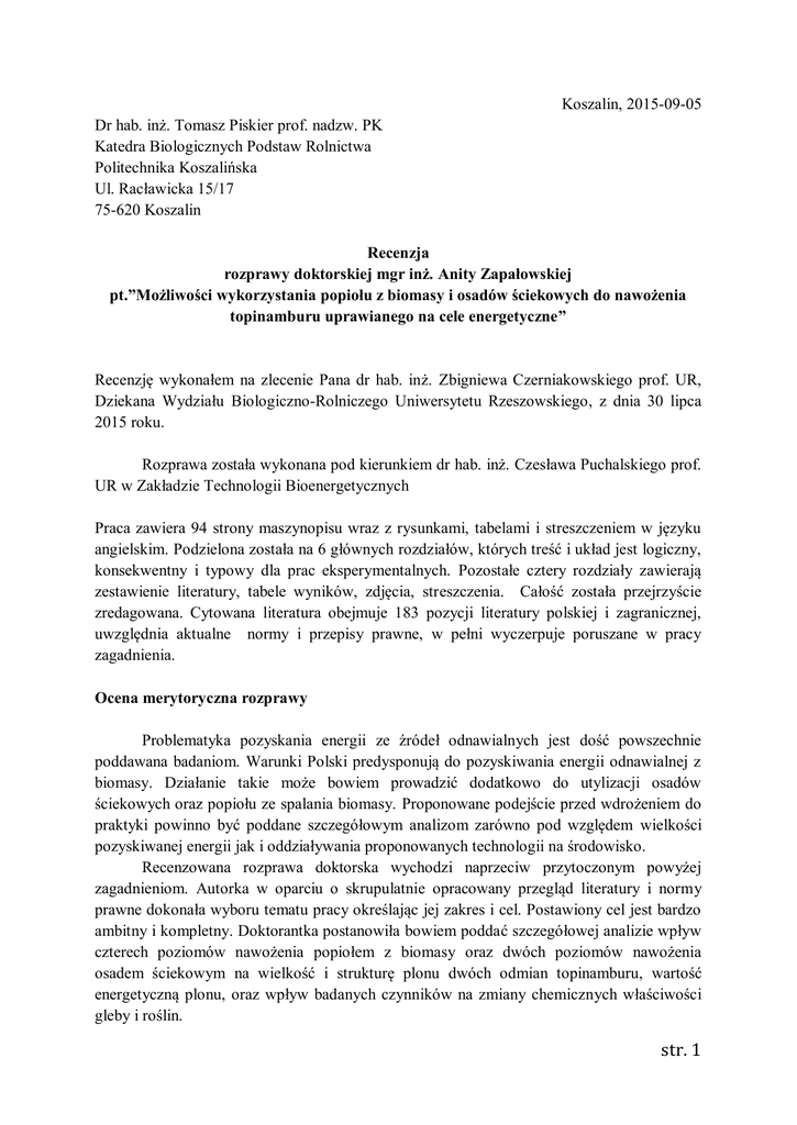 Koszalin, 2015-09-05 Dr hab. inż. Tomasz Piskier prof. nadzw. PK Katedra Biologicznych Podstaw Rolnictwa Politechnika Koszalińska Ul. Racławicka 15/17 75-620 Koszalin Recenzja rozprawy doktorskiej mgr inż. Anity Zapałowskiej pt.”Możliwości wykorzystania popiołu z biomasy i osadów ściekowych do nawożenia topinamburu uprawianego na cele energetyczne” Recenzję wykonałem na zlecenie Pana dr hab. inż. Zbigniewa Czerniakowskiego prof. UR, Dziekana Wydziału Biologiczno-Rolniczego Uniwersytetu Rzeszowskiego, z dnia 30 lipca 2015 roku. Rozprawa została wykonana pod kierunkiem dr hab. inż. Czesława Puchalskiego prof. UR w Zakładzie Technologii Bioenergetycznych Praca zawiera 94 strony maszynopisu wraz z rysunkami, tabelami i streszczeniem w języku angielskim. Podzielona została na 6 głównych rozdziałów, których treść i układ jest logiczny, konsekwentny i typowy dla prac eksperymentalnych. Pozostałe cztery rozdziały zawierają zestawienie literatury, tabele wyników, zdjęcia, streszczenia. Całość została przejrzyście zredagowana. Cytowana literatura obejmuje 183 pozycji literatury polskiej i zagranicznej, uwzględnia aktualne normy i przepisy prawne, w pełni wyczerpuje poruszane w pracy zagadnienia. Ocena merytoryczna rozprawy Problematyka pozyskania energii ze źródeł odnawialnych jest dość powszechnie poddawana badaniom. Warunki Polski predysponują do pozyskiwania energii odnawialnej z biomasy. Działanie takie może bowiem prowadzić dodatkowo do utylizacji osadów ściekowych oraz popiołu ze spalania biomasy. Proponowane podejście przed wdrożeniem do praktyki powinno być poddane szczegółowym analizom zarówno pod względem wielkości pozyskiwanej energii jak i oddziaływania proponowanych technologii na środowisko. Recenzowana rozprawa doktorska wychodzi naprzeciw przytoczonym powyżej zagadnieniom. Autorka w oparciu o skrupulatnie opracowany przegląd literatury i normy prawne dokonała wyboru tematu pracy określając jej zakres i cel. Postawiony cel jest bardzo ambitny i kompletny. Doktorantka postanowiła bowiem poddać szczegółowej analizie wpływ czterech poziomów nawożenia popiołem z biomasy oraz dwóch poziomów nawożenia osadem ściekowym na wielkość i strukturę plonu dwóch odmian topinamburu, wartość energetyczną plonu, oraz wpływ badanych czynników na zmiany chemicznych właściwości gleby i roślin. str. 1 Realizując założony zakres pracy doktorantka przeprowadziła w latach 2013 i 2014, trójczynnikowe doświadczenie polowe w układzie split plot – split block. Dobrany układ doświadczenia jest prawidłowy, umożliwiający rzetelną analizę uzyskanych wyników i występujących interakcji. Dokonała kompleksowych badań gleby przed założeniem doświadczenia i oceniła zmiany gleby po jego zakończeniu. Przeprowadzone analizy oraz ocena gleby wykonane zostały zgodnie z obowiązującymi normami. Wielkość dawek popiołu oraz osadu również ustalono w oparciu o obowiązujące normy. Podejście takie ma bardzo ważny aspekt praktyczny, zastosowane bowiem technologie mogą zostać bezpośrednio wykorzystane w praktyce. Pani mgr inż. Anita Zapałowska w zaproponowanej metodyce szczegółowo opisała procedury wykorzystane przy realizacji badań co zapewnia powtarzalność ich realizacji. Podała również warunki, w jakich wykonano badania określając ich lokalizację, warunki glebowe i klimatyczne. Pewien niedosyt budzi interpretacja warunków klimatycznych. Autorka opisuje je w odniesieniu do średniej z wielolecia. Moim zdaniem opis można było wykonać w oparciu o współczynnik hydrotermiczny Sielianinowa. Jest to bardzo prosta, a jednocześnie wystarczająco dokładna metoda umożliwiająca analizę warunków klimatycznych. Analiza i omówienie wyników opracowane jest prawidłowo. Jedynie w przypadku wielkości plonu biomasy uzyskiwanej w kolejnych latach można zastanawiać się nad interpretację wyników. Różnice mogą wynikać z wpływu badanych czynników, mogą również wynikać z samej biologii topinamburu, który jako roślina wieloletnia w pierwszym roku uprawy nie daje maksymalnego plonu biomasy. W oparciu o zgromadzony materiał nie można jednak negować uzyskanych wyników ani ich interpretacji (komplet wyników zamieszczono w tabelach na końcu pracy). Autorka określiła istotność różnic wynikających z zastosowanych kombinacji zarówno na poziomie badanych czynników jak i na poziomie interakcji. Bardzo ciekawe jest stwierdzenie braku interakcji w nawożeniu osadem i popiołem. Stwierdzenie takie rzuca nowe światło na powszechną opinię i skłania do dalszej szczegółowej analizy zagadnienia. Interpretacja uzyskanych wyników dotyczących składu chemicznego roślin oraz gleby, każdorazowo rozpatrywana jest przez autorkę w aspekcie norm. Podejście takie świadczy o jej dojrzałości i zachowaniu dbałości o środowisko, co w aspekcie odnawialnych źródeł energii jest szczególnie ważne. Praca nie zawiera syntezy wyników. W moim przekonaniu jest to poprawne podejście do problemu. Doświadczenie prowadzono dwa sezony wegetacyjne, a mając do czynienia z rośliną wieloletnią uzyskane wyniki syntezy mogłyby stanowić nadinterpretację analizowanych zagadnień. Uzyskane wyniki autorka poddała dyskusji wykorzystując w tym celu literaturę polską i zagraniczną oraz obowiązujące normy. Dobór źródeł i sposób przeprowadzenia dyskusji jest prawidłowy i rzetelny. Praca zakończona jest ośmioma wnioskami i podsumowaniem. Wnioski korespondują z założonym celem pracy i wynikają z przeprowadzonych badań. str. 2 Wniosek końcowy Rozprawa doktorska mgr inż. Anity Zapałowskiej, dotycząca możliwości wykorzystania popiołu z biomasy oraz osadów ściekowych do nawożenia topinamburu uprawianego na cele energetyczne w mojej opinii doskonale wpisuje się w aktualne trendy dot. odnawialnych źródeł energii i ochrony środowiska. Autorka poddała wnikliwej an