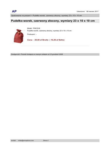 AP Utworzono : 08 marzec 2017 Opakowania na prezent > Pudełko-worek, czerwony złocony, wymiary 23 x 10 x 10 cm Pudełko-worek, czerwony złocony, wymiary 23 x 10 x 10 cm Model : PWCZ-M Pudełko-worek, czerwony złocony, wymiary 23 x 10 x 10 cm Producent : - Cena : 20,00 zł Brutto ( 16,26 zł Netto) Dostępność: Produkt dostępny w naszym sklepie od 23 grudzień 2008 kontakt : - [email protected] Strona 1