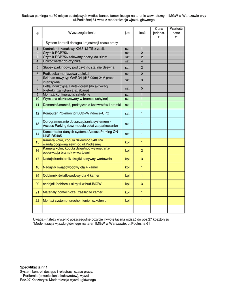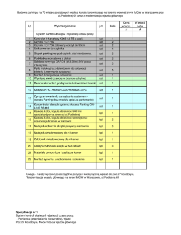 Budowa parkingu na 70 miejsc postojowych wzdłuz kanału tarowniczego na terenie wewnetrznym IMGW w Warszawie przy ul.Podleśnej 61 wraz z modernizacja wjazdu głównego Lp Wyszczególnienie j.m Ilość Cena jednost. zł System kontroli dostępu i rejestracji czasu pracy 1 2 3 4 Kontroler 4-kanałowy K965 12 TE z zasil. Czytnik RCP756 Czytnik RCP756 zalewany odczyt do 90cm Unikonwerter do czytnika szt szt szt szt 1 2 2 4 5 Słupek parkingowy pod czytnik, stal nierdzewna. szt 2 6 szt 2 szt 3 szt 5 9 10 Podkładka montażowa z pleksi Szlaban nowy typ GARD4 (dł.3,00m) 24V praca intensywna Pętla indukcyjna z detektorem (do aktywacji bileterki i zamykania szlabanu) Montaż, konfiguracja, szkolenie Wymiana elektrozawory w bramce uchylnej szt szt 1 1 11 Demontaż/montaż, podłączenie kołowrotów i bramki szt 1 12 Komputer PC+monitor LCD+Windows+UPC szt 1 13 Oprogramowanie do zarządzania systemem Access Parking (bez modułu opłat za parkowanie) szt 1 7 8 Koncentrator danych systemu Access Parking ONLINE RS485 Kamera kolor, kopuła dzień/noc 540 linii wandaloodporna zewn.od ul.Podleśnej Kamera kolor, kopuła dzień/noc wewnętrznaobserwacja bramek w wartowni szt 1 kpl 1 kpl 2 17 Nadajnik/odbiornik skrętki pasywny-wartownia kpl 3 18 Nadajnik światłowodowy dla 4 kamer kpl 1 19 Odbiornik światłowodowy dla 4 kamer kpl 1 20 nadajnik/odbiornik skrętki w bud.IMGW kpl 3 21 Materiały pomocnicze i zasilacze kamer kpl 1 22 Montaż systemu, uruchomienie i szkolenie kpl 1 14 15 16 Uwaga - należy wycenić poszczególne pozycje i kwotę łączną wpisać do poz.27 kosztorysu "Modernizacja wjazdu głównego na teren IMGW w Warszawie, ul.Podleśna 61 Specyfikacja nr 1 System kontroli dostępu i rejestracji czasu pracy. - Portiernia (przeniesienie kołowrotów), wjazd Poz.27 Kosztorysu Modernizacja wjazdu głównego Wartość netto zł