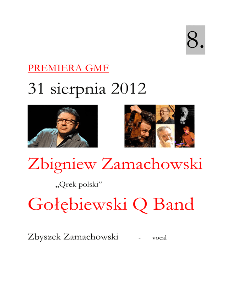 8. PREMIERA GMF 31 sierpnia 2012 Zbigniew Zamachowski „Qrek polski” Gołębiewski Q Band Zbyszek Zamachowski - vocal Gołębiewski Q Band Tomek Gołębiewski - skrzypce Adam Manijak - fortepian, instrumenty klawiszowe Marcin Janiszewski - akordeon Maciek Latalski - gitara basowa Radek Bolewski - instrumenty perkusyjne Qrek polski jest kolejnym projektem FUSION Tomasza Gołębiewskiego, koncertmistrza Filharmonii Łódzkiej. Po projekcie QuintophoniQ z Krzesimirem Dębskim i Leszkiem Kułakowskim i przygodzie z jazzem - kolejny łączący różne style. Qrek to piosenki miejskie i ludowe, charakterystyczny aktorski głos i jazzująco - folkowy skład instrumentalny. To wszystko w nowych aranżacjach, dających dużo radości, fantazji i zabawy. Zbigniew Zamachowski po niezbyt długim czasie na refleksję powiedział - „chętnie podejmę się tego nowego wyzwania, ponieważ nigdy nie śpiewałem Miała baba koguta!” Wszystkie aranże są autorstwa łódzkiego artysty Macieja Latalskiego, który przygotował spójną prezentację utworów na mistrzowski głos, skrzypce, akordeon, gitarę basową i instrumenty perkusyjne. W programie m.in.: Bal u weteranów, Na Gnojnej, Miała baba koguta, Szła dzieweczka do laseczka, Pije Kuba do Jakuba, Mały biały domek, Cicha woda brzegi rwie, Hej sokoły. Zbigniew Zamachowski Wybitny aktor teatralny i filmowy, kompozytor, autor tekstów piosenek i poeta, pedagog. Urodzony 17 lipca 1961 roku w Brzezinach. Absolwent „ Łódzkiej Filmówki”. Jego aktorski debiut przypada na rok 1981 i rolę w filmie Krzysztofa Rogulskiego pt.” Wielka majówka”. Od 1997 roku jest związany z Teatrem Narodowym w Warszawie. Laureat wielu wyróżnień: nagroda im. Zbyszka Cybulskiego, nagroda im. Stanisława Wyspiańskiego, nagroda Festiwalu Polskich Filmów Fabularnych w Gdańsku za Zawrócony w reż. Kazimierza Kutza, Polska Nagroda Filmowa "Orzeł" za Cześć Tereska w reż. Roberta Glińskiego oraz Zmruż oczy w reż. Andrzeja Jakimowskiego. Lata 90. to niezapomniane kreacje teatralne oraz filmowe ( m.in. Krzysztofa Kieślowskiego Dekalog i cyklu Trzy Kolory). Jest wielkim pasjonatem muzyki i właścicielem imponującej kolekcji płyt. Tomasz Gołębiewski koncertmistrz Filharmonii Łódzkiej, producent, manager kultury. Twórca unikatowych projektów -Vivaldi kwartet smyczkowy & harfa, raneQ - muzyka współczesna polskich jazzmenów. QuintophoniQ - muzyka mistrzów polskiego jazzu na duo skrzypcowe i trio jazzowe (Dębski, Urbaniak, Namysłowski, Strzelczyk, Herdzin, Serafiński, Delong, Manijak, Latalski) stała współpraca koncertowa z Krzesimirem Dębskim i trio Leszka Kułakowskiego. QuintophoniQ & Krzesimir Dębski Live wydane na płycie CD Marcin Janiszewski akordeonista, pianista, aranżer. Absolwent wydziału Muzyki Rozrywkowej AM w Katowicach w specjalności akordeon. Lider zespołów muzycznych, współpracował z wieloma uznanymi artystami i zespołami m.in. z Elżbietą Adamiak, Joelem Dancygerem, Markiem Bałatą, Krzysztofem Ścierańskim i zespołem Yankel Band. Adam Manijak Pianista, kompozytor. Jako solista i kameralista bierze udział w licznych koncertach i festiwalach w kraju i za granicą. Jest twórcą oprawy muzycznej kilku przedstawień teatralnych oraz utworów jazzowych dla Big Bandu Jacka Delonga. Maciej Latalski kompozytor, aranżer i gitarzysta basowy. Współpracował z "Big Warsaw Band", Zbigniewem Wodeckim, Andrzejem Zauchą, Bogusławem Mecem, Krystyna Prońko, Wojciechem Gąssowskim. Autor muzyki do: głównego wydania Wiadomości TVP1(92-95), Wiadomości sportowych, Vision, Radia Łódź, Plus Minus TVP. Radek Bolewski Obecnie jego działalność muzyczna koncentruje się na autorskim projekcie FONOVEL, który 7 marca 2011 miał swoją premierę fonograficzną. Związany niegdyś z zespołami: LSTADT i RADIEV. Aktywny muzyk sesyjny, mający na koncie takie wydawnictwa jak: Krystyna Prońko Poranne łzy i inne tęsknoty, L. Stadt - L. Stadt, Elżbieta Adamiak - Te 30 Urodziny - Martyna Jakubowicz. Partnerzy Qrka Premiera polska Premiera łódzka Strategiczny