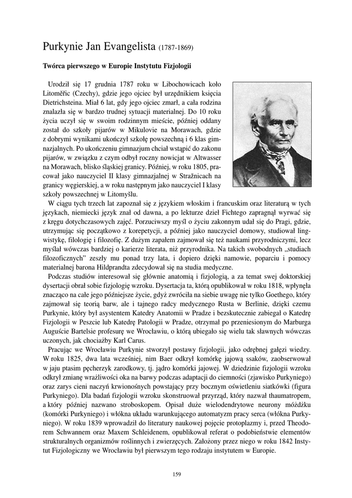 Purkynie Jan Evangelista (1787−1869) Twórca pierwszego w Europie Instytutu Fizjologii Urodził się 17 grudnia 1787 roku w Libochowicach koło Litoměřic (Czechy), gdzie jego ojciec był urzędnikiem księcia Dietrichsteina. Miał 6 lat, gdy jego ojciec zmarł, a cała rodzina znalazła się w bardzo trudnej sytuacji materialnej. Do 10 roku życia uczył się w swoim rodzinnym mieście, później oddany został do szkoły pijarów w Mikulovie na Morawach, gdzie z dobrymi wynikami ukończył szkołę powszechną i 6 klas gim− nazjalnych. Po ukończeniu gimnazjum chciał wstąpić do zakonu pijarów, w związku z czym odbył roczny nowicjat w Altwasser na Morawach, blisko śląskiej granicy. Później, w roku 1805, pra− cował jako nauczyciel II klasy gimnazjalnej w Stražnicach na granicy węgierskiej, a w roku następnym jako nauczyciel I klasy szkoły powszechnej w Litomyšlu. W ciągu tych trzech lat zapoznał się z językiem włoskim i francuskim oraz literaturą w tych językach, niemiecki język znał od dawna, a po lekturze dzieł Fichtego zapragnął wyrwać się z kręgu dotychczasowych zajęć. Porzuciwszy myśl o życiu zakonnym udał się do Pragi, gdzie, utrzymując się początkowo z korepetycji, a później jako nauczyciel domowy, studiował ling− wistykę, filologię i filozofię. Z dużym zapałem zajmował się też naukami przyrodniczymi, lecz myślał wówczas bardziej o karierze literata, niż przyrodnika. Na takich swobodnych „studiach filozoficznych” zeszły mu ponad trzy lata, i dopiero dzięki namowie, poparciu i pomocy materialnej barona Hildprandta zdecydował się na studia medyczne. Podczas studiów interesował się głównie anatomią i fizjologią, a za temat swej doktorskiej dysertacji obrał sobie fizjologię wzroku. Dysertacja ta, którą opublikował w roku 1818, wpłynęła znacząco na całe jego późniejsze życie, gdyż zwróciła na siebie uwagę nie tylko Goethego, który zajmował się teorią barw, ale i tajnego radcy medycznego Rusta w Berlinie, dzięki czemu Purkynie, który był asystentem Katedry Anatomii w Pradze i bezskutecznie zabiegał o Katedrę Fizjologii w Peszcie lub Katedrę Patologii w Pradze, otrzymał po przeniesionym do Marburga Auguście Bartelsie profesurę we Wrocławiu, o którą ubiegało się wielu tak sławnych wówczas uczonych, jak chociażby Karl Carus. Pracując we Wrocławiu Purkynie stworzył postawy fizjologii, jako odrębnej gałęzi wiedzy. W roku 1825, dwa lata wcześniej, nim Baer odkrył komórkę jajową ssaków, zaobserwował w jaju ptasim pęcherzyk zarodkowy, tj. jądro komórki jajowej. W dziedzinie fizjologii wzroku odkrył zmianę wrażliwości oka na barwy podczas adaptacji do ciemności (zjawisko Purkyniego) oraz zarys cieni naczyń krwionośnych powstający przy bocznym oświetleniu siatkówki (figura Purkyniego). Dla badań fizjologii wzroku skonstruował przyrząd, który nazwał thaumatropem, a który później nazwano stroboskopem. Opisał duże wielodendrytowe neurony móżdżku (komórki Purkyniego) i włókna układu warunkującego automatyzm pracy serca (włókna Purky− niego). W roku 1839 wprowadził do literatury naukowej pojęcie protoplazmy i, przed Theodo− rem Schwannem oraz Maxem Schleidenem, opublikował referat o podobieństwie elementów strukturalnych organizmów roślinnych i zwierzęcych. Założony przez niego w roku 1842 Insty− tut Fizjologiczny we Wrocławiu był pierwszym tego rodzaju instytutem w Europie. 159 Poza swymi głównymi dziełami Purkynie publikował też mnóstwo artykułów w czasopismach naukowych, w tym również w rocznikach Śląskiego Towarzystwa Kultury Ojczystej, którego był aktywnym członkiem, a przy tym jednym z pierwszych, którzy organizowali odczyty dla szer− szej publiczności. Znał doskonale język polski, w którym opublikował szereg prac z dziedziny humanistyki. Obok poezji Schillera i „Jerozolimy wyzwolonej” Tassa przetłumaczył też na język czeski wiele dzieł literatury polskiej i pozostawił bogatą korespondencję z polskim światem na− ukowym i literackim. Gdy w roku 1848 wydawało się, że nadchodzą zupełnie nowe czasy w monarchii Austro− Węgierskiej, nabrał ochoty, by znów służyć swej ojczyźnie. Pozostawiwszy we Wrocławiu środowisko naukowe – wyniki badań, uczniów, zwolenników, podstawowy warsztat – dzięki któ− remu fizjologia mogła się tu nadal rozwijać, przeniósł się w roku 1850 z powrotem do Pragi, gdzie rozpoczął wykłady w Szkole Wyższej. Założył tam również Instytut Fizjologiczny, a w ro− ku 1853 założył pierwsze czasopismo przyrodnicze w języku czeskim – „Živa”. Nie zważając na swój podeszły wiek i nie najlepszy stan zdrowia pracował niestrudzenie niemal do samej śmierci. W roku 1829 przyjęty został w poczet członków Leopoldyńsko−Karolińskiej Akademii Przy− rodników (Matrikel No. 1339), przybierając na cześć Erazma Darwina, dziadka Karola Darwina, przydomek „Darwin”. Ponadto był członkiem Royal Society w Londynie, Linnean Society, akademii nauk w Wiedniu, Paryżu, Petersburgu, Zagrzebiu i Peszcie, Praskiego Towarzystwa Naukowego, korespondował z akademiami w Berlinie, Krakowie i Brukseli oraz z towa− rzystwami lekarskimi w Berlinie, Petersburgu, Brukseli, Hamburgu, Erlangen, Pradze i Warsza− wie. Występował z referatami na posiedzeniach przyrodników w Berlinie, Dreźnie, Wrocławiu, Pradze i Karlsbadzie. Za swoje zasługi odznaczony był pruskim Czerwonym Orłem III Kl., rosyjskim Orderem Włodzimierza i austriackim Orderem Leopolda. W grudniu 1868 roku uro− czyście obchodzono 50 rocznicę jego doktoratu. Na krótko przed śmiercią został nobilitowany przez cesarza Franciszka Józefa. Zmarł 28 lipca 1869 roku w Pradze. Wybrane prace: 1818 – 1823 – 1825 – 1825 – 1826 – 1830 – 1834 – 1835 – 1835 – 1835 – 1838 – 1839 – Beiträge zur Kenntniss des Sehens in subjectiver Hinsicht. Prag. 