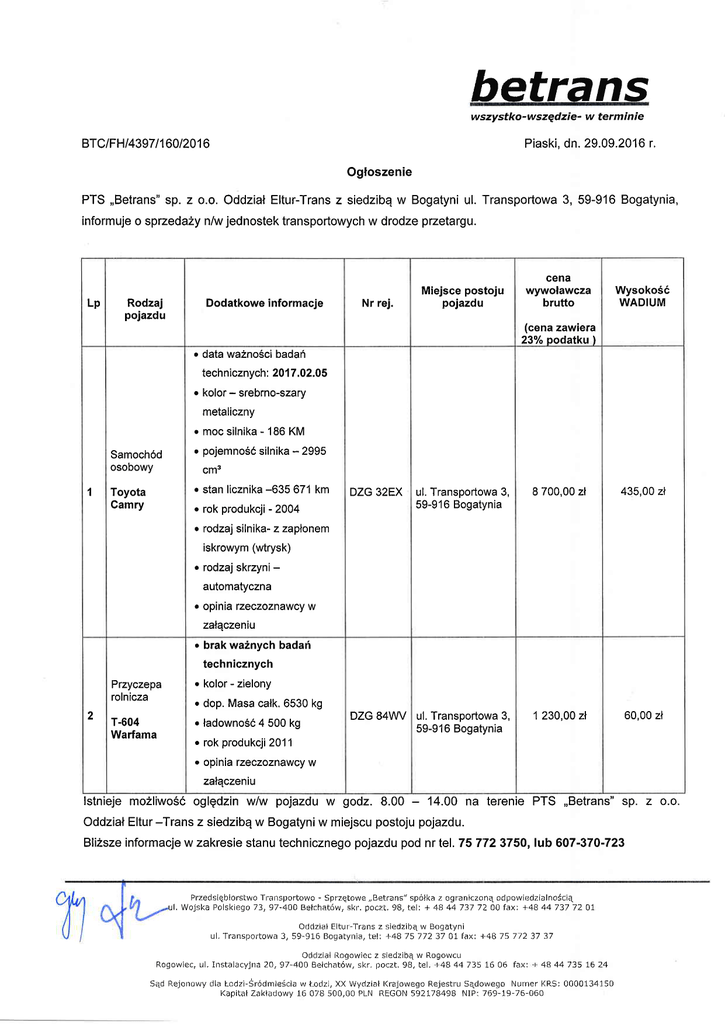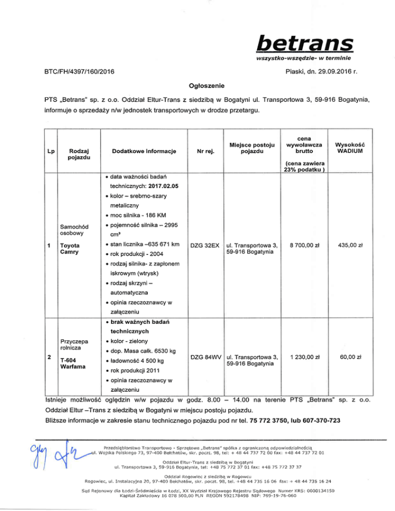 PIS,,Befrans" sp. z o.o. zastrzega prawo do pzeprowadzenia licytacji ustnej po zlo2eniu ofert przez