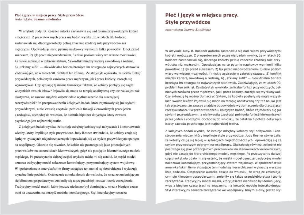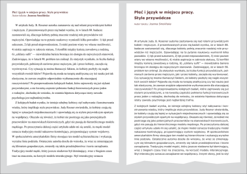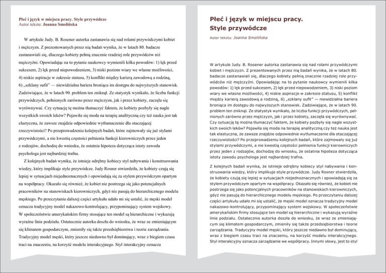 Płeć i język w miejscu pracy. Style przywódcze Autor tekstu: Joanna Smolińska W artykule Judy. B. Rosener autorka zastanawia się nad rolami przywódczymi kobiet Płeć i język w miejscu pracy. Style przywódcze Autor tekstu: Joanna Smolińska i mężczyzn. Z prezentowanych przez nią badań wynika, że w latach 80. badacze zastanawiali się, dlaczego kobiety pełnią znacznie rzadziej role przywódców niż mężczyźni. Opowiadając na to pytanie naukowcy wymienili kilka powodów: 1) lęk przed W artykule Judy. B. Rosener autorka zastanawia się nad rolami przywódczymi sukcesem, 2) lęk przed niepowodzeniem, 3) niski poziom wiary we własne możliwości, kobiet i mężczyzn. Z prezentowanych przez nią badań wynika, że w latach 80. 4) niskie aspiracje w zakresie statusu, 5) konflikt między karierą zawodową a rodziną, badacze zastanawiali się, dlaczego kobiety pełnią znacznie rzadziej role przy- 6) „szklany sufit” — niewidzialna bariera broniąca im dostępu do najwyższych stanowisk. Zadziwiające, że w latach 90. problem ten zniknął. Ze statystyk wynikało, że liczba funkcji przywódczych, pełnionych zarówno przez mężczyzn, jak i przez kobiety, zaczęła się wyrównywać. Czy sytuację tę można tłumaczyć faktem, że kobiety pozbyły się nagle wszystkich swoich leków? Pojawiła się moda na terapię analityczną czy też nauka jest tak elastyczna, że zawsze znajdzie odpowiednie wytłumaczenie dla otaczającej rzeczywistości? Po przeprowadzeniu kolejnych badań, które zajmowały się już stylami przywódczymi, a nie kwestią częstości pełnienia funkcji kierowniczych przez jeden wódców niż mężczyźni. Opowiadając na to pytanie naukowcy wymienili kilka powodów: 1) lęk przed sukcesem, 2) lęk przed niepowodzeniem, 3) niski poziom wiary we własne możliwości, 4) niskie aspiracje w zakresie statusu, 5) konflikt między karierą zawodową a rodziną, 6) „szklany sufit” — niewidzialna bariera broniąca im dostępu do najwyższych stanowisk. Zadziwiające, że w latach 90. problem ten zniknął. Ze statystyk wynikało, że liczba funkcji przywódczych, pełnionych zarówno przez mężczyzn, jak i przez kobiety, zaczęła się wyrównywać. Czy sytuację tę można tłumaczyć faktem, że kobiety pozbyły się nagle wszystkich swoich leków? Pojawiła się moda na terapię analityczną czy też nauka jest tak elastyczna, że zawsze znajdzie odpowiednie wytłumaczenie dla otaczającej rzeczywistości? Po przeprowadzeniu kolejnych badań, które zajmowały się już z rodzajów, dochodzę do wniosku, że ostatnia hipoteza dotycząca istoty zawodu stylami przywódczymi, a nie kwestią częstości pełnienia funkcji kierowniczych psychologa jest najbardziej trafna. przez jeden z rodzajów, dochodzę do wniosku, że ostatnia hipoteza dotycząca Z kolejnych badań wynika, że istnieje odrębny kobiecy styl nabywania i konstruowania wiedzy, który implikuje style przywódcze. Judy Rosner stwierdziła, że kobiety czują się lepiej w sytuacjach niejednoznacznych i opowiadają się za stylem przywódczym opartym istoty zawodu psychologa jest najbardziej trafna. Z kolejnych badań wynika, że istnieje odrębny kobiecy styl nabywania i konstruowania wiedzy, który implikuje style przywódcze. Judy Rosner stwierdziła, że kobiety czują się lepiej w sytuacjach niejednoznacznych i opowiadają się za na współpracy. Okazało się również, że kobiet nie postrzega się jako potencjalnych stylem przywódczym opartym na współpracy. Okazało się również, że kobiet nie pracowników na stanowiskach kierowniczych, gdyż nie pasują do hierarchicznego modelu postrzega się jako potencjalnych pracowników na stanowiskach kierowniczych, męskiego. Po przeczytaniu dalszej części artykułu udało mi się ustalić, że męski model gdyż nie pasują do hierarchicznego modelu męskiego. Po przeczytaniu dalszej części artykułu udało mi się ustalić, że męski model oznacza tradycyjny model oznacza tradycyjny model nakazowo-kontrolujący, przypominający system wojskowy. nakazowo‑kontrolujący, przypominający system wojskowy. W społeczeństwie W społeczeństwie amerykańskim firmy stosujące ten model są hierarchiczne i wykazują amerykańskim firmy stosujące ten model są hierarchiczne i wykazują wyraźne wyraźne linie podziału. Ostatecznie autorka doszła do wniosku, że wraz ze zmieniającym linie podziału. Ostatecznie autorka doszła do wniosku, że wraz ze zmieniającym się klimatem gospodarczym, zmieniły się także przedsiębiorstwa i teorie się klimatem gospodarczym, zmieniły się także przedsiębiorstwa i teorie zarządzania. zarządzania. Tradycyjny model męski, który jeszcze niedawno był dominujący, Tradycyjny model męski, który jeszcze niedawno był dominujący, wraz z biegiem czasu wraz z biegiem czasu traci na znaczeniu, na korzyść modelu interakcyjnego. traci na znaczeniu, na korzyść modelu interakcyjnego. Styl interakcyjny oznacza zarządzanie we współpracy. Innymi słowy, jest to styl wielokierunkowy z sygnałami Styl interakcyjny oznacza zarządzanie we współpracy. Innymi słowy, jest to styl Płeć i język w miejscu pracy. Style przywódcze Autor tekstu: Joanna Smolińska W artykule Judy. B. Rosener autorka zastanawia się nad rolami przywódczymi kobiet i mężczyzn. Z prezentowanych przez nią badań wynika, że w latach 80. badacze zastanawiali się, dlaczego kobiety pełnią znacznie rzadziej role przywódców niż mężczyźni. Opowiadając na to pytanie naukowcy wymienili kilka powodów: 1) lęk przed sukcesem, 2) lęk przed niepowodzeniem, 3) niski poziom wiary we własne możliwości, 4) niskie aspiracje w zakresie statusu, 5) konflikt między karierą zawodową a rodziną, 6) „szklany sufit” — niewidzialna bariera broniąca im dostępu do najwyższych stanowisk. Zadziwiające, że w latach 90. problem ten zniknął. Ze statystyk wynikało, że liczba funkcji przywódczych, pełnion