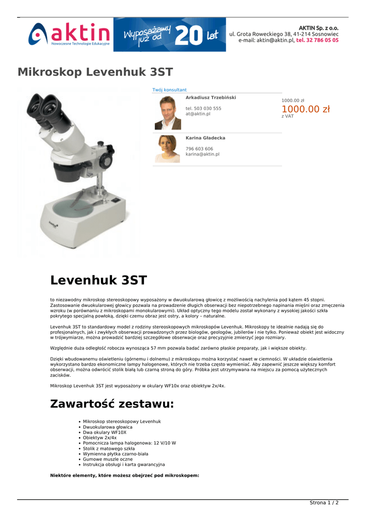 Mikroskop Levenhuk 3ST Twój konsultant Arkadiusz Trzebiński tel. 503 030 555 [email protected] NOWOŚĆ W OFERCIE 1000.00 zł 1000.00 zł z VAT Karina Gładecka 796 603 606 [email protected] Levenhuk 3ST to niezawodny mikroskop stereoskopowy wyposażony w dwuokularową głowicę z możliwością nachylenia pod kątem 45 stopni. Zastosowanie dwuokularowej głowicy pozwala na prowadzenie długich obserwacji bez niepotrzebnego napinania mięśni oraz zmęczenia wzroku (w porównaniu z mikroskopami monokularowymi). Układ optyczny tego modelu został wykonany z wysokiej jakości szkła pokrytego specjalną powłoką, dzięki czemu obraz jest ostry, a kolory – naturalne. Levenhuk 3ST to standardowy model z rodziny stereoskopowych mikroskopów Levenhuk. Mikroskopy te idealnie nadają się do profesjonalnych, jak i zwykłych obserwacji prowadzonych przez biologów, geologów, jubilerów i nie tylko. Ponieważ obiekt jest widoczny w trójwymiarze, można prowadzić bardziej szczegółowe obserwacje oraz precyzyjnie zmierzyć jego rozmiary. Względnie duża odległość robocza wynosząca 57 mm pozwala badać zarówno płaskie preparaty, jak i większe obiekty. Dzięki wbudowanemu oświetleniu (górnemu i dolnemu) z mikroskopu można korzystać nawet w ciemności. W układzie oświetlenia wykorzystano bardzo ekonomiczne lampy halogenowe, których nie trzeba często wymieniać. Aby zapewnić jeszcze większy komfort obserwacji, można odwrócić stolik białą lub czarną stroną do góry. Próbka jest utrzymywana na miejscu za pomocą użytecznych zacisków. Mikroskop Levenhuk 3ST jest wyposażony w okulary WF10x oraz obiektyw 2x/4x. Zawartość zestawu: Mikroskop stereoskopowy Levenhuk Dwuokularowa głowica Dwa okulary WF10X Obiektyw 2x/4x Pomocnicza lampa halogenowa: 12 V/10 W Stolik z matowego szkła Wymienna płytka czarno-biała Gumowe muszle oczne Instrukcja obsługi i karta gwarancyjna Niektóre elementy, które możesz obejrzeć pod mikroskopem: Strona 1 / 2 Głowica Materiał układu optycznego Powiększenie, x Odległość robocza, mm Rozstaw okularów, mm Stolik, mm Regulacja dioptrii okularu, dioptrii Regulacja ostrości Oświetlenie dwuokularowa, nachylana pod kątem 45° szkło 20-40 57 60 stolik z matowego szkła z zaciskami, wymienna płytka czarno-biała od +5 do -5 zgrubna, 40 mm lampa halogenowa 12 v/10 w Strona 2 / 2 Powered by TCPDF (www.tcpdf.org)