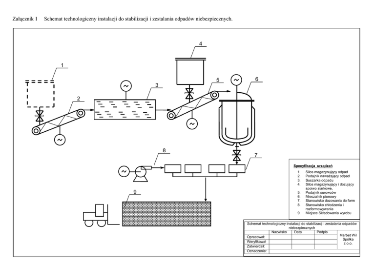 Załącznik 1 Schemat technologiczny instalacji do stabilizacji i zestalania odpadów niebezpiecznych. 4 1 5 3 6 2 8 7 Specyfikacja urządzeń 1. 2. 3. 4. 9 5. 6. 7. 8. 9. Silos magazynujący odpad Podajnik naważający odpad Suszarka odpadu Silos magazynujący i dozujący spoiwo siarkowe, Podajnik surowców Mieszalnik pionowy Stanowisko dozowania do form Stanowisko chłodzenia i rozformowywania Miejsce Składowania wyrobu Schemat technologiczny instalacji do stabilizacji i zestalania odpadów niebezpiecznych Nazwisko Data Podpis Marbet Wil Opracował: Spółka Weryfikował z o.o. Zatwierdził: Oznaczenie: