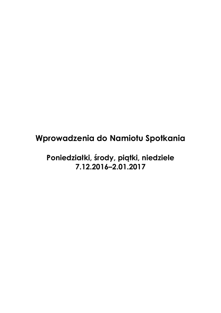Wprowadzenia do Namiotu Spotkania Poniedziałki, środy, piątki, niedziele 7.12.2016–2.01.2017 W tym szczególnym czasie oczekujemy na narodzenie Jezusa. On przychodzi na świat jako oczekiwany Zbawiciel. Oczekiwany nie tylko przez naród Izraela, ale też przez każdego z nas, także przez ciebie. W najgłębszych zakamarkach serca spróbuj odnaleźć w sobie to pragnienie by Go spotkać i zaprosić do swojego życia. Spróbuj w tym dosyć napiętym czasie znaleźć chwile dla Niego. Nie zrażaj się, gdy ci nie wychodzi – Pan poradzi sobie i z tą słabością, czerp od Niego siłę by powstawać i zaczynać od nowa. To Pan pierwszy wychodzi, aby się z tobą spotkać. Odpowiedz na Jego zaproszenie, spotykaj się z Nim i trwaj w jego obecności, w Namiocie Spotkania i w sakramentach. Czerp z Niego świętość, bo On pragnie ciebie uświęcać. 2 Środa 7.12.2016 Wspomnienie św. Ambrożego, biskupa i doktora Kościoła Mt 11,28-30 Spróbuj wyobrazić sobie sytuację, w której Jezus wypowiada słowa, spisane przez św. Mateusza. Może jest to małe grono uczniów, może tłum ludzi. Wyobraź sobie, że jesteś wśród nich. Daj się poruszyć słowom Tego, który pragnie przemówić wprost do twojego serca. Czytając te trzy zdania smakuj każde słowo. Zatrzymuj się i powracaj do tych, które szczególnie dzisiaj ciebie poruszają. Jezus swoje słowo kieruje nie tylko „uniwersalnie”, ale też bardzo konkretnie do ciebie, dokładnie w tym momencie twojego życia. Zastanów się, co dotyka (lub chciałbyś aby dotknęło) twojego serca. Może „utrudzenie i obciążenie”, może „pokrzepienie”, może „uczcie się ode mnie”, może „ukojenie”, może „słodkie jarzmo” i „lekkie brzemię”. Czytaj i szukaj. Cokolwiek rodzi się w twoim sercu – wypowiedz to przed Panem. Być może będzie to dziękczynienie, prośba, przeproszenie, uwielbienie. I wpatruj się w Niego, trwaj w Jego obecności, aby zaczerpnąć tego, co On tobie pragnie dać. Piątek 9.12.2016 Mt 17, 10-13 Jezus naucza swoich uczniów. Przypomina to, co miało miejsce w historii i zapowiada nowe wydarzenia. Jest dla nich przewodnikiem na drodze wiary. Jezus daje świadectwo o Janie Chrzcicielu, który jako ostatni z proroków był głosem wołającego na pustyni: „Przygotujcie drogę Panu! Prostujcie ścieżki dla niego!” Jest to dla nas zaproszenie do przygotowania swojego serca. Wezwanie do nawrócenia, byśmy trwając w łasce uświęcającej z mocą wołali w tym adwentowym czasie oczekiwania: Marana-tha! Przyjdź Panie Jezu! 3 Niedziela 11.12.2016 III Niedziela Adwentu, tzw. Niedziela Radości (Laetare) Mt 11,2-11 Wyobraź sobie scenę, w której uczniowie Jana przychodzą do Jezusa i z Nim rozmawiają. Może twoją uwagę przykuje sposób w jaki Jezus odpowiada na postawione Mu pytanie. Mówi o cudach, które nie tyle się dokonały, tylko które wciąż się dokonują, które wciąż mają miejsce. Czy ty doświadczyłeś kiedyś cudu Jezusa? A może jesteś świadkiem sytuacji, w których ludzie odzyskali wzrok, zaczęli słyszeć, zmartwychwstali? – nie tylko w sensie dosłownym, fizycznym. Może sam doświadczyłeś przejrzenia, może sam usłyszałeś, a może jakaś sfera w tobie zmartwychwstała – dzięki mocy Jezusa? Zastanów się nad tym i podziękuj Jezusowi za cuda, których dokonał w twoim życiu i za cuda, których ciągle dokonuje. A jeśli takich nie doświadczyłeś, proś byś w Niego nie zwątpił: „A błogosławiony jest ten, kto we Mnie nie zwątpi”. Poniedziałek 12.12.2016 Mt 21,23-27 Zamknij oczy i zobacz jak Jezus wchodzi do świątyni. Świątynia wypełniona jest ludźmi, którzy chcą spotkać Boga, usłyszeć, że ich kocha i troszczy się o nich. Ty też tam jesteś. Widzisz jak grupa osób podchodzi do Pana. To arcykapłani i starsi ludu. Słyszysz ich dialog z Jezusem. Jakie emocje budzi w tobie pytanie, które Mu zadają? Co czujesz, gdy słyszysz odpowiedź Jezusa? Co myślisz, gdy widzisz, jak mimo przebiegłych kalkulacji nie znajdują odpowiedzi na Jego pytanie? Pomyśl, jak ty zachowujesz się w sytuacjach, gdy inni ciebie atakują, oczekują deklaracji i działań niezgodnych z Ewangelią. Gdy pytają, jakim prawem coś czynisz: upominasz, stajesz 4 w obronie niesłusznie oskarżanych, żądasz sprawiedliwości, nie godzisz się na coś, co ma choćby pozory zła… A może sam jesteś oskarżycielem. Żądasz, by Bóg odpowiedział: jakim prawem coś czyni dla ciebie, twoich najbliższych, dla świata? Nie bój się. Jezus dobrze wie, co dzieje się w twoim sercu. Jest ponad strach, który zmusza do kalkulacji, czy innym się spodoba, co powiedzą i zrobią. Jest ponad każdą ludzką złość, bezsilność, czy ból. Jest ponad całą mądrość świata. Nikt nie sprosta Jego Mądrości. Podziękuj Jezusowi za to, że daje ci dzisiaj Ducha Świętego – moc, byś był taki jak On. Proś Ducha Świętego, aby przenikał teraz twoje serce, zwyciężał strach przed wiarą, albo twój bunt. Abyś zawsze zdawał się na Niego, otwierał się na Jego pomoc i prowadzenie. Ufaj i trwaj. Środa 14.12.2016 Wspomnienie św. Jana od Krzyża, prezbitera i doktora Kościoła Łk 7,18b-23 Jan Chrzciciel wysyła swoich uczniów do Jezusa, aby upewnili się, że On jest Mesjaszem. Zastanów się, co mogło powodować Janem. Może przebywając w więzieniu Heroda miał chwilę zwątpienia? Może spodziewał się innego Mesjasza, takiego, którego sam zapowiadał – surowego i karzącego? Mimo tego Jan nie chce zostać sam z wątpliwościami i wprost zadaje pytania Jezusowi. Co więcej, Jezus nie wypomina mu niewiary, ale po prostu odpowiada. Może i w twoim życiu są chwile zwątpienia. Nie muszą to być wątpliwości w kwestiach wiary, ale może przychodzą tobie myśli, że coś jest bez sensu, że nie doświadczysz szczęścia, że jakaś sprawa jest zupełnie beznadziejna. Przyjrzyj się swojemu życiu, znajdź takie momenty, gdzie nie znajduj