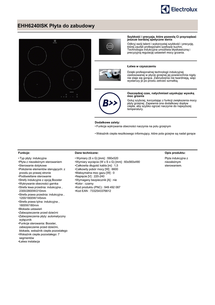EHH6240ISK Płyta do zabudowy Szybkość i precyzja, które pozwolą Ci przyrządzać jeszcze bardziej apetyczne dania Odkryj swój talent i wykorzystaj szybkość i precyzję, której zaufali profesjonalni szefowie kuchni. Technologia indukcyjna umożliwia błyskawiczną i precyzyjną regulację ustawień mocy grzania. Łatwa w czyszczeniu Dzięki profesjonalnej technologii indukcyjnej zastosowanej w płycie grzejnej jej powierzchnia nigdy nie staje się gorąca. Zabrudzenia nie twardnieją, więc wystarczy je po prostu zetrzeć szmatką. Oszczędzaj czas, natychmiast uzyskując wysoką moc grzania Gotuj szybciej, korzystając z funkcji zwiększenia mocy płyty grzejnej. Zapewnia ona dodatkowy dopływ ciepła, aby szybko ogrzać naczynie do najwyższej temperatury. Dodatkowe zalety: • Funkcja wykrywania obecności naczynia na polu grzejnym • Wskaźnik ciepła resztkowego informujący, które pola grzejne są nadal gorące Funkcje: Dane techniczne: Opis produktu: • Typ płyty: indukcyjna •Płyta z niezależnym sterowaniem •Sterowanie dotykowe •Położenie elementów sterujących: z przodu po prawej stronie •Podświetlane sterowanie •Strefy indukcyjne z opcją Booster •Wykrywanie obecności garnka •Strefa lewa przednia: indukcyjna , 2300/2800W/210mm •Strefa prawa przednia: indukcyjna , 1200/1800W/145mm •Strefa prawa tylna: indukcyjna , 1800W/180mm •Blokada ustawień •Zabezpieczenie przed dziećmi •Zabezpieczenia płyty: automatyczny wyłącznik •Funkcje sterowania: Booster, zabezpieczenie przed dziećmi, blokada, wskaźnik ciepła pozostałego •Wskaźnik ciepła pozostałego: 7 segmentów •Łatwa instalacja • Wymiary (S x G) [mm] : 590x520 •Wymiary wycięcia (W x S x G) [mm] : 60x560x490 •Całkowita długość kabla [m] : 1,5 •Całkowity pobór mocy [W] : 6600 •Maksymalna moc gazu [W] : 0 •Napięcie [V] : 220-240 •Wymagany bezpiecznik [A] : nie •Kolor : czarny •Kod produktu (PNC) : 949 492 087 •Kod EAN : 7332543376612 Płyta indukcyjna z niezależnym sterowaniem. EHH6240ISK Płyta do zabudowy