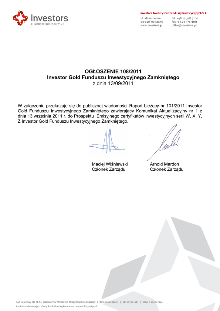 OGŁOSZENIE 108/2011 Investor Gold Funduszu Inwestycyjnego Zamkniętego z dnia 13/09/2011 W załączeniu przekazuje się do publicznej wiadomości Raport bieżący nr 101/2011 Investor Gold Funduszu Inwestycyjnego Zamkniętego zawierający Komunikat Aktualizacyjny nr 1 z dnia 13 września 2011 r. do Prospektu Emisyjnego certyfikatów inwestycyjnych serii W, X, Y, Z Investor Gold Funduszu Inwestycyjnego Zamkniętego. Maciej Wiśniewski Członek Zarządu Arnold Mardoń Członek Zarządu INVESTOR GOLD FIZ RB_FI_E 101 2011 korekta KOMISJANADZORUFINANSOWEGO Raport bieżący funduszu inwestycyjnego nr 101 / 2011 (numer kol ejny raportu / rok) Data przekazania: 2011-09-13 Nazwa podmiotu: INVESTOR GOLD FUNDUSZ INWESTYCYJNY ZAMKNIĘTY Temat raportu: Komunikat Aktualizacyjny nr 1 z dnia 13 września 2011 r. do Prospektu Emisyj nego Certyfikatów Inwestycyjnych serii W, X, Y, Z Investor Gold Funduszu Inwestycyjnego Zamkniętego Podstawa prawna § 42 ust. 1 pkt 37 oie - inne zdarzenia, przewi dzi ane statutem funduszu WIADOMOŚĆ W załączeniu przekazuje się Komunikat Aktualizacyjny nr 1 z dnia 13 września 2011 r. do Prospektu Emisyjnego Certyfikatów Inwestycyjnych serii W, X, Y, Z Investor Gold Funduszu Inwestycyjnego Zamkniętego. Pli k Opi s Komuni katAktualizac yjny1.2011.09.13.pdf PODPISYOSÓBREPREZENTUJĄCYCHPODMIOT Data Imię i Nazwi sko Stanowisko/Funkcja 2011-09-13 Grzegorz Mi elcarek Prezes Zarządu 2011-09-13 Maciej Wiśniewski Członek Zarządu Podpis Komisja Nadzoru Finansowego 1 Komunikat Aktualizacyjny nr 1 z dnia 13 września 2011 r. do Prospektu Emisyjnego Certyfikatów Inwestycyjnych serii W, X, Y, Z Investor Gold Funduszu Inwestycyjnego Zamkniętego W Prospekcie emisyjnym Certyfikatów Inwestycyjnych serii W, X, Y, Z Investor Gold Funduszu Inwestycyjnego Zamkniętego zatwierdzonym przez Komisję Nadzoru Finansowego w dniu 8 września 2011 r. wprowadza się następujące zmiany: 1) w związku z przesunięciem terminu przyjmowania zapisów na Certyfikaty serii W, w rozdziale 1 Podsumowanie w pkt 8 dodaje się akapit w brzmieniu: „Oferta Certyfikatów serii W: zapis może obejmować minimalnie jeden certyfikat. Rozpoczęcie przyjmowania zapisów na Certyfikaty serii W nastąpi 15 września 2011 r. Zapisy będą przyjmowane do 28 września 2011 r. włącznie, w godzinach pracy Punktów Subskrypcyjnych. Cena emisyjna jednego Certyfikatu serii W będzie równa Wartości Aktywów Netto Funduszu na Certyfikat Inwestycyjny w Dniu Wyceny, o którym mowa w art. 24 ust. 3 Statutu, i jest jednolita dla wszystkich Certyfikatów objętych zapisami.” 2) w związku z przesunięciem terminu przyjmowania zapisów na Certyfikaty serii W, w rozdziale 4 w pkt 4.7.5 dodaje się akapit w brzmieniu: „Oferta Certyfikatów serii W: zapis może obejmować minimalnie jeden certyfikat. Rozpoczęcie przyjmowania zapisów na Certyfikaty serii W nastąpi 15 września 2011 r. Zapisy będą przyjmowane do 28 września 2011 r. włącznie, w godzinach pracy Punktów Subskrypcyjnych. Cena emisyjna jednego Certyfikatu serii W będzie równa Wartości Aktywów Netto Funduszu na Certyfikat Inwestycyjny w Dniu Wyceny, o którym mowa w art. 24 ust. 3 Statutu, i jest jednolita dla wszystkich Certyfikatów objętych zapisami.” 3) w związku z przesunięciem terminu przyjmowania zapisów na Certyfikaty serii W, w rozdziale 6 w pkt 6.3.7 dodaje się akapit w brzmieniu: „Oferta Certyfikatów serii W: zapis może obejmować minimalnie jeden certyfikat. Rozpoczęcie przyjmowania zapisów na Certyfikaty serii W nastąpi 15 września 2011 r. Zapisy będą przyjmowane do 28 września 2011 r. włącznie, w godzinach pracy Punktów Subskrypcyjnych. Cena emisyjna jednego Certyfikatu serii W będzie równa Wartości Aktywów Netto Funduszu na Certyfikat Inwestycyjny w Dniu Wyceny, o którym mowa w art. 24 ust. 3 Statutu, i jest jednolita dla wszystkich Certyfikatów objętych zapisami.” 4) w związku z przesunięciem terminu przyjmowania zapisów na Certyfikaty serii W, w rozdziale 6 w pkt 6.4.1.3 dodaje się akapit w brzmieniu: „Oferta Certyfikatów serii W: zapis może obejmować minimalnie jeden certyfikat. Rozpoczęcie przyjmowania zapisów na Certyfikaty serii W nastąpi 15 września 2011 r. Zapisy będą przyjmowane do 28 września 2011 r. włącznie, w godzinach pracy Punktów Subskrypcyjnych. Cena emisyjna jednego Certyfikatu serii W będzie równa Wartości Aktywów Netto Funduszu na Certyfikat Inwestycyjny w Dniu Wyceny, o którym mowa w art. 24 ust. 3 Statutu, i jest jednolita dla wszystkich Certyfikatów objętych zapisami.”