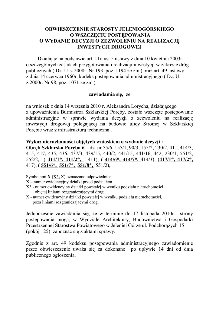 OBWIESZCZENIE STAROSTY JELENIOGÓRSKIEGO O WSZCZĘCIU POSTĘPOWANIA O WYDANIE DECYZJI O ZEZWOLENIU NA REALIZACJĘ INWESTYCJI DROGOWEJ Działając na podstawie art. 11d ust.5 ustawy z dnia 10 kwietnia 2003r. o szczególnych zasadach przygotowania i realizacji inwestycji w zakresie dróg publicznych ( Dz. U. z 2008r. Nr 193, poz. 1194 ze zm.) oraz art. 49 ustawy z dnia 14 czerwca 1960r. kodeks postępowania administracyjnego ( Dz. U. z 2000r. Nr 98, poz. 1071 ze zm.) zawiadamia się, Ŝe na wniosek z dnia 14 września 2010 r. Aleksandra Lorycha, działającego z upowaŜnienia Burmistrza Szklarskiej Poręby, zostało wszczęte postępowanie administracyjne w sprawie wydania decyzji o zezwoleniu na realizację inwestycji drogowej polegającej na budowie ulicy Stromej w Szklarskiej Porębie wraz z infrastrukturą techniczną . Wykaz nieruchomości objętych wnioskiem o wydanie decyzji : Obręb Szklarska Poręba 6 – dz. nr 55/6, 155/1, 90/3, 155/2, 230/2, 411, 414/3, 415, 417, 435, 436, 437/3, 439/15, 440/2, 441/15, 441/16, 442, 230/1, 551/2, 552/2, ( 411/1*, 411/2*, 411), ( 414/6*, 414/7*, 414/3), (417/1*, 417/2*, 417), ( 551/6*, 551/7*, 551/8*, 551/2), Symbolami X (X*, X) oznaczono odpowiednio: X – numer ewidencyjny działki przed podziałem X* - numer ewidencyjny działki powstałej w wyniku podziału nieruchomości, objętej liniami rozgraniczającymi drogi X - numer ewidencyjny działki powstałej w wyniku podziału nieruchomości, poza liniami rozgraniczającymi drogi Jednocześnie zawiadamia się, Ŝe w terminie do 17 listopada 2010r. strony postępowania mogą, w Wydziale Architektury, Budownictwa i Gospodarki Przestrzennej Starostwa Powiatowego w Jeleniej Górze ul. PodchorąŜych 15 (pokój 125) zapoznać się z aktami sprawy. Zgodnie z art. 49 kodeksu postępowania administracyjnego zawiadomienie przez obwieszczenie uwaŜa się za dokonane po upływie 14 dni od dnia publicznego ogłoszenia.