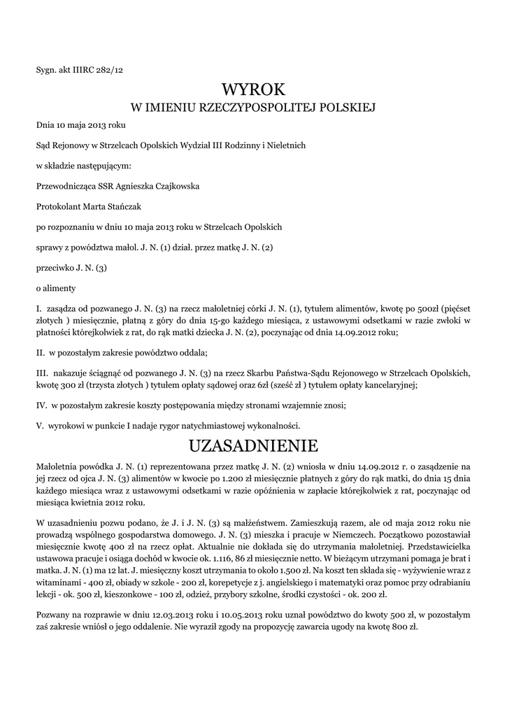 Sygn. akt IIIRC 282/12 WYROK W IMIENIU RZECZYPOSPOLITEJ POLSKIEJ Dnia 10 maja 2013 roku Sąd Rejonowy w Strzelcach Opolskich Wydział III Rodzinny i Nieletnich w składzie następującym: Przewodnicząca SSR Agnieszka Czajkowska Protokolant Marta Stańczak po rozpoznaniu w dniu 10 maja 2013 roku w Strzelcach Opolskich sprawy z powództwa małol. J. N. (1) dział. przez matkę J. N. (2) przeciwko J. N. (3) o alimenty I. zasądza od pozwanego J. N. (3) na rzecz małoletniej córki J. N. (1), tytułem alimentów, kwotę po 500zł (pięćset złotych ) miesięcznie, płatną z góry do dnia 15-go każdego miesiąca, z ustawowymi odsetkami w razie zwłoki w płatności którejkolwiek z rat, do rąk matki dziecka J. N. (2), poczynając od dnia 14.09.2012 roku; II. w pozostałym zakresie powództwo oddala; III. nakazuje ściągnąć od pozwanego J. N. (3) na rzecz Skarbu Państwa-Sądu Rejonowego w Strzelcach Opolskich, kwotę 300 zł (trzysta złotych ) tytułem opłaty sądowej oraz 6zł (sześć zł ) tytułem opłaty kancelaryjnej; IV. w pozostałym zakresie koszty postępowania między stronami wzajemnie znosi; V. wyrokowi w punkcie I nadaje rygor natychmiastowej wykonalności. UZASADNIENIE Małoletnia powódka J. N. (1) reprezentowana przez matkę J. N. (2) wniosła w dniu 14.09.2012 r. o zasądzenie na jej rzecz od ojca J. N. (3) alimentów w kwocie po 1.200 zł miesięcznie płatnych z góry do rąk matki, do dnia 15 dnia każdego miesiąca wraz z ustawowymi odsetkami w razie opóźnienia w zapłacie którejkolwiek z rat, poczynając od miesiąca kwietnia 2012 roku. W uzasadnieniu pozwu podano, że J. i J. N. (3) są małżeństwem. Zamieszkują razem, ale od maja 2012 roku nie prowadzą wspólnego gospodarstwa domowego. J. N. (3) mieszka i pracuje w Niemczech. Początkowo pozostawiał miesięcznie kwotę 400 zł na rzecz opłat. Aktualnie nie dokłada się do utrzymania małoletniej. Przedstawicielka ustawowa pracuje i osiąga dochód w kwocie ok. 1.116, 86 zł miesięcznie netto. W bieżącym utrzymani pomaga je brat i matka. J. N. (1) ma 12 lat. J. miesięczny koszt utrzymania to około 1.500 zł. Na koszt ten składa się - wyżywienie wraz z witaminami - 400 zł, obiady w szkole - 200 zł, korepetycje z j. angielskiego i matematyki oraz pomoc przy odrabianiu lekcji - ok. 500 zł, kieszonkowe - 100 zł, odzież, przybory szkolne, środki czystości - ok. 200 zł. Pozwany na rozprawie w dniu 12.03.2013 roku i 10.05.2013 roku uznał powództwo do kwoty 500 zł, w pozostałym zaś zakresie wniósł o jego oddalenie. Nie wyraził zgody na propozycję zawarcia ugody na kwotę 800 zł. Sąd ustalił następujący stan faktyczny: J. i J. N. (3) są małżeństwem od 19.09.1981 r. Z małżeństwa posiadają czworo dzieci, w tym jedno małoletnie - córkę J. ur. (...) dowody: 1. odpis skrócony aktu urodzenia J. N. (1), k. 4, 2. odpis skrócony aktu małżeństwa stron, k. 5, Oboje małżonkowie wraz z dziećmi - małoletnią J. i dorosłymi synem i córką mieszkają we wspólnym domu stanowiącym ich współwłasność małżeńską. Od maja 2012 r. nie prowadzą wspólnego gospodarstwa domowego. J. N. (2)utrzymuję się z wynagrodzenia za pracę w kwocie netto ok. 1116,86 zł miesięcznie. Jest zatrudniona w Szpitalu (...)w S.na stanowisku(...). Posiada zadłużenie u swojej matki na kwotę 200 zł pożyczoną na zakup ubrań dla córki i na kwotę 500 zł u brata pożyczoną na zakup leków dla córki. Nie posiada majątku ani oszczędności. J. N. (1) jest osobą opóźnioną w rozwoju od urodzenia. Z uwagi na głębokie deficyty rozwoju funkcji odpowiedzialnych za wnioskowanie, klasyfikowanie, porządkowanie informacji, jak również deficyty w zakresie pamięci słuchowej uczy się z dużymi trudnościami. Chodzi do publicznej szkoły, ale wymaga osobnego toku nauczania. Do kwietnia 2012 r. uczęszczała kilka razy w tygodniu na korepetycje z j. angielskiego, j. niemieckiego i matematyki oraz korzystała z odpłatnej pomocy w zakresie odrabiania lekcji. Łącznie rodzice ponosili z tego tytułu koszt ok. 500 zł miesięcznie. Aktualnie - od maja 2012 r. nie korzysta z pomocy w tym zakresie z uwagi na brak środków finansowych matki. dowody: 1. zaświadczenie Szpitala (...) w S. Op. k. 6, 22 2. zaświadczenie lekarskiego (...) w K. z 7.03.13r. k:20 3. opinia o małol. J. N. (1) wydanej przez PP-P w S. Op. w dn. 27.01.2011r. k:23-24 4. zaświadczenie (...) Bank (...). w S. Op. z 14.02.2013r. k: 21 5. zaświadczenie dot. leczenia J. N. (1) z dn. 11.04.2013 roku k:32 6. skierowanie do poradni specjalistycznej k: 33; 7. recepty k:34-35 8. paragon fiskalny na kwotę 100zł za wizytę w prywatnym w gabinecie lekarskim k: 36 9. zeznania J. N. (2) k: 25 10. zeznania J. N. (3) k: 25- 26 J. N. (3)pracuje na ternie Niemiec. Świadczy prace wskazane przez pośrednika pracy. Od 01.11.2012 r. do kwietnia 2012 r. był osobą bezrobotną. W tym czasie przebywał na stałe w Polce. Pobierał zasiłek dla bezrobotnych w kwocie ok. 600 euro. Nie posiadał innych dochodów. Przed tym okresem od kwietnia 2010 r. zarabiał ok. 1000 euro miesięcznie netto. Brak zatrudnienia wynikał z przestoju w produkcji w firmie dla której świadczył pracę. Od 1 kwietnia 2013 r. podjął ponownie zatrudnienie przez agencję pracy w Niemczech. Jego zarobki będą się plasowały na poziomie ok. 1000 -1100 euro netto miesięcznie J. N. (3) od czerwca 2012r. zablokował konto żonie - do tego czasu ona robiła opłaty za dom z tego konta. Od zablokowania konta sam czyni i ponosi wszelkie opłaty, tj. światło ok. 200zł miesięcznie (we wrześniu 2012 r. dodatkowo 731 zł tytułem niedopłaty), gaz co 2 miesiące 57zł woda i ścieki ok. 200zł miesięcznie, wywóz śmieci ok 337 zł rocznie, podatek od nieruchomości ok. 500zł rocznie. Nadto zakupił opał na zimę w roku 2012/2013 za cenę ok. 6000zł. W październiku 2012 r. zakupił piec CO do domu za kwotę 8500zł, zakończył budowę garażu na przełomie 2012