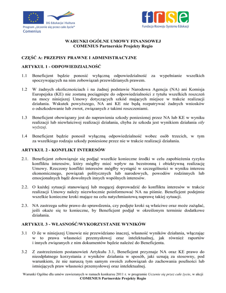 WARUNKI OGÓLNE UMOWY FINANSOWEJ COMENIUS Partnerskie Projekty Regio CZĘŚĆ A: PRZEPISY PRAWNE I ADMINISTRACYJNE ARTYKUŁ 1 - ODPOWIEDZIALNOŚĆ 1.1 Beneficjent będzie ponosić wyłączną odpowiedzialność za wypełnianie wszelkich spoczywających na nim zobowiązań przewidzianych prawem. 1.2 W Ŝadnych okolicznościach i na Ŝadnej podstawie Narodowa Agencja (NA) ani Komisja Europejska (KE) nie zostaną pociągnięte do odpowiedzialności z tytułu wszelkich roszczeń na mocy niniejszej Umowy dotyczących szkód mających miejsce w trakcie realizacji działania. Wskutek powyŜszego, NA ani KE nie będą rozpatrywać Ŝadnych wniosków o odszkodowanie lub zwrot, związanych z takimi roszczeniami. 1.3 Beneficjent obowiązany jest do naprawienia szkody poniesionej przez NA lub KE w wyniku realizacji lub niewłaściwej realizacji działania, chyba Ŝe szkoda jest wynikiem działania siły wyŜszej. 1.4 Beneficjent będzie ponosił wyłączną odpowiedzialność wobec osób trzecich, w tym za wszelkiego rodzaju szkody poniesione przez nie w trakcie realizacji działania. ARTYKUŁ 2 - KONFLIKT INTERESÓW 2.1. Beneficjent zobowiązuje się podjąć wszelkie konieczne środki w celu zapobieŜenia ryzyku konfliktu interesów, który mógłby mieć wpływ na bezstronną i obiektywną realizację Umowy. Rzeczony konflikt interesów mógłby wystąpić w szczególności w wyniku interesu ekonomicznego, powiązań politycznych lub narodowych, powodów rodzinnych lub emocjonalnych bądź dowolnych innych wspólnych interesów. 2.2. O kaŜdej sytuacji stanowiącej lub mogącej doprowadzić do konfliktu interesów w trakcie realizacji Umowy naleŜy niezwłocznie poinformować NA na piśmie. Beneficjent podejmie wszelkie konieczne kroki mające na celu natychmiastową naprawę takiej sytuacji. 2.3. NA zastrzega sobie prawo do sprawdzenia, czy podjęte kroki są właściwe oraz moŜe zaŜądać, jeśli okaŜe się to konieczne, by Beneficjent podjął w określonym terminie dodatkowe działania. ARTYKUŁ 3 - WŁASNOŚĆ/WYKORZYSTANIE WYNIKÓW 3.1 O ile w niniejszej Umowie nie przewidziano inaczej, własność wyników działania, włączając w to prawa własności przemysłowej oraz intelektualnej, jak równieŜ raportów i innych związanych z nim dokumentów będzie naleŜeć do Beneficjenta. 3.2 Z zastrzeŜeniem postanowień Artykułu 3.1, Beneficjent przyznaje NA oraz KE prawo do nieodpłatnego korzystania z wyników działania w sposób, jaki uznają za stosowny, pod warunkiem, Ŝe nie naruszą tym samym swoich zobowiązań do zachowania poufności lub istniejących praw własności przemysłowej oraz intelektualnej. Warunki Ogólne dla umów zawieranych w ramach konkursu 2011 r. w programie Uczenie się przez całe Ŝycie, w akcji COMENIUS Partnerskie Projekty Regio 2 ARTYKUŁ 4 - POUFNOŚĆ NA oraz Beneficjent zobowiązują się do zachowania poufności wszelkich dokumentów, informacji lub innych materiałów bezpośrednio związanych z przedmiotem Umowy, które zostaną naleŜycie sklasyfikowane jako poufne, jeśli ich ujawnienie mogłoby spowodować poniesienie uszczerbku przez drugą stronę. Strony pozostaną związane tym postanowieniem równieŜ po dacie zakończenia działania. ARTYKUŁ 5 – UPUBLICZNIANIE INFORMACJI 5.1 O ile NA nie przedłoŜy odmiennego Ŝądania, wszelkie komunikaty lub publikacje przekazywane bądź rozpowszechniane przez Beneficjenta w związku z działaniem, w tym na konferencjach lub seminariach, będą wskazywać, Ŝe działanie jest finansowane przez Unię Europejską (UE). Wszelkie komunikaty lub publikacje przekazywane bądź rozpowszechniane przez Beneficjenta, w kaŜdej formie i na kaŜdym nośniku, będą wskazywać, Ŝe wyłączna odpowiedzialność spoczywa na autorze, zaś NA i KE nie są odpowiedzialne za Ŝaden przypadek ewentualnego wykorzystania zawartych w nich informacji. 5.2 Beneficjent upowaŜnia NA oraz KE do publikowania następujących informacji, w dowolnej formie i na dowolnym nośniku, w tym w Internecie: - nazwy i adresu Beneficjenta, - przedmiotu i celu dofinansowania, - kwoty przyznanych środków finansowych i proporcji łącznych kosztów działania objętych finansowaniem. Na uzasadniony i naleŜycie umotywowany wniosek Beneficjenta NA i KE mogą odstąpić od publikowania powyŜszych informacji, jeŜeli ich ujawnienie naraziłoby na szwank bezpieczeństwo Beneficjenta lub jego interesy. ARTYKUŁ 6 - OCENA W kaŜdym przypadku, gdy NA, KE lub dowolny organ zewnętrzny upowaŜniony przez NA lub KE będzie prowadzić cząstkową lub końcową ocenę rezultatów działania w zestawieniu z celami danego programu UE, Beneficjent zobowiązuje się udostępnić NA, KE lub osobom upowaŜnionym przez nie wszelkie dokumenty lub informacje, które umoŜliwią pomyślne przeprowadzenie ewaluacji oraz przyznać im prawa dostępu określone w Artykule 19. ARTYKUŁ 7 - ZAWIESZENIE Beneficjent moŜe wnioskować o zawieszenie realizacji działania, jeśli w wyniku nadzwyczajnych okoliczności okaŜe się ona niemoŜliwa lub nadmiernie utrudniona, szczególnie w przypadkach działania siły wyŜszej. Beneficjent zobowiązany jest bezzwłocznie przesłać wniosek o zawieszenie do NA w formie zawiadomienia na piśmie z podaniem wszystkich niezbędnych powodów i szczegółów oraz przewidywanej daty ponownego wszczęcia realizacji działania. NA moŜe zatwierdzić lub odrzucić wniosek lub zatwierdzić go pod warunkiem zaakceptowania przez Beneficjenta warunków przedstawionych przez NA. W stosownych przypadkach, NA poinformuje Warunki ogólne dla umów zawieranych w ramach konkursów 2011 r. w programie Uczenie się przez całe Ŝycie, w akcji 2 COMENIUS Partnerskie Projekty Regio 3 Beneficjenta o swojej decyzji poprzez wystosowanie zawiadomienia na piśmie zgodnie z postanowieniami Artykułu 11. ARTYKUŁ 8 - SIŁA WYśSZA 8.1 Siła wyŜsza oznacza wszelkie nieprzewidywalne sytuacje lub zdarzenia o charakterze wyjątkowym pozostające poza kontrol