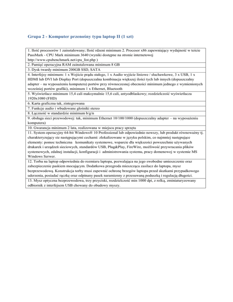 Grupa 2 - Komputer przenośny typu laptop II (1 szt) 1. Ilość procesorów 1 zainstalowany; Ilość rdzeni minimum 2. Procesor x86 zapewniający wydajność w teście PassMark - CPU Mark minimum 3640 (wyniki dostępne na stronie internetowej http://www.cpubenchmark.net/cpu_list.php ) 2. Pamięć operacyjna RAM zainstalowana minimum 8 GB 3. Dysk twardy minimum 200GB SSD, SATA 4. Interfejsy minimum: 1 x Wejście prądu stałego, 1 x Audio wyjście liniowe / słuchawkowe, 3 x USB, 1 x HDMI lub DVI lub Display Port (dopuszczalna kombinacja większej ilości tych lub innych (dopuszczalny adapter – na wyposażeniu komputera) portów przy równoczesnej obecności minimum jednego z wymienionych wcześniej portów grafiki), minimum 1 x Ethernet, Bluetooth 5. Wyświetlacz minimum 15,4 cali maksymalnie 15,6 cali, antyodblaskowy; rozdzielczość wyświetlacza 1920x1080 (FHD) 6. Karta graficzna tak, zintegrowana 7. Funkcje audio i wbudowane głośniki stereo 8. Łączność w standardzie minimum b/g/n 9. obsługa sieci przewodowej: tak, minimum Ethernet 10/100/1000 (dopuszczalny adapter – na wyposażeniu komputera) 10. Gwarancja minimum 2 lata, realizowana w miejscu pracy sprzętu 11. System operacyjny 64-bit Windows® 10 Professional lub odpowiednio nowszy, lub produkt równoważny tj. charakteryzujący sie następującymi cechami: zlokalizowane w języku polskim, co najmniej następujące elementy: pomoc techniczna komunikaty systemowe, wsparcie dla większości powszechnie używanych drukarek i urządzeń sieciowych, standardów USB, Plug&Play, FireWire, możliwość przywracania plików systemowych, zdalnej instalacji, konfiguracji i administrowania systemu, pracy domenowej w systemie MS Windows Serwer. 12. Torba na laptop odpowiednia do rozmiaru laptopa, pozwalająca na jego swobodne umieszczenie oraz zabezpieczenie paskiem mocującym. Dodatkowa przegroda mieszcząca zasilacz do laptopa, mysz bezprzewodową. Konstrukcja torby musi zapewnić ochronę brzegów laptopa przed skutkami przypadkowego uderzenia, posiadać rączkę oraz odpinany pasek naramienny z przesuwaną poduszką i regulacją długości. 13. Mysz optyczna bezprzewodowa, trzy przyciski, rozdzielczość min 1000 dpi, z rolką, zminiaturyzowany odbiornik z interfejsem USB chowany do obudowy myszy.