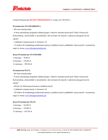 magazyn o wychowaniu i edukacji dzieci Cennik Prenumeraty BLIŻEJ PRZEDSZKOLA ważny od 1.09.2016 r. Prenumerata STANDARDOWA - 80 stron miesięcznika - 8 stron autorskiego programu edukacyjnego i szkiców metodycznych prof. Edyty GruszczykKolczyńskiej „Sześciolatki w przedszkolu. Jak rozwijać ich umysły i należycie przygotować do szkoły” - 5 plakatów tematycznych w formacie A2 - 15 kodów do bezpłatnego pobierania pomocy dydaktycznych, podkładów muzycznych i scenariuszy zajęć ze strony www.blizejprzedszkola.pl Koszt Prenumeraty STANDARD: 3 miesiące – 78,00 zł 6 miesięcy – 156,00 zł 12 miesięcy – 299,50 zł Prenumerata PLUS: - 80 stron miesięcznika - 8 stron autorskiego programu edukacyjnego i szkiców metodycznych prof. Edyty GruszczykKolczyńskiej „Sześciolatki w przedszkolu. Jak rozwijać ich umysły i należycie przygotować do szkoły” - 60 kart A4 foliowanych pomocy dydaktycznych - 5 plakatów tematycznych w formacie A2 - 30 kodów do bezpłatnego pobierania pomocy dydaktycznych, podkładów muzycznych i scenariuszy zajęć ze strony www.blizejprzedszkola.pl Koszt Prenumeraty PLUS: 3 miesiące – 162,00 zł 6 miesięcy – 324,00 zł 12 miesięcy – 635,50 zł CEBP 24.12 Sp. z o.o. 30-437 Kraków, ul. Kwiatowa 3, tel. 12 631 04 10, fax. 12 262 50 34, NIP: 6793096735 KRS nr 0000487975 www.blizejprzedszkola.pl, e-mail: [email protected] magazyn o wychowaniu i edukacji dzieci Prenumerata 12-miesięczna zawiera 10 numerów + magazyn specjalny (obejmujący dwa miesiące: lipiec-sierpień). Magazyn specjalny 7-8/2016 zawiera: - 132 strony miesięcznika - 100 kart A4 foliowanych pomocy dydaktycznych - 10 plakatów tematycznych w formacie A2 - 30 kodów do bezpłatnego pobierania pomocy dydaktycznych, podkładów muzycznych i scenariuszy zajęć ze strony www.blizejprzedszkola.pl Koszt wpisany do prenumeraty STANDARD: MAGAZYN SPECJALNY miesięcznik w prenumeracie STANDARD: 52 zł; Koszt wpisany do prenumeraty PLUS: MAGAZYN SPECJALNY miesięcznik w prenumeracie PLUS: 108 zł; Istnieje możliwość PŁATNOŚCI ABONAMENTOWEJ (płacę co miesiąc). Prenumerata przyjmowana jest na 12 miesięcy z możliwością wcześniejszej rezygnacji. Prenumerata STANDARDOWA – 26,00 zł (12 x 26 zł = 312,00 zł), prenumerata PLUS – 54 zł (12 x 54 zł = 648,00 zł). WAŻNE: W skład prenumeraty abonamentowej 12-miesięcznej wchodzi 10 numerów + magazyn specjalny (obejmujący dwa miesiące: lipiec-sierpień). CEBP 24.12 Sp. z o.o. 30-437 Kraków, ul. Kwiatowa 3, tel. 12 631 04 10, fax. 12 262 50 34, NIP: 6793096735 KRS nr 0000487975 www.blizejprzedszkola.pl, e-mail: [email protected]