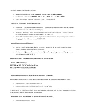 zamówić turnus rehabilitacyjny można :  Bezpośrednio w siedzibie biura ,,Włókniarz” 76-270 Ustka , ul. Wczasowa 15  Telefonicznie pod numerem 59 8 147 069 lub 59 8 144 424 , tel. kom. 727 540 007  Drogą elektroniczną wysyłając wiadomość e-mail : [email protected] dokumenty , które należy niezwłocznie odesłać :  Kserokopię "Orzeczenia o niepełnosprawności” i kserokopię wypełnionego przez lekarza "Wniosku lekarza o skierowanie na turnus rehabilitacyjny”,  Wypełniony i podpisany druk: "Informacja o wyborze turnusu rehabilitacyjnego” - dotyczy wyłącznie uczestników ubiegających się o dofinansowanie z MOPS/PCPR,  Oryginał druku "Informacji o wysokości przyznanego dofinansowania” - dotyczy wyłącznie uczestników ubiegających się o dofinansowanie z MOPS/PCPR. płatności za turnus rehabilitacyjny :  Zaliczka - płatna na rachunek bankowy ,,Włókniarz” w ciągu 10 dni od dnia dokonania Rezerwacji. Dopłata - płatna w pierwszym dniu po przyjeździe  Osoby korzystające z dofinansowania pomniejszają kwotę dopłaty o wysokość przyznanego dofinansowania z MOPS/PCPR. Rachunek na który należy dokonać wpłaty na turnus rehabilitacyjny Konto bankowe firmy: PPUH DANEX OWR Włókniarz Ustka 90 9315 0004 0006 5605 2000 0010 fakturę za pobyt na turnusie rehabilitacyjnym uczestnik otrzymuje : Uczestnik otrzymuje fakturę za pobyt na turnusie rehabilitacyjnym po dokonaniu pełnej wpłaty za turnus:  Podczas trwania turnusu rehabilitacyjnego lub  zakończeniu turnusu rehabilitacyjnego listownie Pocztą Polską. Wszelkie uwagi do treści wystawianych faktur należy zgłaszać najpóźniej na 30 dni przed rozpoczęciem turnusu. W terminie późniejszym uwagi nie będę uwzględniane. Dokumenty , które należy zabrać ze sobą na turnus rehabilitacyjny :  Potwierdzenie dokonania zaliczki  Wypełniony i podstemplowany przez lekarza druk: "Informacja o stanie zdrowia”,  Wypełniony i podstemplowany przez lekarza druk: "Wniosek lekarza o skierowanie na turnus rehabilitacyjny” lub kserokopię "Orzeczenia o niepełnosprawności”. W przypadku nie okazania na turnusie rehabilitacyjnym w/wym. dokumentów, Ośrodek dolicza 8% podatku VAT z tytułu pobytu wypoczynkowego.