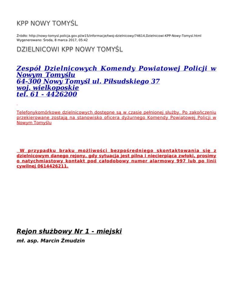 KPP NOWY TOMYŚL Źródło: http://nowy-tomysl.policja.gov.pl/w15/informacje/twoj-dzielnicowy/74614,Dzielnicowi-KPP-Nowy-Tomysl.html Wygenerowano: Środa, 8 marca 2017, 05:42 DZIELNICOWI KPP NOWY TOMYŚL Zespół Dzielnicowych Komendy Powiatowej Policji w Nowym Tomyślu 64-300 Nowy Tomyśl ul. Piłsudskiego 37 woj. wielkoposkie tel. 61 - 4426200 Telefonykomórkowe dzielnicowych dostępne są w czasie pełnionej służby. Po zakończeniu przekierowane zostają na stanowisko oficera dyżurnego Komendy Powiatowej Policji w Nowym Tomyślu W przypadku braku możliwości bezpośredniego skontaktowania się z dzielnicowym danego rejony, gdy sytuacja jest pilna i niecierpiąca zwłoki, prosimy o natychmiastowy kontakt pod całodobowy numer alarmowy 997 lub po linii cywilnej 0614426211. Rejon służbowy Nr 1 - miejski mł. asp. Marcin Żmudzin tel. 061 - 4426240 tel. kom. służbowy 516953031 email: [email protected] swoim zasięgiem obejmuje: ulice: 3 Stycznia,Działkowa, Janusa, Osiedle Północ, Rodzinne Ogrody Działkowe, Rondo Osiedlowe, Wiatrakowa, Zbąszyńska, Zielona, Rodzinne Ogrody Działkowe im. Karola Świerczewskiego. Rejon służbowy Nr 2 - miejski mł. asp. Sebastian Mazur tel. 061 - 4426240 tel. kom. służbowy 786936352 email: [email protected] swoim zasięgiem obejmuje: ulice: Agrestowa,Celna, Jagodowa, Jeżynowa, Kolejowa, Leśna, Lipowa, Malinowa, Musiała, Osiedle Stefana Batorego, Plac Dworcowy, Poziomkowa, Rondo Dworcowe, Rzemieślnicza, Sczanieckiej, Targowa, Truskawkowa, Tysiąclecia, Zachodnia, Zakładowa. Rejon służbowy Nr 3 - miejski mł. asp. Łukasz Woźny tel. 061 - 4426240 tel. kom. służbowy 786936356 email: [email protected] swoim zasięgiem obejmuje: ulice: Akacjowa,Baranowskiego, Bohaterów, Chmielna, Cicha, Daliowa, Długa, Dojazd, Gronowa, Hołogi, Kamienna, Kanałowa, Klonowa, Komunalna, Konopnickiej, Koszykowa, Kościuszki, Krótka, Lawendowa, Łanowa, Łąkowa, Nowa, Osiedlowa, Paprocka, Piaskowa, Polna, Powstańców Wielkopolskich, Półwiejska, Rolna, Różana, Sadowa, Słonecznikowa, Spokojna, Storczykowa,Szpitalna, Ślósarskiego, Śniadeckich, Świerkowa, Wiejska, Wiklinowa, Wodna, Zacisze, Zagrodowa, Zakątek, Zaułek, Zbożowa, Żwirowa Rejon służbowy Nr 4 - miejski mł. asp. Michał Szot tel. 061 - 4426240 tel. kom. służbowy 786936355 email: [email protected] swoim zasięgiem obejmuje: ulice: Asnyka,Barteckiego, Broniewskiego, Brzozowa, Jana Pawła II, Kwiatowa, Mickiewicza, Norwida, Ogrodowa, Olchowa, Piłsudskiego, Plac Chopina, Plac Niepodległości, Poznańska, Radosna, Reymonta, Rondo Kościuszki, Sienkiewicza, Skłodowskiej, Słoneczna, Spacerowa, Szkolna, Topolowa, Tuwima, Wierzbowa, Witosa, Wypoczynkowa Rejon służbowy Nr 5 - wiejski mł. asp. Marek Przybylak tel. 061 - 4426240 tel. kom. służbowy 786936353 email: [email protected] swoim zasięgiem obejmuje: Boruja Kościelna, Boruja Nowa, Glinno, Grubsko, Jastrzębsko Stare, Przyłęk, Sękowo, Szarki, Rodzinne Ogrody Działkowe "Złote Piaski". Rejon służbowy Nr 6 - wiejski st. asp. Leszek Szadura tel. 061 - 4426240 tel. kom. służbowy 786936354 email: [email protected] swoim zasięgiem obejmuje: Bukowiec, Chojniki, Cicha Góra , Kozie Laski, Nowa Róża, Paproć, Róża, Sątopy, Stary Tomyśl, Wytomyśl Ocena: 0/5 (0) Tweetnij