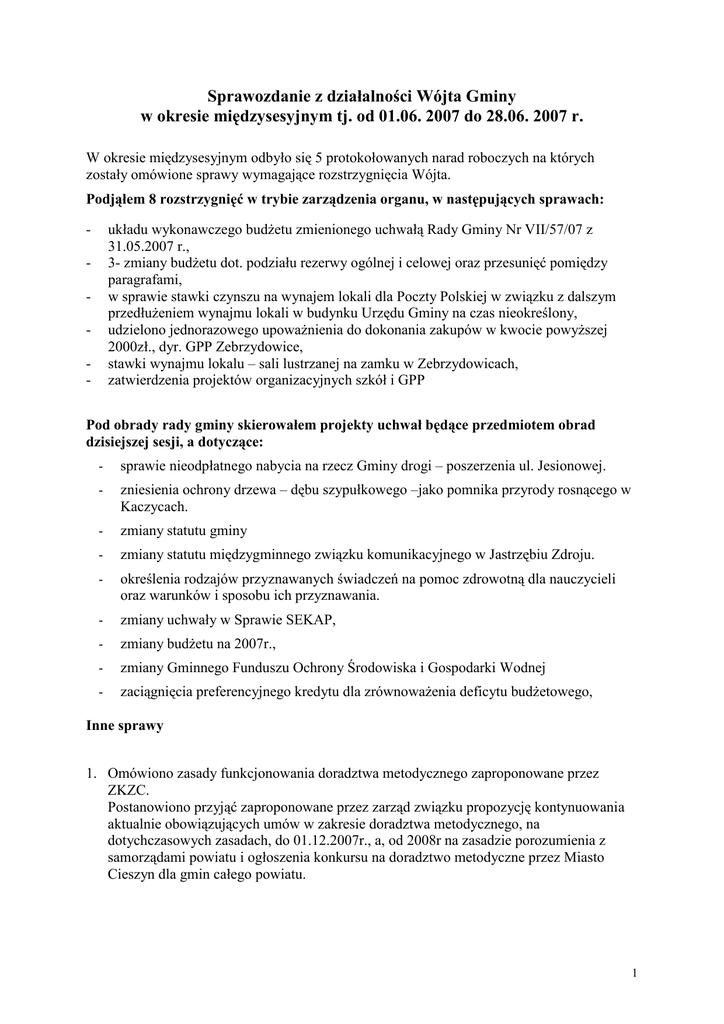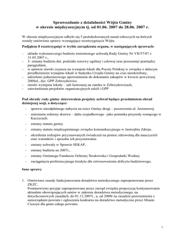 Sprawozdanie z działalności Wójta Gminy w okresie międzysesyjnym tj. od 01.06. 2007 do 28.06. 2007 r. W okresie międzysesyjnym odbyło się 5 protokołowanych narad roboczych na których zostały omówione sprawy wymagające rozstrzygnięcia Wójta. Podjąłem 8 rozstrzygnięć w trybie zarządzenia organu, w następujących sprawach: - układu wykonawczego budŜetu zmienionego uchwałą Rady Gminy Nr VII/57/07 z 31.05.2007 r., 3- zmiany budŜetu dot. podziału rezerwy ogólnej i celowej oraz przesunięć pomiędzy paragrafami, w sprawie stawki czynszu na wynajem lokali dla Poczty Polskiej w związku z dalszym przedłuŜeniem wynajmu lokali w budynku Urzędu Gminy na czas nieokreślony, udzielono jednorazowego upowaŜnienia do dokonania zakupów w kwocie powyŜszej 2000zł., dyr. GPP Zebrzydowice, stawki wynajmu lokalu – sali lustrzanej na zamku w Zebrzydowicach, zatwierdzenia projektów organizacyjnych szkół i GPP - Pod obrady rady gminy skierowałem projekty uchwał będące przedmiotem obrad dzisiejszej sesji, a dotyczące: - sprawie nieodpłatnego nabycia na rzecz Gminy drogi – poszerzenia ul. Jesionowej. - zniesienia ochrony drzewa – dębu szypułkowego –jako pomnika przyrody rosnącego w Kaczycach. - zmiany statutu gminy - zmiany statutu międzygminnego związku komunikacyjnego w Jastrzębiu Zdroju. - określenia rodzajów przyznawanych świadczeń na pomoc zdrowotną dla nauczycieli oraz warunków i sposobu ich przyznawania. - zmiany uchwały w Sprawie SEKAP, - zmiany budŜetu na 2007r., - zmiany Gminnego Funduszu Ochrony Środowiska i Gospodarki Wodnej - zaciągnięcia preferencyjnego kredytu dla zrównowaŜenia deficytu budŜetowego, Inne sprawy 1. Omówiono zasady funkcjonowania doradztwa metodycznego zaproponowane przez ZKZC. Postanowiono przyjąć zaproponowane przez zarząd związku propozycję kontynuowania aktualnie obowiązujących umów w zakresie doradztwa metodycznego, na dotychczasowych zasadach, do 01.12.2007r., a, od 2008r na zasadzie porozumienia z samorządami powiatu i ogłoszenia konkursu na doradztwo metodyczne przez Miasto Cieszyn dla gmin całego powiatu. 1 2. Wyraziłem zgodę na rozłoŜenie na 4 raty, I rata począwszy lipca opłaty z tyt przekształcenia prawa wieczystego uŜytkowania gruntu w prawo własności dla Państwa z Kaczyc 3. Po rozpatrzeniu wniosków postanowiono wydać zezwolenia na sprzedaŜ napojów alkoholowych dla: a) PPHU „TABAKIERA” – Kornelia Pleń, jednorazowe na Spartakiadzie w dn. 24.06.07 w Kończycach Małych przy ul. Jagiellońskiej 33 b) Piotra Wolińskiego, Restauracja „Pod Lipkami” w Kaczycach przy ul. Sobieskiego 8. c) Tomasza Połednik, PUH „TOMAR”, stacja paliw w Marklowicach Górnych, ul. Mickiewicza 17b d) Zdzisława Kowalskiego „Bar u Zdzicha”, Kaczyce, ul. Tuwima 41. 4. Ogłosiłem wykaz w/s lokalu uŜytkowego połoŜonego w budynkach UG do wynajmu. 5. W ramach akcji informacyjnej dot wymiany dowodów osobistych postanowiłem równieŜ, co miesiąc występować do kolejnej parafii z ogłoszeniem dot wymiany dowodów osobistych. 6. Omówiono wniosek kancelarii Notarialnej J. Krzykała, P.Siemko dot. prawa pierwokupu nieruchomości połoŜonej obrąb Kończyce Małe. Nr działki 1/7 o pow. 0,0678 ha. Postanowiłem nie skorzystać z prawa pierwokupu. 7. W zawiązku z wnioskiem strony zamieszkałej w Kończycach Małych przedłuŜyłem umowę dzierŜawy nieruchomości gruntowej na okres 3 lat. 8. Na wniosek Dyr. GPP wyraziłem zgodę na zatrudnienie na zastępstwo w GPP w związku z urlopem zdrowotnym nauczycielki. 9. Postanowiono nadać bieg Apelowi „ O zaangaŜowanie się władz samorządowych w walkę ze sprzedaŜą wyrobów tytoniowych” przesłane do Gminy w ramach realizacji „programu odpowiedzialnej sprzedaŜy Stop 18” przesłanego przez pełnomocnika rządu ds. współpracy z Samorządem MSWiA Jarosława Zielińskiego. 10. Do Gminy wpłynęła oferta Firmy „ Kończanka” Henryka Gremlika dot. sprzedaŜy lub wydzierŜawienia ujścia wody połoŜonego w Kończycach Małych przy ul. Myśliwskiej. Ofertę skierowałem na posiedzenia komisji Rady Gminy w celu wyraŜenia opinii w tej sprawie. 11. Omówiono pismo w tej sprawie kopalni CSM „Stonawa” w sprawie korekty planów wydobycia złoŜa węgla do roku 2010. Wydobycie zaopiniowano pozytywnie albowiem przewidywane wpływy z tytułu eksploatacji górniczej w stosunku do zamierzonych, określonych w porozumieniu, są mniejsze niŜ pierwotnie przewidywano. 12. Omówiono informację o cieszyńskim rynku pracy za maj 2007, odnotowano dalszy spadek bezrobocia. Utrzymuje się tendencja spadkowa. Aktualnie bezrobocie w powiecie cieszyńskim wynosi 11.% 13. Omówiono dalszy ciąg wniosku o przejęcie przez Gminę odcinka drogi łącznika ulic Agrestowej z Owocową. Postanowiłem ponownie wystąpić do 2 osób z zapytaniem czy wyraŜą zgodę na wydzielenie drogi równieŜ z działki Nr 2/62 w celu likwidacji istniejącego przewęŜenia. 2 14. Do IR i PR w celu zaopiniowania skierowałem wniosek firmy AN-MAR Szopa dot. wydania zgody na montaŜ klimatyzatorów w lokalu na zamku w Kończycach Małych w sali widowiskowej – firma chce sfinansować na własny koszt zakup i montaŜ klimatyzatorów. 15. Na wniosek dyr. Z Szk w Zebrzydowicach wyraziłem zgodę na wolny wstęp na basen dla uczniów szkół podstawowych, gimnazjalnych i ponad gimnazjalnych, zamieszkujących na terenie gminy Zebrzydowice w okresie wakacji od poniedziałku do piątku od godz. 16 – 17 w soboty i niedziele od 14 – 15. 16. Z uwagi na negatywną opinię komisji rady gminy postanowiono nie kierować pod obrady rady gminy projektu uchwały z wniosku starosty Cieszyńskiego dot. dofinansowania rozbudowy szpitala w Cieszynie. 17. Omówiono koncepcje przebudowy skrzyŜowań: 1) Uzgodniono pozytywnie projekt przebudowy skrzyŜowań DW 937 25-2646 w Zebrzydowicach 2) Uzgodniono pozytywnie projekt skrzyŜowania DW 937 z drogą SW-2626 w Kończycach Małych 18. Postanow