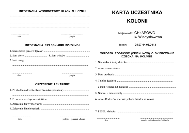 INFORMACJA WYCHOWAWCY KLASY O UCZNIU KARTA UCZESTNIKA ............................................................................................................................................... .............................................................................................................................................. KOLONII .............................................................................................................................................. .............................................................................................................................................. ............................... data ...................................... podpis INFORMACJA PIELĘGNIARKI SZKOLNEJ 1. Szczepienia przeciw tężcowi .................................................................... 2. Stan skóry .................................. 3. Stan włosów ................................... 3. Inne uwagi ............................................................................................... ................................................................................................................. Miejscowość: CHŁAPOWO k/ Władysławowa Termin: 25.07-04.08.2013 WNIOSEK RODZICÓW (OPIEKUNÓW) O SKIEROWANIE DZIECKA NA KOLONIE 1. Nazwisko i imię dziecka ..................................................................... 2. Adres zamieszkania ............................................................................... ............................. data ............................... podpis 3. Data urodzenia ....................................................................................... 4. Telefon Rodzica .................................................................................... ORZECZENIE LEKARSKIE e-mail Rodzica lub Dziecka ...................................................................... 1. Po zbadaniu dziecka stwierdzam (rozpoznanie)....................................... .................................................................................................................. 2. Dziecko może być uczestnikiem .............................................................. 3. Zalecenia dla wychowawcy ..................................................................... 5. Nazwa i adres szkoły ........................................................................... 6. Adres Rodziców w czasie pobytu dziecka na kolonii ……………............................................................................................ 4. Zalecenia dla pielęgniarki ........................................................................ 7. PESEL dziecka ................................................................................... ............................ data ......................................... podpis i pieczęć lekarza .................................. data .................................................. czytelny podpis Rodziców/Opiekunów WARUNKI UCZESTNICTWA NA KOLONIACH 1. Uczestnik kolonii zobowiązany jest uczestniczyć we wszystkich imprezach organizowanych przez wychowawców, stosować się do regulaminu kolonii i ośrodka oraz do poleceń wychowawców. 2. Uczestnik powinien zabrać ze sobą niezbędny ekwipunek (ubrania, obuwie, przybory toaletowe itp.) 3. Organizatorzy nie ponoszą odpowiedzialności materialnej za sprzęt RTV i rzeczy wartościowe uczestników. 4. Uczestnik zobowiązany jest zabrać ze sobą odpowiedni dowód tożsamości (legitymacja szkolna, paszport). 5. W przypadku spożywania alkoholu, przebywania pod jego wpływem lub poważnego naruszenia regulaminu kolonii, uczestnik zostanie wydalony z placówki wypoczynku na koszt własny (Rodziców lub Opiekunów). 6. Uczestnik (Rodzice lub Opiekunowie) ponosi materialną odpowiedzialność za szkody wyrządzone podczas pobytu na kolonii. 7. Wyżej wymienione warunki są integralną częścią umowy kupna-sprzedaży. ........................................................... INFORMACJA RODZICÓW (OPIEKUNÓW) O DZIECKU 1. Nazwisko i imię dziecka ............................................................................................. 2. Przebyte choroby (podać w którym roku życia): odra ............. , ospa ....................... różyczka .............. , świnka ........... , szkarlatyna ............ , żółtaczka zakaźna ............ choroby nerek ............. , choroby reumatyczne .............. , astma ............. , padaczka .............. , inne choroby .............................................................................................. 3. U dziecka występowały w ostatnim roku lub występują obecnie: drgawki, utraty przytomności, zaburzenia równowagi, omdlenia, częste bóle głowy, lęki nocne, trudności w zasypianiu, tiki, moczenia nocne, częste bóle brzucha, wymioty, krwawienia z nosa, przewlekły kaszel (lub katar, anginy), duszność, bóle stawów, szybkie męczenie się, niedosłuch, jąkanie, inne .................................................... 4. Dziecko jest: nieśmiałe, ma trudności w nawiązywaniu kontaktów, nadpobudliwe, inne informacje o usposobieniu i zachowaniu dziecka ...................... ..................................................................................................................................... 5. Dziecko jest uczulone*: tak, nie, jeśli tak podać na co ............................................. .................................................................................................................................... 6. Dziecko nosi*: okulary, aparaty ortodontyczne, wkładki ortopedyczne, inne aparaty .................................................................................................................................... 7. Jazdę samochodem znosi*: dobrze, źle. 8. Inne uwagi o zdrowiu dziecka ................................................................................... podpis 