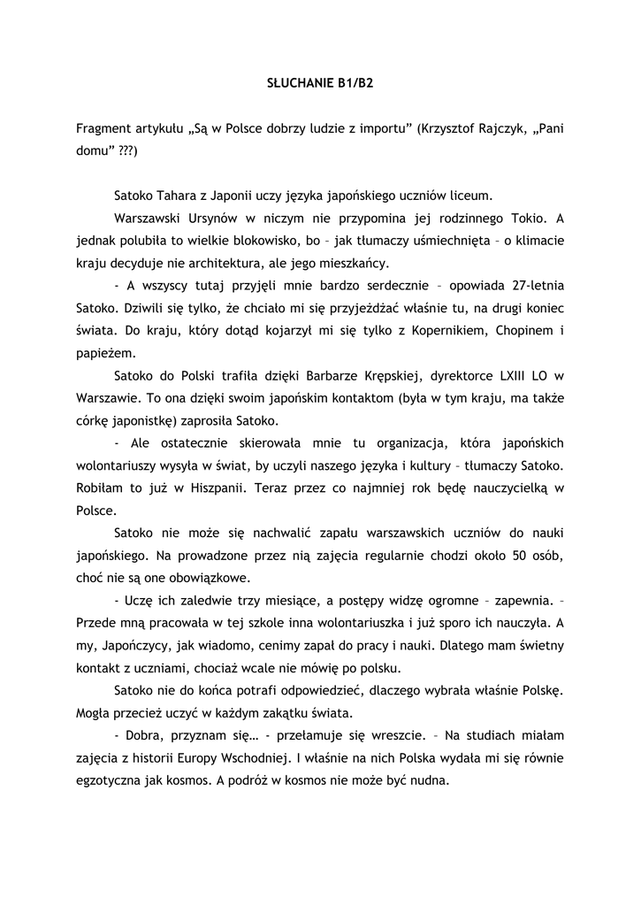 SŁUCHANIE B1/B2 Fragment artykułu „Są w Polsce dobrzy ludzie z importu” (Krzysztof Rajczyk, „Pani domu” ???) Satoko Tahara z Japonii uczy języka japońskiego uczniów liceum. Warszawski Ursynów w niczym nie przypomina jej rodzinnego Tokio. A jednak polubiła to wielkie blokowisko, bo – jak tłumaczy uśmiechnięta – o klimacie kraju decyduje nie architektura, ale jego mieszkańcy. - A wszyscy tutaj przyjęli mnie bardzo serdecznie – opowiada 27-letnia Satoko. Dziwili się tylko, że chciało mi się przyjeżdżać właśnie tu, na drugi koniec świata. Do kraju, który dotąd kojarzył mi się tylko z Kopernikiem, Chopinem i papieżem. Satoko do Polski trafiła dzięki Barbarze Krępskiej, dyrektorce LXIII LO w Warszawie. To ona dzięki swoim japońskim kontaktom (była w tym kraju, ma także córkę japonistkę) zaprosiła Satoko. - Ale ostatecznie skierowała mnie tu organizacja, która japońskich wolontariuszy wysyła w świat, by uczyli naszego języka i kultury – tłumaczy Satoko. Robiłam to już w Hiszpanii. Teraz przez co najmniej rok będę nauczycielką w Polsce. Satoko nie może się nachwalić zapału warszawskich uczniów do nauki japońskiego. Na prowadzone przez nią zajęcia regularnie chodzi około 50 osób, choć nie są one obowiązkowe. - Uczę ich zaledwie trzy miesiące, a postępy widzę ogromne – zapewnia. – Przede mną pracowała w tej szkole inna wolontariuszka i już sporo ich nauczyła. A my, Japończycy, jak wiadomo, cenimy zapał do pracy i nauki. Dlatego mam świetny kontakt z uczniami, chociaż wcale nie mówię po polsku. Satoko nie do końca potrafi odpowiedzieć, dlaczego wybrała właśnie Polskę. Mogła przecież uczyć w każdym zakątku świata. - Dobra, przyznam się… - przełamuje się wreszcie. – Na studiach miałam zajęcia z historii Europy Wschodniej. I właśnie na nich Polska wydała mi się równie egzotyczna jak kosmos. A podróż w kosmos nie może być nudna. ĆWICZENIE 1. Proszę wysłuchać nagrania i zdecydować, które z poniższych zadań jest prawdziwe (P), a które nieprawdziwe (F): 0. Satoko jest nauczycielką japońskiego w Warszawie. (…..) P 1. Satoko twierdzi, że na atmosferę miejsca mają wpływ ludzie. (………) 2. Satoko spotkała się z dużą życzliwością ze strony Polaków. (………) 3. Satoko po raz pierwszy pracuje za granicą. (………) 4. Uczniowie chętnie uczą się japońskiego. (………) 5. W liceum, w którym pracuje Satoko, lekcje japońskiego są obowiązkowe. (………) 6. Satoko uczy się polskiego. (………) 7. Satoko przyjechała do polski, bo miała wrażenie, że to musi być ciekawy kraj. (………) ĆWICZENIE 2. Proszę ponownie wysłuchać nagrania, zaznaczyć błędy w tekście i wpisać poprawne słowo: Satoko Tahara z Japonii uczy języka japońskiego uczniów liceum. Warszawski Ursynów w niczym nie zamienia jej rodzinnego Tokio. A jednak polubiła to wielkie blokowisko, bo – jak tłumaczy usnęła – o klimacie kraju decyduje nie architektura, ale jego młodzieńcy. - A wszyscy tutaj przyjęli mnie bardzo niegrzecznie – opowiada 27-letnia Satoko. Dziwili się tylko, że chciało mi się przyjeżdżać właśnie tu, na drugi brzeg świata. Do kraju, który dotąd zajrzał mi się tylko z Kopernikiem, Chopinem i papieżem. Satoko do Polski trafiła dzięki Barbarze Krępskiej, lektorce LXIII LO w Warszawie. To ona dzięki swoim japońskim kontaktom (była w tym maju, ma także córkę japonistkę) zaprosiła Satoko. - Ale ostatecznie przekonała mnie tu organizacja, która japońskich wolontariuszy wysyła w świat, by uczyli naszego wierszyka i kultury – tłumaczy Satoko. Robiłam to już w Hiszpanii. Teraz przez co mniej rok będę nauczycielką w Polsce. Satoko nie może się nachwalić zapalić warszawskich uczniów do nauki japońskiego. Na prowadzone przez nią zdjęcia regularnie chodzi około 50 osób, choć nie są one obmyślane. - Uczę ich zaledwie trzy miesiące, a postępy widzę ogromne – zapomina. – Przede mną pracowała w tej szkole inna wolontariuszka i już spryt ich nauczyła. A my, Japończycy, jak wiadomo, cenimy zapał do pracy i nawyki. Dlatego mam świetny kontakt z uczniami, chociaż trochę nie mówię po polsku. Satoko nie do końca potrafi mówić, dlaczego wybrała właśnie Polskę. Mogła przecież uczyć w każdym związku świata. - Dobra, przyznam się… - przełamuje się reszta. – Na studiach miałam zajęcia z historii Europy Wschodniej. I właśnie na nich Polska rozdała mi się równie egzotyczna jak kosmos. A przecież w kosmos nie może być nudna. DODATKOWE ĆWICZENIA NA SŁOWNICTWO: ĆWICZENIE 3. Proszę połączyć słowa z odpowiednią definicją: 0. serdecznie x. bardzo miło, ciepło 1. przypominać/przypomnieć a. wyjaśniać/wyjaśnić 2. kierować/skierować b. entuzjazm 3. tłumaczyć/wytłumaczyć c. umieć 4. potrafić d. być podobnym 5. zapał e. wysyłać/wysłać 1. ……………, 2. ……………, 3. ……………, 4. ……………, 5. ……………. ĆWICZENIE 4. Proszę uzupełnić zdania słowami z pierwszej kolumny z poprzedniego ćwiczenia W ODPOWIEDNIEJ FORMIE: 0. Satoko została przyjęta w Polsce bardzo ……………………………………. Serdecznie 1. Nie ……………………………………. Zrobić tego zadania, pomóż mi, proszę. 2. Lekarz ………………………………………..…. Mnie do specjalisty. 3. Jola jest bardzo radosną osobą i zawsze ma tyle …………………………………… do pracy!! 4. Kraków ……………………………………… mi moje rodzinne miasto. 5. Nasz nauczyciel dobrze …………………………………………… problemy gramatyczne. Odpowiedzi: Ćwiczenie 1. 1. P, 2. P, 3. N, 4. P, 5. N, 6. N, 7. P. Ćwiczenie 2. Satoko Tahara z Japonii uczy języka japońskiego uczniów liceum. Warszawski Ursynów w niczym nie zamienia (PRZYPOMINA) jej rodzinnego Tokio. A jednak polubiła to 