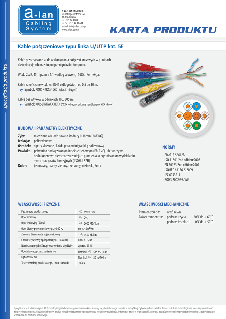 A-LAN TECHNOLOGIE ul. Dobrego Pasterza 36a 31-416 Kraków tel.: 695 02 42 80 tel./fax: (12) 44 31 684 e-mail: [email protected] www.a-lan.com.pl specyfikacja produktu Kable połączeniowe typu linka U/UTP kat. 5E Kable przeznaczone są do wykonywania połączeń krosowych w punktach dystrybucyjnych oraz do połączeń gniazdo-komputer. Wtyki 2 x RJ45, łączenie 1:1 według sekwencji 568B. Konfekcja: Kable zakończone wtykiem RJ45 o długościach od 0,5 do 10 m. Symbol: KKU5KKKX (*KKK - kolor, X - długość) Kable bez wtyków w odcinkach 100, 305 m. Symbol: KIU5LINKAXXXKKK (*XXX - długość odcinka handlowego, KKK - kolor) BUDOWA I PARAMETRY ELEKTRYCZNE Żyły: Izolacja: Ośrodek: Powłoka: Kolor: miedziane wielodrutowe o średnicy 0,18mm (24AWG) polietylenowa 4 pary skręcone , każda para owinięta folią poliestrową polwinit o podwyższonym indeksie tlenowym (FR-PVC) lub tworzywo bezhalogenowe nierozprzestrzeniające płomienia, o ograniczonym wydzielaniu dymu oraz gazów korozyjnych (LSOH, LSZH) jasnoszary, czarny, zielony, czerwony, niebieski, żółty WŁAŚCIWOŚCI FIZYCZNE Opór izolacyjny (500V) Opór bierny pojemnościowy przy 800 Hz nom. 48 nF/km Zmienny bierny opór pojemnościowy ≤1500 pF/km Charakterystyczny opór pozorny (1-100MHz) (100 ± 15) Ω Nominalna prędkość rozprzestrzeniania się (NVP) approx. 67 % Opóźnione rozprzestrzenianie się Nominal ≤535 ns/100m Kąt opóźnienia Nominal ≤20 ns/100m Tester instalacji pradu stałego, 1min. (Rdzeń) 1000 V Opór zmienny - EIA/TIA 586A/B - ISO 11801 2nd edition:2008 - EN 50173 2nd edition:2007 - ISO/IEC 61156-5:2009 - IEC 60332-1 - ROHS 2002/95/WE WŁAŚCIWOŚCI MECHANICZNE ≤190 Ω /km ≤2% ≥2000 MΩ *km Pętla oporu prądu stałego NORMY Promień zgięcia: 4 x Ø zewn. Zakres temperatur: podczas użycia -20°C do + 60°C podczas instalacji 0°C do + 50°C Specyfikacja jest własnością A-LAN Technologie i jest chroniona prawem autorskim. Staramy się, aby informacje zawarte w specyfikacji były dokładne i rzetelne. Jednakże A-LAN Technologie nie może zagwarantować, że specyfikacja nie posiada żadnych błędów a także nie zobowiązuje się do ponoszenia za nie odpowiedzialności. Informacje zawarte w tej specyfikacji mogą zostać zmienione bez powiadomienia i nie są zobowiązujące w stosunku do produktu końcowego. specyfikacja produktu Specyfikacja jest własnością A-LAN Technologie i jest chroniona prawem autorskim. Staramy się, aby informacje zawarte w specyfikacji były dokładne i rzetelne. Jednakże A-LAN Technologie nie może zagwarantować, że specyfikacja nie posiada żadnych błędów a także nie zobowiązuje się do ponoszenia za nie odpowiedzialności. Informacje zawarte w tej specyfikacji mogą zostać zmienione bez powiadomienia i nie są zobowiązujące w stosunku do produktu końcowego.
