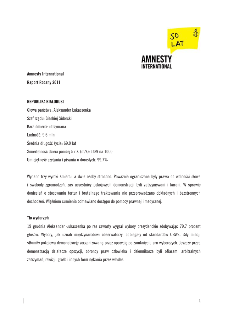 Amnesty International Raport Roczny 2011 REPUBLIKA BIAŁORUSI Głowa państwa: Aleksander Łukaszenka Szef rządu: Siarhiej Sidorski Kara śmierci: utrzymana Ludność: 9.6 mln Średnia długość życia: 69.9 lat Śmiertelność dzieci poniżej 5 r.ż. (m/k): 14/9 na 1000 Umiejętność czytania i pisania u dorosłych: 99.7% Wydano trzy wyroki śmierci, a dwie osoby stracono. Poważnie ograniczane były prawa do wolności słowa i swobody zgromadzeń, zaś uczestnicy pokojowych demonstracji byli zatrzymywani i karani. W sprawie doniesień o stosowaniu tortur i brutalnego traktowania nie przeprowadzano dokładnych i bezstronnych dochodzeń. Więźniom sumienia odmawiano dostępu do pomocy prawnej i medycznej. Tło wydarzeń 19 grudnia Aleksander Łukaszenka po raz czwarty wygrał wybory prezydenckie zdobywając 79.7 procent głosów. Wybory, jak uznali międzynarodowi obserwatorzy, odbiegały od standardów OBWE. Siły milicji stłumiły pokojową demonstrację zorganizowaną przez opozycję po zamknięciu urn wyborczych. Jeszcze przed demonstracją działacze opozycji, obrońcy praw człowieka i dziennikarze byli ofiarami arbitralnych zatrzymań, rewizji, gróźb i innych form nękania przez władze. 1 Kara śmierci Władze Białorusi wyrażały wolę współpracy ze społecznością międzynarodową w kwestii kary śmierci. W lutym powstała parlamentarna grupa robocza ds. kary śmierci. We wrześniu Rząd przyznał przed Radą Praw Człowieka ONZ konieczność zniesienia kary najwyższej. Wyraził wolę ukształtowania opinii publicznej, by poparła wprowadzenie abolicji oraz kontynuowania współpracy ze społecznością międzynarodową. Mimo to, białoruskie sądy nie zaprzestały wydawania wyroków śmierci, a egzekucje nadal się odbywają. W marcu zostali straceni Wasylij Juzepczuk i Andriej Żuk, skazani na śmierć odpowiednio w czerwcu i lipcu 2009 roku. Podobnie jak we wszystkich tego typu przypadkach, ani więźniowie, ani ich rodziny nie zostali z wyprzedzeniem poinformowani o dacie egzekucji. Matka Andrieja Żuka dowiedziała się, że jej syn nie żyje, kiedy 19 marca przyniosła mu do więzienia paczkę z żywnością. Egzekucje odbyły się pomimo faktu, że obydwaj skazani wysyłali wnioski do Komitetu Praw Człowieka ONZ, a 12 października 2009 Komitet poprosił władze Białorusi, by wstrzymały się z egzekucjami do czasu, aż rozpatrzy ich sprawy. 14 marca sąd regionalny w Grodnie skazał na śmierć Olega Griszkowcowa i Andrieja Burdyko – za morderstwo z premedytacją, napad z bronią, podpalenie, uprowadzenie nieletniego, kradzież i rabunek. 17 września 2010 Sąd Najwyższy odrzucił ich apelację. 14 września, sąd rejonowy skazał Ihara Mialika na karę śmierci za serię napadów z bronią i morderstwa popełnione na autostradzie Mohylew-Homel. Drugi oskarżony o te same przestępstwa dostał wyrok dożywocia, trzeci zmarł w areszcie przed rozpoczęciem procesu. Wolność słowa W maju przedstawiciel OBWE ds. wolności mediów wyraził w liście do władz białoruskich zaniepokojenie naciskami wywieranymi na niezależne media i oświadczył, że „zastraszanie dziennikarzy wywiera zły skutek na i tak osłabione dziennikarstwo śledcze na Białorusi.” 3 września znaleziono ciało Alesia Biabenina, wydawcy i założyciela nieoficjalnego portalu informacyjnego Karta’97. Wisiał na poręczy schodów w swojej daczy, ze sznurem owiniętym wokół szyi. Dzień później śledczy na podstawie sekcji zwłok ogłosili przyczynę jego śmierci. Wstępnie uznano, że było to samobójstwo. Oficjalną opinię kwestionują rodzina i znajomi Biabenina, wskazując na wiele nieścisłości w kwestii ułożenia ciała i przypominając, że w przeszłości władze nękały dziennikarza, który na krótko przed śmiercią dołączył do organizatorów kampanii wyborczej Andrieja Sannikau, opozycyjnego kandydata na prezydenta. 2 1 lipca wszedł w życie dekret prezydenta „O środkach mających udoskonalić korzystanie z narodowego sektora internetu”. Dokument m.in. wymaga od dostawców internetu, by sprawdzali tożsamość osób z niego korzystających i udostępniali te informacje władzom. Dekret wprowadził też środki ograniczające dostęp do informacji, które mogą być sklasyfikowane jako ekstremistyczne, pornograficzne, promujące przemoc czy działania niezgodne z prawem. Według studium przeprowadzonego dla OBWE, środki te „prowadzą do bezpodstawnych ograniczeń prawa obywateli do otrzymywania i rozpowszechniania informacji” i dają władzom wyjątkowo szerokie uprawnienia do ograniczania dostępu do określonych źródeł informacji. Wolność zgromadzeń Restrykcyjna “Ustawa o zgromadzeniach masowych” wciąż ogranicza wolność słowa i zgromadzeń. Prawo to wymaga, by uczestnicy demonstracji starali się o zgodę władz lokalnych i określa, że zgromadzenia nie mogą się odbywać w promieniu 200 metrów od stacji metra czy przejścia dla pieszych. Nakłada również na organizatorów manifestacji odpowiedzialność za zapewnienie bezpieczeństwa publicznego, opieki medycznej i posprzątania po zgromadzeniu. Wszystko muszą sami sfinansować. W wyniku tych ograniczeń, wiele podań o zgodę na przeprowadzenie demonstracji było odrzucanych. 8 maja, Miejski Komitet Wykonawczy w Mińsku odmówił wydania zgody na marsz Dumy Słowiańskiej, zaplanowany na 15 maja, ponieważ proponowana trasa wiodła w pobliżu stacji metra oraz przejść dla pieszych, i była to odległość mniejsza niż 200 m. Pomimo zakazu, grupa osób zorganizowała 15 maja marsz. Zatrzymano na weekend ośmiu demonstrantów, pięcioro z nich oskarżono o branie udziału w nielegalnym zgromadzeniu i ukarano grzywną. W większości pokojowa demonstracja po wyborach prezydenckich w wieczór 19 grudnia została brutalnie stłumiona przez milicję. Ponad 700 osób zostało oskarżonych o przestępstwa administracyjne i zatrzymanych na 10-15 dni. Byli oni arbitralnie zatr