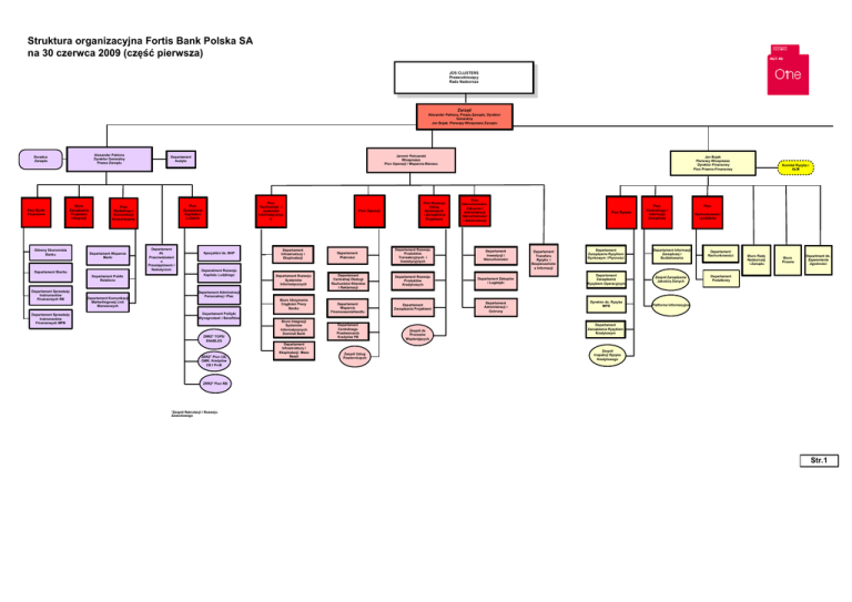 Struktura organizacyjna Fortis Bank Polska SA na 30 czerwca 2009 (część pierwsza) JOS CLIJSTERS Przewodniczący Rada Nadzorcza Zarząd Alexander Paklons, Prezes Zarządu, Dyrektor Generalny Jan Bujak, Pierwszy Wiceprezes Zarządu Alexander Paklons Dyrektor Generalny Prezes Zarządu Doradca Zarządu Pion Rynki Finansowe Biuro Zarządzania Projektem Integracji Główny Ekonomista Banku Departament Skarbu Departament Public Relations Departament SprzedaŜy Instrumentów Finansowych RB Departament SprzedaŜy Instrumentów Finansowych MPB Departament Komunikacji Markertingowej Linii Biznesowych Pion Technologii i systemów Informatycznyc h Pion Zarządzania Kapitałem Ludzkim Pion Marketingu i Komunikacji Korporacyjnej Departament Wsparcia Marki Jaromir Pelczarski Wiceprezes Pion Operacji i Wsparcia Biznesu Departament Audytu Departament ds. Przeciwdziałani u Przestępstwom i NaduŜyciom Specjaliści ds. BHP Deparatment Rozwoju Kapitału Ludzkiego Pion Operacji Pion Rozwoju Usług Bankowych i Zarządzania Projektami Jan Bujak Pierwszy Wiceprezes Dyrektor Finansowy Pion Prawno-Finansowy Pion Nieruchomości, Zakupów i Administracji Nieruchomości i Administracji Departament Infrastruktury i Eksploatacji Departament Platności Departament Rozwoju Produktów Transakcyjnych i Inwestycyjnych Departament Inwestycji i Nieruchomości Departament Rozwoju Systemów Informatycznych Departament Centralnej Obsługi Rachunków Klientów i Reklamacji Departament Rozwoju Produktów Kredytowych Departament Zakupów i Logistyki Departament Wsparcia FinansowaniaHandlu Departament Zarządzania Projektami Departament Administracji i Ochrony Pion Ryzyka Departament Transferu Ryzyka i Bezpieczeństw a Informacji Departament Zarządzania Ryzykiem Rynkowym i Płynności Pion Kontrolingu i Informacji Zarządczej Departament Informacji Zarządczej i BudŜetowania Departament Zarządzania Ryzykiem Operacyjnym Zespół Zarządzania Jakością Danych Dyrektor ds. Ryzyka MPB Platforma Informacyjna Komitet Ryzyka i ALM Pion Rachunkowości i podatków Departament Rachunkowości Biuro Rady Nadzorczej i Zarządu Biuro Prawne Department ds. Zapewnienia Zgodności Departament Podatkowy Departament Adminstracji Personalnej i Płac Biuro Utrzymania Ciągłości Pracy Banku Departament Polityki Wynagrodzeń i Benefitów ZRRZ* TOPS/ ENABLES ZRRZ* Pion CB, GMK, Kredytów CB I PrvB Biuro Integracji Systemów Informatycznych Dominet Bank Departament Infrastruktury i Eksploatacji Mass Retail Departament Centralnego Przetwarzania Kredytów PB Zespół Usług Powierniczych Zespół ds Procesów Wspierających Departament Zarządzania Ryzykiem Kredytowym Zespół Inspekcji Ryzyka Kredytowego ZRRZ* Pion RB *Zespół Rekrutacji i Rozwoju Zawodowego Str.1 Struktura organizacyjna Fortis Bank Polska SA na 30 czerwca 2009 (część druga) JOS CLIJSTERS Przewodniczący Rada Nadzorcza Zarząd Alexander Paklons, Prezes Zarządu, Dyrektor Generalny Jan Bujak, Pierwszy Wiceprezes Zarządu Alexander Paklons Prezes Zarządu Pion Obsługi Małych Przedsiębiorstw i Klientów Indywidualnych (Business Line Retail Banking) Jean-Luc Deguel Wiceprezes Pion Obsługi Średnich i DuŜych Przedsiębiorstw (Business Line Commercial Banking) Thierry Lechien Wiceprezes Pion Kredytów CB Komitet Kredytowy dla CB Pion Bankowości Prywatnej Pion SprzedaŜy RB Dyrektor ds. SprzedaŜy Departament ds.Rozwoju Linii Biznesowej Commercial i Private Banking Departament Finansowania Handlu Biuro Obsługi Klientów CB Dyrektor Regionu BC Północ Dyrektor Regionu BC Południe Departamnet Strategii SME I Personal Banking Departement Kredytów Hipotecznych Departament Planowania i Analiz Biznesowych RB Departament Współpracy z Pośrednikami I Obsługi Kredytów RB Departament Zarządzania Zewnętrzną Siecią SprzedaŜy Dyrektor Regionu Południe Dyrektor Regionu Północ Dyrektor Region Zachód Dyrektor Regionu Centrum Dyrektor Regionu Śląsk Departament Wsparcia I Zarządzania SprzedaŜą Departament SprzedaŜy i Finansów Korporacyjnych Zespół Kredytów Private Banking I O/ Kraków BC Śląsk I O/Bydgoszcz II O/Kraków I O/Szczecin III O/Kraków II O/Szczecin IV O/Kraków I O/Gdynia I Oddział i Filia nr 1 Oddziału Poznań II O/Poznań BC Łódź BC Trójmiasto BC Kraków BC Wrocław Filia nr.1 w Nowym Targu I Oddziału w Zakopanem I O/Zakopane I O/Gdańsk I O/Kielce II O/Gdańsk I O/ Warszawa II Oddział i Filia nr 1 Oddziału/ Warszawa III O/Poznań III O/Warszawa I Oddział i Filia nr 1 Oddziału Wrocław IV O/Warszawa V O/Warszawa II O/Wrocław BC Poznań BC Rzeszów Komitet Kredytowy dla RB Departament Oceny Ryzyka Kredytowego RB Departament Oceny Ryzyka Kredytowego CB Departament Administracji Kredytów CB Departament Ryzyka Kredytowego CB Departament Restrukturyzacji i Windykacji Departament Administracji Kredytów RB Oddziały i Filie Centra Obsługi Średnich i DuŜych Przedsiębiorstw BC Warszawa Pion Kredytów RB Komitet Ryzyka Kredytowego I O/Rzeszów Zespół Strategii i Alokacji Private Banking Departament Ryzyka Kredytowego RB I O/Gliwice Kierownik Projektów Kredytowych RB I O/Częstochowa Zespół Wsparcia Bizesu Private Banking I Oddział i Filia nr 1 Oddziału Katowice I Oddział i Filia nr 1 Oddziału Łódź VII O/Warszawa I O/ Toruń II O/Łódź I O/Opole I O/Olsztyn I O/Bielsko-Biała I O/Pruszków I Oddział Lublin II Oddział Lublin Str.2