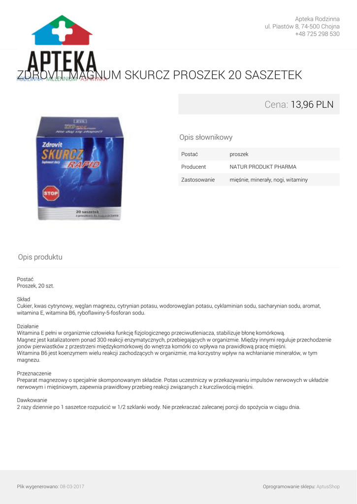 Apteka Rodzinna ul. Piastów 8, 74-500 Chojna +48 725 298 530 ZDROVIT MAGNUM SKURCZ PROSZEK 20 SASZETEK Cena: 13,96 PLN Opis słownikowy Postać proszek Producent NATUR PRODUKT PHARMA Zastosowanie mięśnie, minerały, nogi, witaminy Opis produktu Postać Proszek, 20 szt. Skład Cukier, kwas cytrynowy, węglan magnezu, cytrynian potasu, wodorowęglan potasu, cyklaminian sodu, sacharynian sodu, aromat, witamina E, witamina B6, ryboflawiny-5-fosforan sodu. Działanie Witamina E pełni w organizmie człowieka funkcję fizjologicznego przeciwutleniacza, stabilizuje błonę komórkową. Magnez jest katalizatorem ponad 300 reakcji enzymatycznych, przebiegających w organizmie. Między innymi reguluje przechodzenie jonów pierwiastków z przestrzeni międzykomórkowej do wnętrza komórki co wpływa na prawidłową pracę mięśni. Witamina B6 jest koenzymem wielu reakcji zachodzących w organizmie, ma korzystny wpływ na wchłanianie minerałów, w tym magnezu. Przeznaczenie Preparat magnezowy o specjalnie skomponowanym składzie. Potas uczestniczy w przekazywaniu impulsów nerwowych w układzie nerwowym i mięśniowym, zapewnia prawidłowy przebieg reakcji związanych z kurczliwością mięśni. Dawkowanie 2 razy dziennie po 1 saszetce rozpuścić w 1/2 szklanki wody. Nie przekraczać zalecanej porcji do spożycia w ciągu dnia. Plik wygenerowano: 08-03-2017 Powered by TCPDF (www.tcpdf.org) Oprogramowanie sklepu: AptusShop