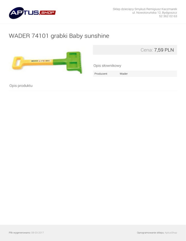Sklep dziecięcy Smykuś Remigiusz Kaczmarek ul. Nowotoruńska 12, Bydgoszcz 52 362 02 63 WADER 74101 grabki Baby sunshine Cena: 7,59 PLN Opis słownikowy Producent Wader Opis produktu Plik wygenerowano: 08-03-2017 Powered by TCPDF (www.tcpdf.org) Oprogramowanie sklepu: AptusShop