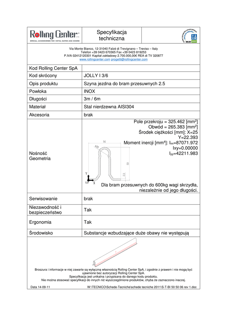 ] Specyfikacja techniczna Via Monte Bianco, 12-31040 Falzé di Trevignano – Treviso – Italy Telefon +39 0423 670365 Fax +39 0423 819253 P.IVA 02412120301 Kapitał zakładowy 2.700.000,00€ REA di TV 320877 www.rollingcenter.com [email protected] Kod Rolling Center SpA Kod skrócony JOLLY I 3/6 Opis produktu Szyna jezdna do bram przesuwnych 2.5 Powłoka INOX Długości 3m / 6m Materiał Stal nierdzewna AISI304 Akcesoria brak Pole przekroju = 325.462 [mm2] Obwód = 265.383 [mm2] Środek ciężkości [mm]: X=25 Y=22.393 4 Moment inercji [mm ]: Ixx=87071.972 Ixy=0.00000 Iyy=42211.983 Nośność Geometria Dla bram przesuwnych do 600kg wagi skrzydła, niezależnie od jego długości. Serwisowanie brak Niezawodność i bezpieczeństwo Tak Ergonomia Tak Środowisko Substancje wzbudzające duże obawy nie występują Broszura i informacje w niej zawarte są wyłączną własnością Rolling Center SpA, i zgodnie z prawem i nie mogą być ujawnione bez autoryzacji Rolling Center SpA. Specyfikacja jest unikalna i przypisana do danego kodu produktu. Nie można stosować specyfikacji do innych niż wyszczególnione produktów, chyba że zaznaczono inaczej. Data 14-09-11 W:\TECNICO\Schede-Tecniche\schede tecniche 2011\S-T-BI 50 50 06 rev 1.doc