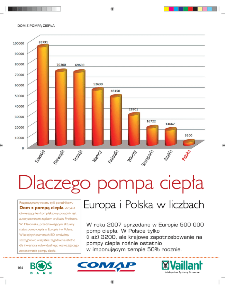 DOM Z POMPk CIEPA Dlaczego pompa ciepïa Rozpoczynamy roczny cykl poradnikowy Dom z pompÈ ciepïa. Artykuï Europa i Polska w liczbach otwierajÈcy ten kompleksowy poradnik jest autoryzowanym zapisem wykïadu Profesora W. Marciniaka, przedstawiajÈcym aktualny status pomp ciepïa w Europie i w Polsce. W kolejnych numerach BD omówimy szczegóïowo wszystkie zagadnienia istotne dla inwestora indywidualnego rozwaĝajÈcego zastosowanie pompy ciepïa. 164 W roku 2007 sprzedano w Europie 500 000 pomp ciepïa. W Polsce tylko (i aĝ) 3200, ale krajowe zapotrzebowanie na pompy ciepïa roĂnie ostatnio w imponujÈcym tempie 50% rocznie. Dlaczego pompa ciepïa Dlaczego zaczynamy nasz cykl poradnikowy od liczb, od porównañ Polski z EuropÈ? Bo ĝaden argument nie dziaïa tak silnie jak przykïad innych (teoria „owczego pÚdu”). Opowiadaï mi Martin Forsén – szef zarówno szwedzkiego stowarzyszenia pomp ciepïa jak i europejskiego EHPA – ĝe w Szwecji przeïomowe przyĂpieszenie zamówieñ na pompy ciepïa (p.c.) obserwowano w tych okolicach, gdzie liczba domów z p.c. przekraczaïa 10%. Przy takim nasyceniu p.c. u sÈsiadów inni teĝ chcÈ to mieÊ (neighbour effect). Obecnie w Szwecji 95% nowo budowanych domów ma p.c. W Polsce ten wskaěnik moĝna szacowaÊ na 2–3%. Dlaczego p.c. osiÈga tak wielkÈ popularnoĂÊ? SÈ dwa podstawowe powody: To najtañszy sposób pozyskiwania energii cieplnej do ogrzewania domu i c.w.u., choÊ niskie wydatki eksploatacyjne trzeba okupiÊ doĂÊ znacznym kosztem inwestycji (w Europie ten koszt jest kompensowany systemem ulg i zachÚt finansowych). To proekologiczne rozwiÈzanie ogrzewania domu i c.w.u., co w Europie jest bardzo waĝkim argumentem, a w Polsce niekoniecznie. Z obu tych powodów Europa stawia na pompy ciepïa, a Polska – z odroczonym na parÚ lat „wyrokiem” ekologicznym – teĝ musi zdaÊ sobie wreszcie sprawÚ, ĝe... leĝy w Europie. nano jesieniÈ 2008 roku, zatem przy niestabilnoĂci cen na surowce w ostatnim okresie mogÈ wymagaÊ korekty, ale tylko korekty – istota obserwowanych relacji pozostaje w mocy. Zatem celowoĂÊ stosowania Tanio a nawet drogo W jakim czasie zwrócÈ siÚ znaczne wydatki inwestycyjne? Przy porównaniu z kotïem na gaz ziemny bÚdzie to okres dïuĝszy. Ale koszt inwestycji, zwykle szacowany na 30–70 tys. zï, silnie zaleĝy od rodzaju systemu pompy ciepïa. Dlatego pytanie o czas zwrotu wydatków in- Europa juĝ wybraïa... We believe that heat pumps will be one of the most important Technologies for the European countries to meet their Kyoto commitments. The present market increase in Europe is only the beginning of the beginning. We believe that the European market for heat pump will be ten-folded in less than ten years from now Martin Forsén President, Swedish Heat Pump Association Chair, Strategy Comittee, European Heat Pump Association … a Polska leĝy w Europie pompy ciepïa ze wzglÚdu na niskie koszty ogrzewania nie budzi ĝadnych wÈtpliwoĂci. Pozostaje jednak kluczowe pytanie: westycyjnych ma sens tylko wówczas, gdy okreĂlimy konkretny rodzaj systemu p.c. Ustalmy, o czym mówimy Porównanie kosztów ogrzewania i c.w.u. dla róĝnych systemów grzewczych (rys. 2) wyraěnie pokazuje, ĝe ogrzewanie domu pompÈ ciepïa jest najtañsze. NajwiÚksze oszczÚdnoĂci eksploatacyjne, siÚgajÈce 7000 zï rocznie daje zainstalowanie p.c. zamiast kotïa olejowego lub kotïa na gaz pïynny. W porównaniu z kotïem na gaz ziemny róĝnica jest mniejsza, rzÚdu 2.500–3.000 zï. Obliczenia zaprezentowane na rys. 2 wyko- I tutaj padajÈ róĝne odpowiedzi: 5 lat, 15 lat, a nawet 30 lat i wiÚcej. Kaĝda z tych odpowiedzi moĝe byÊ prawdziwa. Zaleĝy co z czym porównujemy. JeĂli porównujemy instalacjÚ p.c. z instalacjÈ z kotïem olejowym, to przy rocznych oszczÚdnoĂciach ok. 7000 zï, nawet wiÚksze o 30–40 000 zï koszty inwestycyjne zwrócÈ siÚ w 5 lat. Rys. 2. Porównanie rocznych kosztów ogrzewania i c.w.u. dla domu 150 m2 zamieszkaïego przez 4 osoby Czym jest pompa ciepïa? To urzÈdzenie dziaïajÈce identycznie jak lodówka, tyle ĝe ciepïo odebrane z tzw. dolnego ěródïa (grunt, woda, powietrze) jest wykorzystywane do ogrzewania pomieszczeñ i ciepïej wody uĝytkowej. ½ródïo ciepïa (czyli tzw. dolne ěródïo) ma temperaturÚ niĝszÈ (np. woda gruntowa ma temperaturÚ ok. 10°C) niĝ wynosi temperatura górnego ěródïa (np. temperatura wody w instalacji podïogowej – ok. 30°C). Zatem transport ciepïa odbywa siÚ w kierunku sprzecznym z naturalnym biegiem rzeczy – od ciaïa zimniejszego do cieplejszego. Ten transport ciepïa „pod górkÚ” (rys. 3) wykonuje pompa ciepïa, a wïaĂciwie agregat sprÚĝarkowy stanowiÈcy jej serce (rys. 4). ZuĝywajÈc 1 kWh energii elektrycznej p.c. „przepompowuje” z dolnego ěródïa do pomieszczeñ 2–4 kWh energii cieplnej, a wiÚc efektywnie dostarcza 3–5 kWh energii cieplnej. Moĝna wiÚc przyjÈÊ, ĝe ¾ ciepïa ogrzewajÈcego dom pochodzi z energii sïonecznej (skumulowanej w ziemi, wodzie lub powietrzu), a tylko ¼ z elektrowni. Inaczej 165 DOM Z POMPk CIEPA Rys. 3. Istota dziaïania pompy ciepïa Rys. 4. Schemat dziaïania pompy ciepïa • Powietrze – powietrze (klimatyzatory z grzaniem p.c.) (p.c. z klimakonwektorami) • Powietrze – woda • Bezporednie odparowanie – bezporednie skraplanie • Bezporednie odparowanie – woda • Woda – woda • Solanka – woda kolektor poziomy • Solanka – woda kolektor pionowy Rys. 5. Koszt inwestycji w zaleĝnoĂci od rodzaju systemu p.c. 166 10.000 z 70.000 z mówiÈc, jeĂli ogrzewamy dom prÈdem, to zastosowanie p.c. pozwala czterokrotnie obniĝyÊ rachunki za prÈd. Przy obecnych cenach oleju i gazu jest to równieĝ ogrzewanie ponad 4 razy tañsze niĝ olejem i ponad 2 razy tañsze niĝ gazem ziemnym. Jest to obecnie najtañsze ogrzewanie w Polsce, tañsze nawet niĝ ogrzewanie wÚglem. Po tych podstawowych informacjach moĝemy scharakteryzowaÊ po