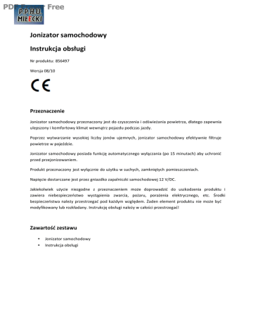 www.conrad.pl Jonizator samochodowy Instrukcja obsługi Nr produktu: 856497 Wersja 08/10 Przeznaczenie Jonizator samochodowy przeznaczony jest do czyszczenia i odświeżania powietrza, dlatego zapewnia ulepszony i komfortowy klimat wewnątrz pojazdu podczas jazdy. Poprzez wytwarzanie wysokiej liczby jonów ujemnych, jonizator samochodowy efektywnie filtruje powietrze w pojeździe. Jonizator samochodowy posiada funkcję automatycznego wyłączania (po 15 minutach) aby uchronić przed przejonizowaniem. Produkt przeznaczony jest wyłącznie do użytku w suchych, zamkniętych pomieszczeniach. Napięcie dostarczane jest przez gniazdko zapalniczki samochodowej 12 V/DC. Jakiekolwiek użycie niezgodne z przeznaczeniem może doprowadzić do uszkodzenia produktu i zawiera niebezpieczeństwo wystąpienia zwarcia, pożaru, porażenia elektrycznego, etc. Środki bezpieczeństwa należy przestrzegać pod każdym względem. Żaden element produktu nie może być modyfikowany lub rozkładany. Instrukcję obsługi należy w całości przestrzegać! Zawartość zestawu • Jonizator samochodowy • Instrukcja obsługi Strona 1 z 4 Dystrybucja Conrad Electronic Sp. z o.o., ul. Kniaźnina 12, 31-637 Kraków, Polska Copyright © Conrad Electronic 2010, Kopiowanie, rozpowszechnianie, zmiany bez zgody zabronione. www.conrad.pl www.conrad.pl Symbole Wykrzyknik w trójkącie oznacza w tej instrukcji obsługi ważne informacje, których należy ściśle przestrzegać. Symbol błyskawicy w trójkącie ostrzega przed porażeniem elektrycznym lub niższym bezpieczeństwem elektrycznym urządzenia. Symbol dłoni wskazuje poszczególne informacje i porady dotyczące obsługi urządzenia. Środki bezpieczeństwa W przypadku wystąpienia szkód, które zostały spowodowane przez nieprzestrzeganie zaleceń występujących w niniejszej instrukcji, wygasa gwarancja producenta. Przedsiębiorstwo nie ponosi odpowiedzialności za szkody materialne i uszczerbek na zdrowiu wynikające z nieodpowiedniego użytkowania produktu, tudzież nieprzestrzegania zasad bezpieczeństwa. W takich przypadkach gwarancja wygasa automatycznie. • Ze względów bezpieczeństwa oraz licencyjnych (CE), nieautoryzowana modyfikacja i/lub przekształcenie produktu jest niedozwolona i spowoduje wygaśnięcie gwarancji. • Należy przestrzegać dodatkowych środków bezpieczeństwa zawartych w instrukcjach obsługi jakichkolwiek urządzeń podłączonych do produktu. • • Nie eksploatuj produktu gdy jest zakryty. Należy unikać silnego nacisku mechanicznego i nie narażać produktu na skrajne temperatury, silne wibracje. • • Napięcie dostarczane jest przez zapalniczkę samochodową 12 V/DC. Przy szybkich zmianach w temperaturze, produkt wymaga czasu do dostosowania się do otaczającej temperatury. Poczekaj aż produkt osiągnie temperaturę otoczenia przed uruchomieniem. • Urządzenia elektroniczne to nie zabawki i powinny być trzymane z dala od dzieci! • Jeśli posiadasz jakiekolwiek wątpliwości dotyczące działania urządzenia lub wykonania bezpiecznego podłączenia, skonsultuj się ze specjalistą. • Nie pozostawiaj opakowania produktu bez nadzoru. Torby plastikowe, etc. mogą stać się niebezpiecznymi zabawkami dla dzieci, istnieje ryzyko uduszenia. Strona 2 z 4 Dystrybucja Conrad Electronic Sp. z o.o., ul. Kniaźnina 12, 31-637 Kraków, Polska Copyright © Conrad Electronic 2010, Kopiowanie, rozpowszechnianie, zmiany bez zgody zabronione. www.conrad.pl www.conrad.pl • Jeśli istnieje powód, aby myśleć że bezpieczna praca urządzenia nie jest możliwa, urządzenie musi zostać odłączone i zabezpieczone przed niezamierzonym włączeniem. Można założyć, że bezpieczne użytkowanie nie może być zapewnione, gdy: -urządzenie jest widocznie uszkodzone, -nie działa, -było przechowywane przez długi okres czasu w niesprzyjających warunkach, -zostało poddane znacznemu naciskowi podczas transportu. • Produkt przeznaczony jest wyłącznie do użytku w suchych pomieszczeniach zamkniętych. Nie może ulec zamoczeniu lub zawilgoceniu. • Osoby chore na astmę lub choroby płuc powinny skonsultować się z lekarzem przed uruchomieniem produktu w celu upewnienia się, ze produkt nie wpłynie negatywnie na ich zdrowie. Nigdy nie nalewaj nad urządzeniami elektrycznymi żadnych płynów. Istnieje niebezpieczeństwo wystąpienia pożaru lub śmiertelnego porażenia prądem. • • Naprawy urządzenia może dokonać tylko wykwalifikowany personel lub odpowiedni serwis. • Jeśli powstaną jakiekolwiek pytania, na które nie ma odpowiedzi w niniejszej instrukcji obsługi, skontaktuj się z naszym Wsparciem technicznym lub innym ekspertem. Uruchomienie Produkt nie może być eksploatowany w miejscu rozkładania się poduszek powietrznych, gdyż może to wywołać obrażenia pasażerów w przypadku wypadku. Dlatego, należy zabezpieczyć produkt w miejscu, w którym nie będzie stwarzać zagrożenia dla pasażerów. • Podłącz wtyczkę jonizatora samochodowego do gniazdka zapalniczki samochodowej (wyłącznie 12 V/DC) swojego pojazdu. • Zatwierdź przyciskiem znajdującym się na jonizatorze samochodowym. Dioda LED statusu zaczyna migać na niebiesko co 5 sekund. Jonizator samochodowy jest teraz uruchomiony i wyłączy się automatycznie po 15 minutach aby zapobiec przejonizowaniu. Po 15 minutach, naciśnij ponownie przycisk na obudowie jonizatora aby go włączyć. Wymiana bezpiecznika (typ: 250 V 5F500mA L) Aby poprawnie wymienić bezpiecznik, postępuj zgodnie z poniższymi krokami: • Wyjmij jonizator samochodowy z gniazdka zapalniczki samochodowej. Strona 3 z 4 Dystrybucja Conrad Electronic Sp. z o.o., ul. Kniaźnina 12, 31-637 Kraków, Polska Copyright © Conrad Electronic 2010, Kopiowanie, rozpowszechnianie, zmiany bez zgody zabronione. www.conrad.pl www.conrad.pl • Odkręć przednią nasadkę. • Wyjmij uszkodzony bezpiecznik. • • Włóż nowy bezpiecznik typu 250 V 5F500mA L Przykręć z powrotem nasad