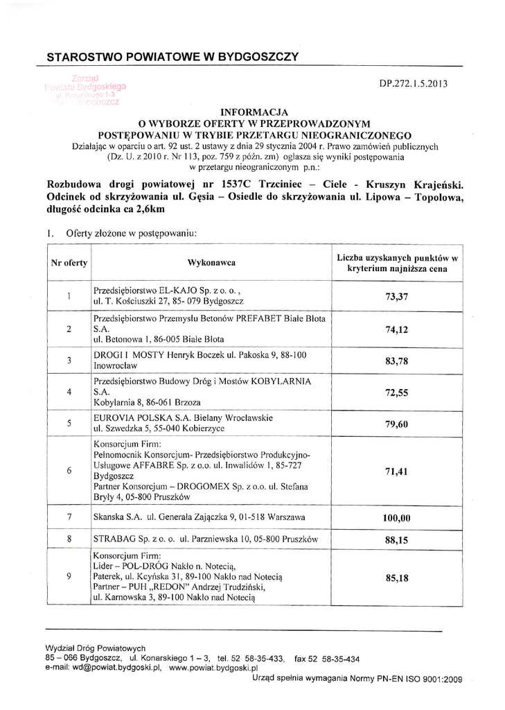 STAROSTWO POWIATOWE W BYDGOSZCZY DP.272.1.5.2013 ^SKiego uI Kt.-iiMV-frjno -]-3 INFORMACJA O WYBORZE OFERTY W PRZEPROWADZONYM POSTI^POWANIU W TRYBIE PRZETARGU NIEOGRANICZONEGO DziaiaJEjc w oparciu o art. 92 ust. 2 ustawy z dnia 29 stycznia 2004 r. Prawo zamowien publicznych (Dz. U. z 2010 r. Nr 113, poz. 759 z pozn. zm) oglasza sie wyniki poste_powania w przetargu nieograniczonym p.n.: Rozbudowa drogi powiatowej nr 1537C Trzciniec - Ciele - Kruszyn Krajenski. Odcinek od skrzyzowania ul. G^sia - Osiedle do skrzyzowania ul. Lipowa - Topolowa, dhigosc odcinka ca 2,6km 1. Oferty zJozone w poste_powaniu: Nr oferty Wykonawca Licxba uzyskanych punktow w krytcrium najnizsza cena 1 Przedsiebiorstwo EL-KAJO Sp. z o. o. , ul. T. Kosciuszki 27, 85- 079 Bydgoszcz 73,37 2 Przedsiebiorstwo Przemyski Betonow PREFABET Biale Biota S.A. ul. Betonowa 1, 86-005 Biate Biota 74,12 3 DROGI I MOSTY Henryk Boczek ul. Pakoska 9, 88-100 Inowroctaw 83,78 4 Przedsi^biorslwo Budowy Drog i Mostow KOBYLARNIA S.A. Kobylarnia 8, 86-061 Brzoza 72,55 5 EUROVIA POLSKA S.A. Bielany WrocJawskie ul. Szwedzka 5, 55-040 Kobierzyce 79,60 6 Konsorcjum Firm: Petnomocnik Konsorcjum- Przedsi^biorstwo ProdukcyjnoUslugowe AFFABRE Sp. z o.o. ul. Inwalidow 1 , 85-727 Bydgoszcz Partner Konsorcjum - DROGOMEX Sp. z o.o. ul. Stefana Bryly 4, 05-800 Pruszkow 71,41 7 Skanska S.A. ul. Generate Zajaczka 9, 01-518 Warszawa 100,00 8 STRABAG Sp. zo. o. ul. Parznicwska 10, 05-800 Pruszkow 88,15 9 Konsorcjum Firm: Lider-POL-DROG Naklo n. Noteciq, Paterek, ul. Kcynska 31, 89-100 Nakto nad Notecia Partner -PUH ,,REDON" Andrzej Trudzinski, ul. Karnowska 3, 89-100 Nakto nad Noteciq 85,18 Wydzial Drog Powiatowych 85 - 066 Bydgoszcz, ul. Konarskiego 1 - 3, tel. 52 58-35-433, fax 52 58-35-434 e-mail: [email protected], www.powiat.bydgoski.pl Urzad speinia wymagania Normy PN-EN ISO 9001:2009 STAROSTWO POWIATOWE W BYDGOSZCZY 2. Oferty odrzucone: brak 3. Wykonawcy wykluczeni z post^powania o udzielenie zamowienia: brak 4. W dniu 13 marca 2013r., komisja przetargowa po zatwierdzeniu przez Starost^ Bydgoskiego wybraia oferte: SKANSKA S.A. ul. Generate Zajaczka 9, 01-518 Warszawa Cena wybranej oferty z podatkiem VAT 23%: 2.827.519,98 zl. 5. Wybrana oferta uzyskata najwiekszq liczb^ punktow zgodnie z kryterium ,,najnizsza cena", spe-lnia warunki udziafu w postepowaniu oraz vvymogi okreslone w ustawie Prawo zamowien publicznych. podst. prawna: art. 91 ust. 1 ustawy Prawo zamowien publicznych 6. Zamawiaj^cy, zgodnie z art. 94 ust. 2 pkt. 3) lit a) zamierza zawrzec umow^ w sprawie zamowienia publicznego nie wczesniej nizdnia 18 marca 2013 r. Bydgoszcz, dnia 13.03.2013 r. YVOOSKI Wydziat Drog Powiatowych 85 - 066 Bydgoszcz, ul. Konarskiego 1 - 3, tel. 52 58-35-433, fax 52 58-35-434 e-mail: [email protected], www.powiat.bydgoski.pl Urz^d spetnia wymagania Normy PN-EN ISO 9001:2009