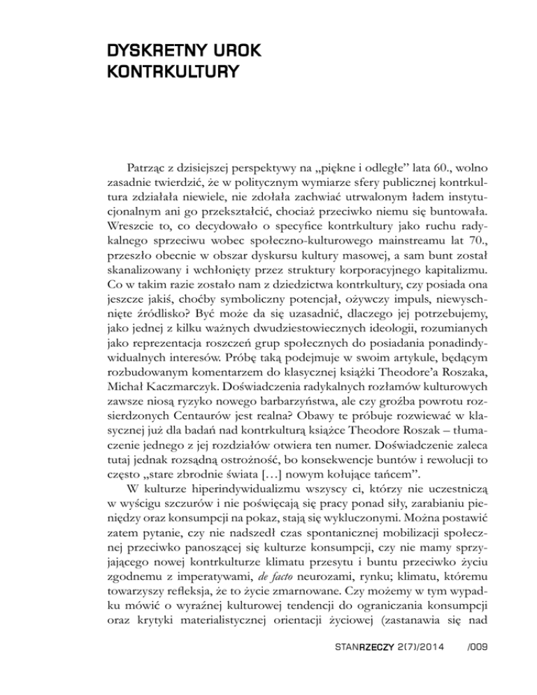 DYSKRETNY UROK KONTRKULTURY Patrząc z dzisiejszej perspektywy na „piękne i odległe” lata 60., wolno zasadnie twierdzić, że w politycznym wymiarze sfery publicznej kontrkultura zdziałała niewiele, nie zdołała zachwiać utrwalonym ładem instytucjonalnym ani go przekształcić, chociaż przeciwko niemu się buntowała. Wreszcie to, co decydowało o specyfice kontrkultury jako ruchu radykalnego sprzeciwu wobec społeczno-kulturowego mainstreamu lat 70., przeszło obecnie w obszar dyskursu kultury masowej, a sam bunt został skanalizowany i wchłonięty przez struktury korporacyjnego kapitalizmu. Co w takim razie zostało nam z dziedzictwa kontrkultury, czy posiada ona jeszcze jakiś, choćby symboliczny potencjał, ożywczy impuls, niewyschnięte źródlisko? Być może da się uzasadnić, dlaczego jej potrzebujemy, jako jednej z kilku ważnych dwudziestowiecznych ideologii, rozumianych jako reprezentacja roszczeń grup społecznych do posiadania ponadindywidualnych interesów. Próbę taką podejmuje w swoim artykule, będącym rozbudowanym komentarzem do klasycznej książki Theodore’a Roszaka, Michał Kaczmarczyk. Doświadczenia radykalnych rozłamów kulturowych zawsze niosą ryzyko nowego barbarzyństwa, ale czy groźba powrotu rozsierdzonych Centaurów jest realna? Obawy te próbuje rozwiewać w klasycznej już dla badań nad kontrkulturą książce Theodore Roszak – tłumaczenie jednego z jej rozdziałów otwiera ten numer. Doświadczenie zaleca tutaj jednak rozsądną ostrożność, bo konsekwencje buntów i rewolucji to często „stare zbrodnie świata […] nowym kołujące tańcem”. W kulturze hiperindywidualizmu wszyscy ci, którzy nie uczestniczą w wyścigu szczurów i nie poświęcają się pracy ponad siły, zarabianiu pieniędzy oraz konsumpcji na pokaz, stają się wykluczonymi. Można postawić zatem pytanie, czy nie nadszedł czas spontanicznej mobilizacji społecznej przeciwko panoszącej się kulturze konsumpcji, czy nie mamy sprzyjającego nowej kontrkulturze klimatu przesytu i buntu przeciwko życiu zgodnemu z imperatywami, de facto neurozami, rynku; klimatu, któremu towarzyszy refleksja, że to życie zmarnowane. Czy możemy w tym wypadku mówić o wyraźnej kulturowej tendencji do ograniczania konsumpcji oraz krytyki materialistycznej orientacji życiowej (zastanawia się nad STAN RZECZY 2( 7)/2014 /009 tym Andrzej Kasperek, analizując przypadek minimalizmu). Jeśli wobec współczesnego kryzysu, nasilającego się poczucia niepewności i utraty bezpieczeństwa postawimy sobie zasadnicze pytanie o to, czy powinniśmy uelastyczniać siebie, czy rekonstruować system, to otrzymamy dylemat: czy dostosowywać się do restrukturyzującego się kapitalizmu, czy humanizować sam kapitalizm, przystosowywać go do ludzkich miar. Pierwszy przypadek zakłada, że człowiek jest wiązką ekonomicznych współzależności, Frommowskim „charakterem merkantylnym”. Tym samym najbardziej owocną płaszczyzną analizy relacji pomiędzy środowiskiem człowieka a kapitalistyczną infrastrukturą stają się kategorie użyteczności i racjonalności instrumentalnej, na których wspiera się gmach socjologii Weberowskiej. W drugim przypadku możliwa do pomyślenia jest kolejna kontrkulturowa rewolucja, rozumiana jako wcielenie starych idei radykalnego humanizmu. Pytanie tylko, czy podejmowane ostatnimi czasy próby wskrzeszania kontrkulturowej duchowości mogą stanowić remedium na deficyt myślenia, czy są wyrazem autentycznej potrzeby sensu, stanowiącej rezultat pracy świadomości mitycznej w rozumieniu Leszka Kołakowskiego, czy też mamy tutaj do czynienia z kolejną modą i strategią adaptacyjną w ramach kultury indywidualizmu. Kontrkultura jako bunt polityczny, świetnie zobrazowany przez Milana Kunderę w Nieznośnej lekkości bytu, przyczyniła się w istocie do erozji politycznego zaangażowania. Nieco prowokacyjną insynuacją, że przedstawiciele kontrkultury nie byli w istocie nigdy zainteresowani realizacją celów politycznych, a jedynie buntem w sferze symbolicznej, można by skłonić do bardziej rzeczowej analizy dziedzictwa kontrkultury współcześnie. Zmiana systemu dla wielu osób z pokolenia ‘68 zaczynać się musi od zmian kulturowych, a te są przeobrażeniami świadomości ludzkiej. W konsekwencji polityka kulturowa staje się ważniejsza niż polityka redystrybucji, dążąca do sprawiedliwego podziału dóbr. Zainteresowania przedstawicieli klasycznej kontrkultury szeroko pojętą duchowością przełożyły się na poszukiwania holistycznych paradygmatów, podczas gdy współcześnie kultura indywidualizmu hołduje raczej indywidualistycznemu egoizmowi, ewoluując w stronę mikrowspólnot smaku. Nad sygnalizowanymi powyżej problemami (i nie tylko) zastanawiają się publikujący w tym numerze autorzy. Szeroko dyskutowane ostatnimi czasy przez rozmaitych badaczy społecznych poczucie zagrożenia, niepewności i niezadowolenia przestaje być współcześnie doświadczeniem mniejszości, jak w 1968 roku, stając się doświadczeniem większości – to radykalna zmiana. O ile w latach 70. buntowano się przeciwko pokoleniu rodziców, o tyle obecnie daje się wyczuć nostalgię za tamtymi czasami – w Europie Zachodniej był to czas prosperity /010 STAN RZECZY 2( 7)/2014 i pewności. Chociaż młodsze pokolenia niewątpliwie tęsknią za pewną pracą, to jednak wyłącznie w pakiecie ze wszystkimi dobrodziejstwami, które zawdzięczamy kontrkulturze: z rewolucją seksualną i technologiczną, prawami mniejszości, feminizmem trzeciej fali, równouprawnieniem itd. Można zaryzykować tezę, że wokół konfliktu pokoleń toczyć się będzie współcześnie spór o to, czym jest sprawiedliwość społeczna. Jest to, jak wiadomo, fundamentalne zagadnienie z zakresu filozofii politycznej. Można odgadywać kontury tego sporu w pojawiających się wątpliwościach, czy system demokratyczny będzie w niedalekiej przyszłości korz