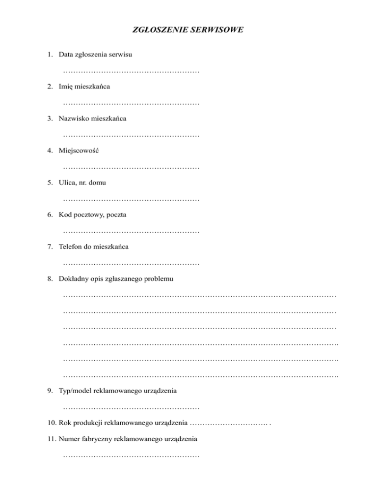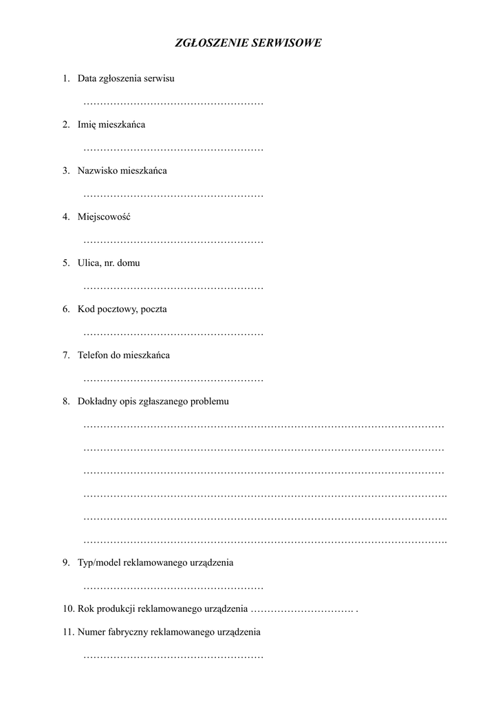 ZGŁOSZENIE SERWISOWE 1. Data zgłoszenia serwisu ……………………………………………… 2. Imię mieszkańca ……………………………………………… 3. Nazwisko mieszkańca ……………………………………………… 4. Miejscowość ……………………………………………… 5. Ulica, nr. domu ……………………………………………… 6. Kod pocztowy, poczta ……………………………………………… 7. Telefon do mieszkańca ……………………………………………… 8. Dokładny opis zgłaszanego problemu ……………………………………………………………………………………………… ……………………………………………………………………………………………… ……………………………………………………………………………………………… ………………………………………………………………………………………………. ………………………………………………………………………………………………. ………………………………………………………………………………………………. 9. Typ/model reklamowanego urządzenia ……………………………………………… 10. Rok produkcji reklamowanego urządzenia …………………………. . 11. Numer fabryczny reklamowanego urządzenia ……………………………………………… 12. Czy instalacja obecnie działa ……………………………………………… 13. Informacje na temat dostępności mieszkańca ………………………………………………………………………………………………. ………………………………………………………………………………………………. Oświadczenie mieszkańca Jednocześnie oświadczam, że za nieuzasadnione wezwanie serwisu usunięcia awarii wyrażam zgodę na obciążenie mnie następującą kwotą wynikającą z poniższego cennika usług lecz nie mniejszą niż 400zł/netto: 60,00 zł/netto za każdą rozpoczętą roboczogodzinę serwisanta. - 0,84 zł/netto za każdy 1 kilometr dojazdu i odjazdu. Przykładowe zgłoszenia uznawane za niezasadne: 1. Uszkodzenie sterownika/czujnika w wyniku działania wyładowania atmosferycznego 2. Łączenia przegryzione przez drobne zwierzęta 3. U mieszkańca występowały braki w dostawie prądu 4. Zmiana ustawień przez mieszkańca 5. Po przyjeździe serwisanta usterka nie występuje oraz brak udokumentowania, że wcześniej występowała* 6. Po przyjeździe serwisanta mieszkańca nie ma w domu, a był umówiony z Serwisem 7. Przegrzana instalacja z powodu braku odbioru wody 8. Podpięcie dodatkowego elementu do instalacji zostało zrobione bez zgody Wykonawcy lub nie zgodnie z jego zaleceniami. Załącza się dowody istnienia awarii* …………………………………………….. PODPIS MIESZKAŃCA *podkreślić w przypadku załączenia dowodów (np. fotografii lub innych)