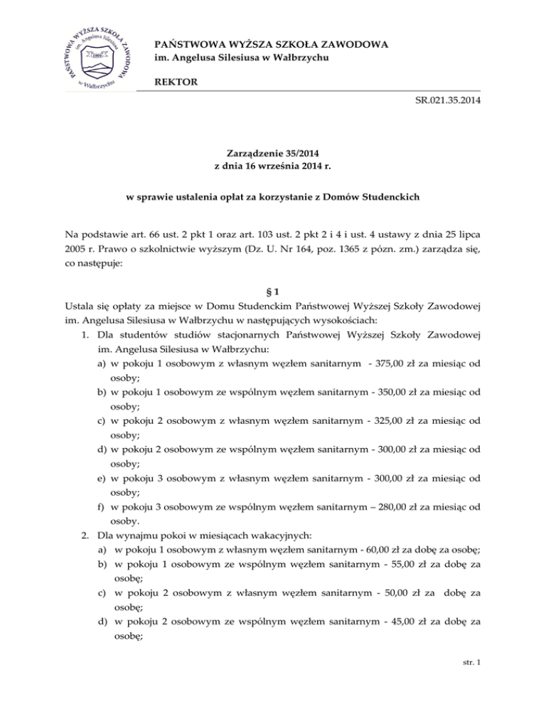 [Wpisz cytat z PAŃSTWOWA WYŻSZA SZKOŁA ZAWODOWA im. Angelusa Silesiusa w Wałbrzychu REKTOR SR.021.35.2014 REKTOR 58-300 Wałbrzych ul. Zamkowa 4 tel. (074) 641 92 00 Zarządzenie 35/2014 z dnia 16 września 2014 r. w sprawie ustalenia opłat za korzystanie z Domów Studenckich Na podstawie art. 66 ust. 2 pkt 1 oraz art. 103 ust. 2 pkt 2 i 4 i ust. 4 ustawy z dnia 25 lipca 2005 r. Prawo o szkolnictwie wyższym (Dz. U. Nr 164, poz. 1365 z pózn. zm.) zarządza się, co następuje: §1 Ustala się opłaty za miejsce w Domu Studenckim Państwowej Wyższej Szkoły Zawodowej im. Angelusa Silesiusa w Wałbrzychu w następujących wysokościach: 1. Dla studentów studiów stacjonarnych Państwowej Wyższej Szkoły Zawodowej im. Angelusa Silesiusa w Wałbrzychu: a) w pokoju 1 osobowym z własnym węzłem sanitarnym - 375,00 zł za miesiąc od osoby; b) w pokoju 1 osobowym ze wspólnym węzłem sanitarnym - 350,00 zł za miesiąc od osoby; c) w pokoju 2 osobowym z własnym węzłem sanitarnym - 325,00 zł za miesiąc od osoby; d) w pokoju 2 osobowym ze wspólnym węzłem sanitarnym - 300,00 zł za miesiąc od osoby; e) w pokoju 3 osobowym z własnym węzłem sanitarnym - 300,00 zł za miesiąc od osoby; f) w pokoju 3 osobowym ze wspólnym węzłem sanitarnym – 280,00 zł za miesiąc od osoby. 2. Dla wynajmu pokoi w miesiącach wakacyjnych: a) w pokoju 1 osobowym z własnym węzłem sanitarnym - 60,00 zł za dobę za osobę; b) w pokoju 1 osobowym ze wspólnym węzłem sanitarnym - 55,00 zł za dobę za osobę; c) w pokoju 2 osobowym z własnym węzłem sanitarnym - 50,00 zł za dobę za osobę; d) w pokoju 2 osobowym ze wspólnym węzłem sanitarnym - 45,00 zł za dobę za osobę; str. 1 e) w pokoju 3 osobowym z własnym węzłem sanitarnym - 45,00 zł za dobę za osobę; f) w pokoju 3 osobowym ze wspólnym węzłem sanitarnym – 40,00 zł za dobę za osobę. 3. Opłata za bezumowne zajmowanie pokoju wynosi dwukrotność stawki podstawowej. 4. Nauczyciele akademiccy na stałe zamieszkujący poza Wałbrzychem maja prawo korzystania z pokoi gościnnych za odpłatnością w wysokości 25,00 zł za dobę. 5. Opłata za bezumowne zajmowanie pokoju wynosi 200 % stawki podstawowej. §2 1. Ustala się opłatę brutto za zakup 1 sztuki żetonu umożliwiającego korzystanie z pralek i suszarek w wysokości 2,00 zł. Jedna sztuka żetonu umożliwia skorzystanie jeden raz z jednego urządzenia. 2. Dla studentów, pracowników PWSZ oraz osób korzystających z zakwaterowania w Domu Studenckim Państwowej Wyższej Szkoły Zawodowej im Angelusa Silesiusa w Wałbrzychu parking jest bezpłatny. §3 1. Dla zabezpieczenia pokrycia należności z tytułu opłat za miejsce w Domu Studenckim, kosztów związanych z egzekwowaniem należności oraz ewentualnych roszczeń z tytułu uszkodzenia bądź zniszczenia mienia w Domu Studenckim ustalam obowiązek wnoszenia kaucji w wysokości jednomiesięcznej opłaty za wynajem pokoju. 2. Obowiązek wnoszenia kaucji, o którym mowa w ust. 1, nie dotyczy nauczycieli akademickich. 3. Kaucję, o której mowa w ust. 1 student jest zobowiązany wpłacić na konto Państwowej Wyższej Szkoły Zawodowej im. Angelusa Silesiusa w Wałbrzychu nr 56 1060 0076 0000 3310 0019 3129. 4. Kaucja nie podlega waloryzacji. 5. Kaucja podlega zwrotowi w ciągu 7 dni od dnia wymeldowania, po potrąceniu ewentualnych należności z tytułu opłat za miejsce, kosztów związanych z egzekwowaniem należności oraz szkód. §4 6. Opłata za miejsce w Domu Studenckim, o której mowa w § 1 powinna być dokonana na konto Państwowej Wyższej Szkoły Zawodowej im. Angelusa Silesiusa w Wałbrzychu nr 56 1060 0076 0000 3310 0019 3129. 1. Opłaty za zakwaterowanie w pokoju w niepełnych miesiącach wnosi się w wysokości 1/30 wysokości opłaty podstawowej za każdy dzień. str. 2 §5 Traci moc Zarządzenie 37/2013 z dnia 31 lipca 2013 r. w sprawie ustalenia opłat za korzystanie z Domów Studenckich. §6 Zarządzenie wchodzi w życie z dniem podpisania. str. 3