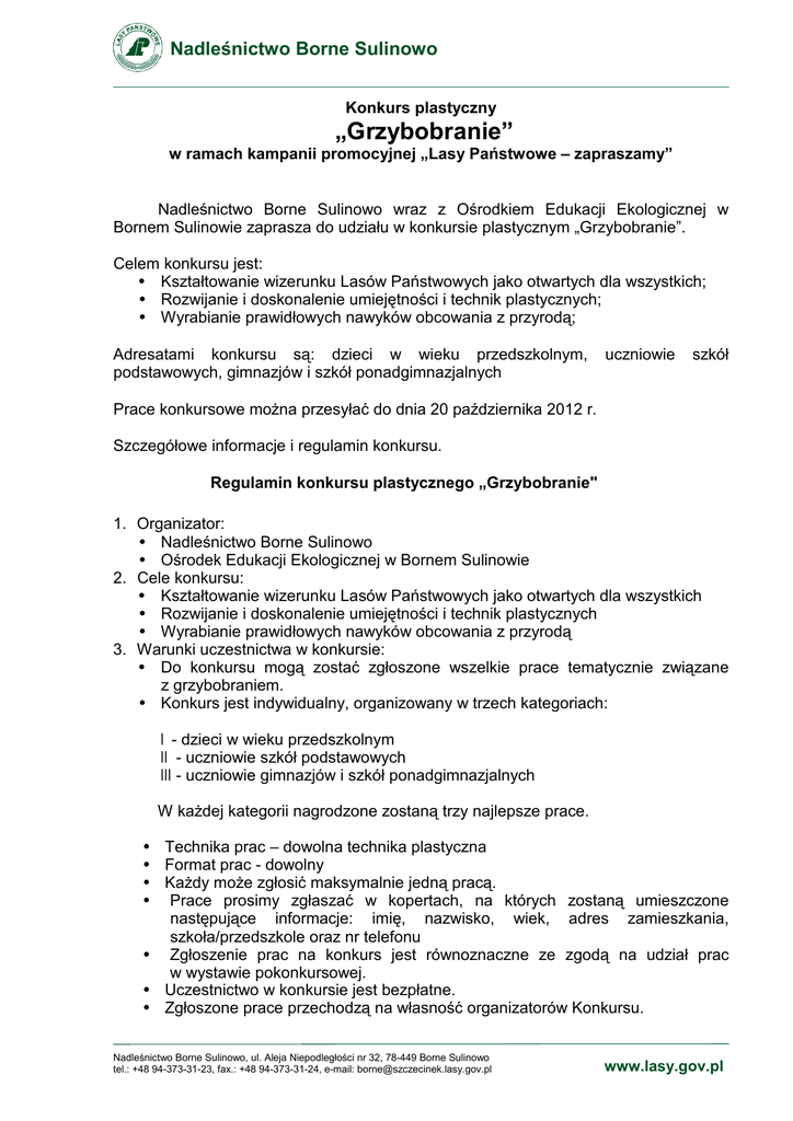 Nadleśnictwo Borne Sulinowo Konkurs plastyczny „Grzybobranie” w ramach kampanii promocyjnej „Lasy Państwowe – zapraszamy” Nadleśnictwo Borne Sulinowo wraz z Ośrodkiem Edukacji Ekologicznej w Bornem Sulinowie zaprasza do udziału w konkursie plastycznym „Grzybobranie”. Celem konkursu jest: • Kształtowanie wizerunku Lasów Państwowych jako otwartych dla wszystkich; • Rozwijanie i doskonalenie umiejętności i technik plastycznych; • Wyrabianie prawidłowych nawyków obcowania z przyrodą; Adresatami konkursu są: dzieci w wieku przedszkolnym, podstawowych, gimnazjów i szkół ponadgimnazjalnych uczniowie szkół Prace konkursowe moŜna przesyłać do dnia 20 października 2012 r. Szczegółowe informacje i regulamin konkursu. Regulamin konkursu plastycznego „Grzybobranie" 1. Organizator: • Nadleśnictwo Borne Sulinowo • Ośrodek Edukacji Ekologicznej w Bornem Sulinowie 2. Cele konkursu: • Kształtowanie wizerunku Lasów Państwowych jako otwartych dla wszystkich • Rozwijanie i doskonalenie umiejętności i technik plastycznych • Wyrabianie prawidłowych nawyków obcowania z przyrodą 3. Warunki uczestnictwa w konkursie: • Do konkursu mogą zostać zgłoszone wszelkie prace tematycznie związane z grzybobraniem. • Konkurs jest indywidualny, organizowany w trzech kategoriach: I - dzieci w wieku przedszkolnym II - uczniowie szkół podstawowych III - uczniowie gimnazjów i szkół ponadgimnazjalnych W kaŜdej kategorii nagrodzone zostaną trzy najlepsze prace. • Technika prac – dowolna technika plastyczna • Format prac - dowolny • KaŜdy moŜe zgłosić maksymalnie jedną pracą. • Prace prosimy zgłaszać w kopertach, na których zostaną umieszczone następujące informacje: imię, nazwisko, wiek, adres zamieszkania, szkoła/przedszkole oraz nr telefonu • Zgłoszenie prac na konkurs jest równoznaczne ze zgodą na udział prac w wystawie pokonkursowej. • Uczestnictwo w konkursie jest bezpłatne. • Zgłoszone prace przechodzą na własność organizatorów Konkursu. Nadleśnictwo Borne Sulinowo, ul. Aleja Niepodległości nr 32, 78-449 Borne Sulinowo tel.: +48 94-373-31-23, fax.: +48 94-373-31-24, e-mail: [email protected] www.lasy.gov.pl • Uczestnicy konkursu wyraŜają zgodę na nieodpłatne i bezterminowe wykorzystanie zgłoszonych przez nich prac, ich utrwalanie i zwielokrotnianie dowolna techniką, a takŜe na rozpowszechnianie w publikacjach i na stronie internetowej z podaniem nazwiska autora. 4. Termin zgłaszania prac - do 20 października 2012 r. 5. Miejsce zgłaszania prac: • Sekretariat Nadleśnictwa Borne Sulinowo, Al. Niepodległości 32 6. W razie niejasności związanych z regulaminem prosimy o kontakt telefoniczny 666 048 937 7. O wyłonieniu zwycięzców Konkursu zdecyduje Komisja Konkursowa, osoby wybrane z organizatorów konkursu. 8. Decyzje Komisji są ostateczne i nie przysługuje na nie odwołanie. 9. Fundatorem nagród jest Nadleśnictwo Borne Sulinowo. 10. Wręczenie nagród odbędzie się w Ośrodku Edukacji Ekologicznej w Bornem Sulinowie. O dokładnym terminie uroczystości laureaci konkursu zostaną powiadomieni telefonicznie. 11. Zgłoszenie prac do konkursu potwierdza uznanie warunków niniejszego regulaminu oraz wyraŜenie zgodny na publikowanie danych osobowych zgodnie z ustawą z dnia 28.08.1997r. o ochronie danych osobowych (Dz. U. Nr 133 poz 883 z późn. zm). 12. Niniejszy konkurs nie jest grą losową w rozumieniu ustawy z dnia 29 lipca 199r. o grach losowych i zakładach wzajemnych (Dz. U z 2004r. Nr 4, poz. 27 z późn. zm.) 2