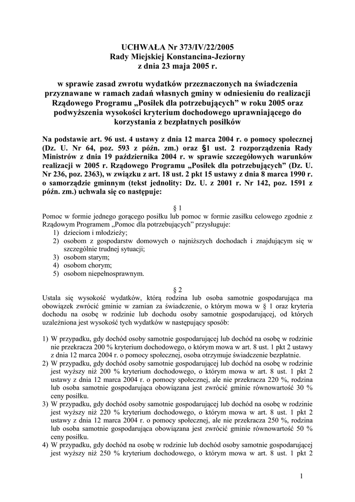 UCHWAŁA Nr 373/IV/22/2005 Rady Miejskiej Konstancina-Jeziorny z dnia 23 maja 2005 r. w sprawie zasad zwrotu wydatków przeznaczonych na świadczenia przyznawane w ramach zadań własnych gminy w odniesieniu do realizacji Rządowego Programu „Posiłek dla potrzebujących” w roku 2005 oraz podwyższenia wysokości kryterium dochodowego uprawniającego do korzystania z bezpłatnych posiłków Na podstawie art. 96 ust. 4 ustawy z dnia 12 marca 2004 r. o pomocy społecznej (Dz. U. Nr 64, poz. 593 z późn. zm.) oraz §1 ust. 2 rozporządzenia Rady Ministrów z dnia 19 października 2004 r. w sprawie szczegółowych warunków realizacji w 2005 r. Rządowego Programu „Posiłek dla potrzebujących” (Dz. U. Nr 236, poz. 2363), w związku z art. 18 ust. 2 pkt 15 ustawy z dnia 8 marca 1990 r. o samorządzie gminnym (tekst jednolity: Dz. U. z 2001 r. Nr 142, poz. 1591 z późn. zm.) uchwala się co następuje: §1 Pomoc w formie jednego gorącego posiłku lub pomoc w formie zasiłku celowego zgodnie z Rządowym Programem „Pomoc dla potrzebujących” przysługuje: 1) dzieciom i młodzieży; 2) osobom z gospodarstw domowych o najniższych dochodach i znajdującym się w szczególnie trudnej sytuacji; 3) osobom starym; 4) osobom chorym; 5) osobom niepełnosprawnym. §2 Ustala się wysokość wydatków, którą rodzina lub osoba samotnie gospodarująca ma obowiązek zwrócić gminie w zamian za świadczenie, o którym mowa w § 1 oraz kryteria dochodu na osobę w rodzinie lub dochodu osoby samotnie gospodarującej, od których uzależniona jest wysokość tych wydatków w następujący sposób: 1) W przypadku, gdy dochód osoby samotnie gospodarującej lub dochód na osobę w rodzinie nie przekracza 200 % kryterium dochodowego, o którym mowa w art. 8 ust. 1 pkt 2 ustawy z dnia 12 marca 2004 r. o pomocy społecznej, osoba otrzymuje świadczenie bezpłatnie. 2) W przypadku, gdy dochód osoby samotnie gospodarującej lub dochód na osobę w rodzinie jest wyższy niż 200 % kryterium dochodowego, o którym mowa w art. 8 ust. 1 pkt 2 ustawy z dnia 12 marca 2004 r. o pomocy społecznej, ale nie przekracza 220 %, rodzina lub osoba samotnie gospodarująca obowiązana jest zwrócić gminie równowartość 30 % ceny posiłku. 3) W przypadku, gdy dochód osoby samotnie gospodarującej lub dochód na osobę w rodzinie jest wyższy niż 220 % kryterium dochodowego, o którym mowa w art. 8 ust. 1 pkt 2 ustawy z dnia 12 marca 2004 r. o pomocy społecznej, ale nie przekracza 250 %, rodzina lub osoba samotnie gospodarująca obowiązana jest zwrócić gminie równowartość 50 % ceny posiłku. 4) W przypadku, gdy dochód na osobę w rodzinie lub dochód osoby samotnie gospodarującej jest wyższy niż 250 % kryterium dochodowego, o którym mowa w art. 8 ust. 1 pkt 2 1 ustawy z dnia 12 marca 2004 r. o pomocy społecznej, rodzina lub osoba samotnie gospodarująca obowiązana jest zwrócić gminie równowartość 100 % ceny posiłku. §3 W szczególnie uzasadnionych przypadkach, kiedy żądanie zwrotu całości lub części poniesionych wydatków na przyznane świadczenie stanowiłoby nadmierne obciążenie dla rodziny lub osoby samotnie gospodarującej lub niweczyłoby skutki udzielonej pomocy można na wniosek osoby zainteresowanej lub pracownika socjalnego odstąpić od żądania takiego zwrotu. §4 Wykonanie uchwały powierza się Burmistrzowi Gminy Konstancin-Jeziorna. §5 Uchwała wchodzi w życie po upływie 14 dni od dnia jej ogłoszenia w Dzienniku Urzędowym Województwa Mazowieckiego. Pieczęć imienna i podpis – Przewodniczący Rady Miejskiej Mariusz Dzierżawski Pieczęć okrągła – Rada Miejska Konstancin-Jeziorna 2 Uzasadnienie do projektu Uchwały Rady Miejskiej Konstancin-Jeziorna Nr 373/IV/22/2005 z dnia 23 maja 2005 r. w sprawie zasad zwrotu wydatków przeznaczonych na świadczenia przyznawane w ramach zadań własnych gminy w odniesieniu do realizacji Rządowego Programu „Posiłek dla potrzebujących” w roku 2005 oraz podwyższenia wysokości kryterium dochodowego uprawniającego do korzystania z bezpłatnych posiłków Rządowy program „Posiłek dla potrzebujących” ma na celu ograniczenie zjawiska głodu i niedożywienia, w szczególności wśród dzieci i młodzieży, osób dorosłych z gospodarstw domowych o najniższych dochodach i znajdujących się w szczególnie trudnej sytuacji, osób starych, osób chorych oraz osób niepełnosprawnych, ze szczególnym uwzględnieniem osób z terenów objętych wysokim poziomem bezrobocia i ze środowisk wiejskich oraz dzieci z rodzin ubogich nie objętych obowiązkiem szkolnym. Rada Ministrów określiła, w drodze rozporządzenia, warunki realizacji w 2005 r. Rządowego Programu „Posiłek dla potrzebujących”. Przepis ten ma charakter szczególny w stosunku do całej ustawy o pomocy społecznej, pozwala bowiem na bezpłatne udzielanie pomocy w formie posiłku, jeżeli dochód na osobę w rodzinie lub dochód osoby samotnie gospodarującej nie przekracza 150 % dochodu, o którym mowa w art. 8 ust. 1 ustawy o pomocy społecznej oraz umożliwia korzystanie z tej pomocy na zasadach zwrotu przez rodzinę lub osobę części lub całości poniesionych wydatków, ustalonych w uchwale rady gminy podjętej na podstawie art. 96 ust. 4 ustawy o pomocy społecznej. Proponowane w tej uchwale zasady zwrotu wydatków na posiłki pozwolą na objęcie pomocą większej grupy osób, co przyczyni się do ograniczenia na terenie gminy zjawiska niedożywienia dzieci i młodzieży oraz osób potrzebujących. Pieczęć imienna i podpis – Przewodniczący Rady Miejskiej Mariusz Dzierżawski 3