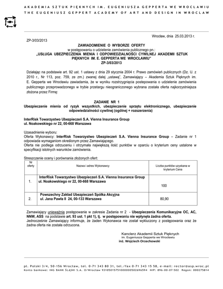 Wrocław, dnia 25.03.2013 r. ZP-3/03/2013 ZAWIADOMIENIE O WYBORZE OFERTY w postępowaniu o udzielenie zamówienia publicznego pn.: „USŁUGA UBEZPIECZENIA MIENIA I ODPOWIEDZIALNOŚCI CYWILNEJ AKADEMII SZTUK PIĘKNYCH IM. E. GEPPERTA WE WROCŁAWIU” ZP-3/03/2013 Działając na podstawie art. 92 ust. 1 ustawy z dnia 29 stycznia 2004 r. Prawo zamówień publicznych (Dz. U. z 2010 r., Nr 113, poz. 759, ze zm.) zwanej dalej „ustawą”, Zamawiający – Akademia Sztuk Pięknych im. E. Gepperta we Wrocławiu zawiadamia, że w wyniku rozstrzygnięcia postepowania o udzielenie zamówienia publicznego przeprowadzonego w trybie przetargu nieograniczonego wybrana została oferta najkorzystniejsza złożona przez Firmę: ZADANIE NR 1 Ubezpieczenie mienia od ryzyk wszystkich, ubezpieczenie sprzętu elektronicznego, ubezpieczenie odpowiedzialności cywilnej (ogólnej + rozszerzenia) InterRisk Towarzystwo Ubezpieczeń S.A. Vienna Insurance Group ul. Noakowskiego nr 22, 00-668 Warszawa Uzasadnienie wyboru: Oferta Wykonawcy: InterRisk Towarzystwo Ubezpieczeń S.A. Vienna Insurance Group – Zadanie nr 1 odpowiada wymaganiom określonym przez Zamawiającego. Oferta nie podlega odrzuceniu i otrzymała największą ilość punktów w oparciu o kryterium ceny ustalone w specyfikacji istotnych warunków zamówienia. Streszczenie oceny i porównania złożonych ofert: Nr oferty 1. 2. Nazwa i adres Wykonawcy Liczba punktów uzyskana w kryterium Cena InterRisk Towarzystwo Ubezpieczeń S.A. Vienna Insurance Group ul. Noakowskiego nr 22, 00-668 Warszawa Powszechny Zakład Ubezpieczeń Spółka Akcyjna ul. Jana Pawła II 24, 00-133 Warszawa 100 80,90 Zamawiający unieważnia postępowanie w zakresie Zadania nr 2 - Ubezpieczenia Komunikacyjne OC, AC, NNW, ASS na podstawie art. 93 ust. 1 pkt 1), tj. w postępowaniu nie wpłynęła żadna oferta. Jednocześnie Zamawiający informuje, że żaden Wykonawca nie został wykluczony z postępowania oraz że żadna oferta nie została odrzucona. Kanclerz Akademii Sztuk Pięknych im. Eugeniusza Gepperta we Wrocławiu inż. Wojciech Orzechowski