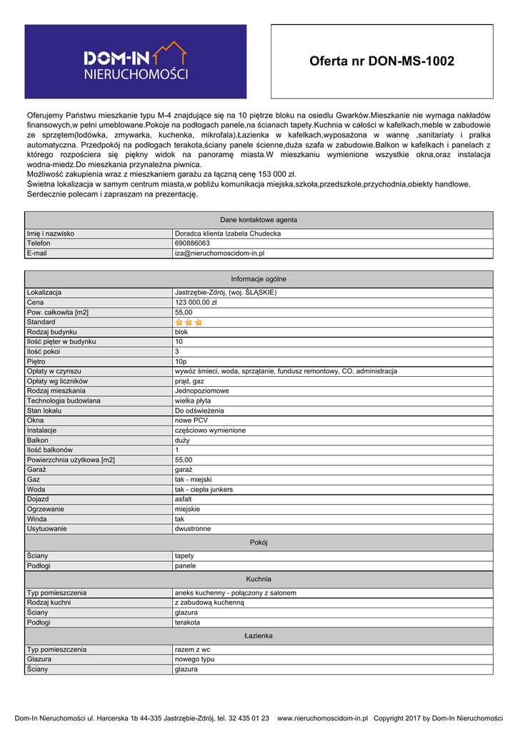 Oferta nr DON-MS-1002 Oferujemy Państwu mieszkanie typu M-4 znajdujące się na 10 piętrze bloku na osiedlu Gwarków.Mieszkanie nie wymaga nakładów finansowych,w pełni umeblowane.Pokoje na podłogach panele,na ścianach tapety.Kuchnia w całości w kafelkach,meble w zabudowie ze sprzętem(lodówka, zmywarka, kuchenka, mikrofala).Łazienka w kafelkach,wyposażona w wannę ,sanitariaty i pralka automatyczna. Przedpokój na podłogach terakota,ściany panele ścienne,duża szafa w zabudowie.Balkon w kafelkach i panelach z którego rozpościera się piękny widok na panoramę miasta.W mieszkaniu wymienione wszystkie okna,oraz instalacja wodna-miedz.Do mieszkania przynależna piwnica. Możliwość zakupienia wraz z mieszkaniem garażu za łączną cenę 153 000 zł. Świetna lokalizacja w samym centrum miasta,w pobliżu komunikacja miejska,szkoła,przedszkole,przychodnia,obiekty handlowe. Serdecznie polecam i zapraszam na prezentację. Dane kontaktowe agenta Imię i nazwisko Telefon E-mail Doradca klienta Izabela Chudecka 690886063 [email protected] Lokalizacja Cena Pow. całkowita [m2] Standard Rodzaj budynku Ilość pięter w budynku Ilość pokoi Piętro Opłaty w czynszu Opłaty wg liczników Rodzaj mieszkania Technologia budowlana Stan lokalu Okna Instalacje Balkon Ilość balkonów Powierzchnia użytkowa [m2] Garaż Gaz Woda Dojazd Ogrzewanie Winda Usytuowanie Jastrzębie-Zdrój, (woj. ŚLĄSKIE) 123 000,00 zł 55,00 Informacje ogólne blok 10 3 10p wywóz śmieci, woda, sprzątanie, fundusz remontowy, CO, administracja prąd, gaz Jednopoziomowe wielka płyta Do odświeżenia nowe PCV częściowo wymienione duży 1 55,00 garaż tak - miejski tak - ciepła junkers asfalt miejskie tak dwustronne Pokój Ściany Podłogi tapety panele Kuchnia Typ pomieszczenia Rodzaj kuchni Ściany Podłogi aneks kuchenny - połączony z salonem z zabudową kuchenną glazura terakota Łazienka Typ pomieszczenia Glazura Ściany razem z wc nowego typu glazura Dom-In Nieruchomości ul. Harcerska 1b 44-335 Jastrzębie-Zdrój, tel. 32 435 01 23 www.nieruchomoscidom-in.pl Copyright 2017 by Dom-In Nieruchomości Oferta nr DON-MS-1002 Podłogi terakota Przedpokój Ilość Ściany Podłogi 1 panel ścienny terakota Dom-In Nieruchomości ul. Harcerska 1b 44-335 Jastrzębie-Zdrój, tel. 32 435 01 23 www.nieruchomoscidom-in.pl Copyright 2017 by Dom-In Nieruchomości