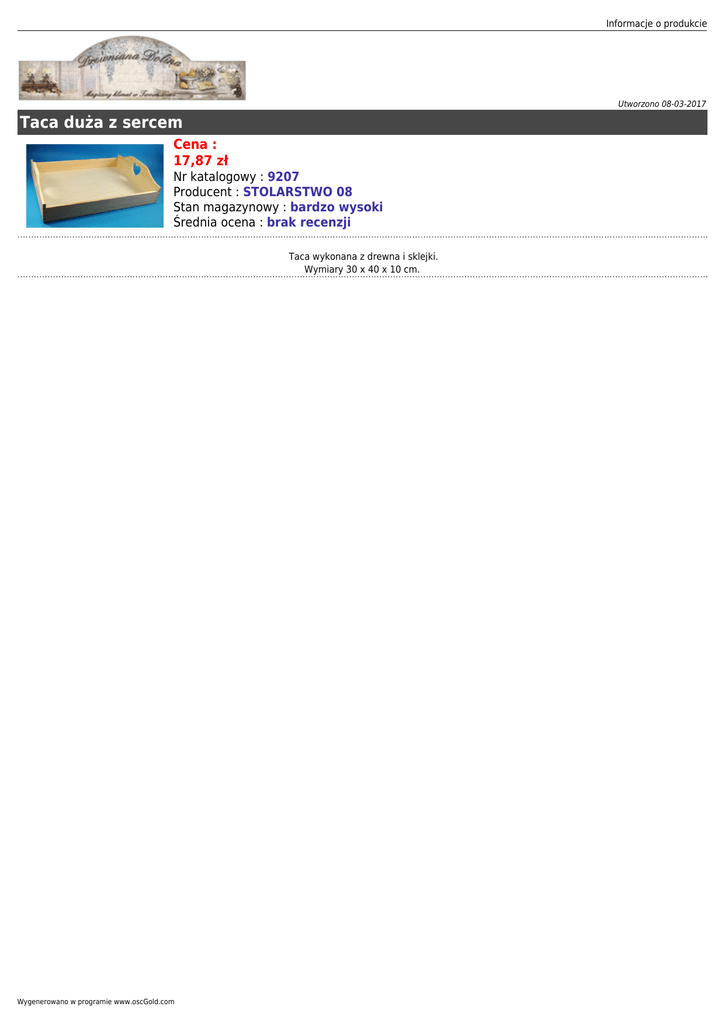 Informacje o produkcie Utworzono 08-03-2017 Taca duża z sercem Cena : 17,87 zł Nr katalogowy : 9207 Producent : STOLARSTWO 08 Stan magazynowy : bardzo wysoki Średnia ocena : brak recenzji Taca wykonana z drewna i sklejki. Wymiary 30 x 40 x 10 cm. Wygenerowano w programie www.oscGold.com