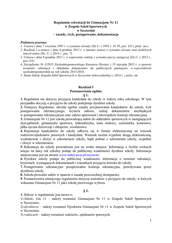 Regulamin rekrutacji do Gimnazjum Nr 11 w Zespole Szkół Sportowych w Szczecinie – zasady, tryb, postępowanie, dokumentacja Podstawa prawna: 1. Ustawa z dnia 7 września 1991 r. o systemie oświaty (Dz.U. z 1991 r. Nr 95, poz. 425 z późn. zm.). 2. Rozdział 2 a ustawy z dnia 6 grudnia 2013 r. o zmianie ustawy o systemie oświaty oraz niektórych innych ustaw (Dz. U. z 2014 r., poz. 7). 3. Ustawa z dnia 9 grudnia 2011 r. o wspieraniu rodziny i systemie pieczy zastępczej (Dz.U. z 2013 r., poz.135). 4. Zarządzenie Nr 3/2015 Zachodniopomorskiego Kuratora Oświaty z 15 stycznia 2015 r. w sprawie terminów rekrutacji i składania dokumentów do publicznych gimnazjów w województwie zachodniopomorskim na rok szkolny 2015/2016. 5. Statut Szkoły Zespołu Szkół Sportowych w Szczecinie (tekst jednolity) z 2014 r. z późn. zm. Rozdział I Postanowienia ogólne § 1. 1. Regulamin nie dotyczy przyjęcia kandydata do szkoły w trakcie roku szkolnego. W tym przypadku decyzję o przyjęciu do szkoły podejmuje dyrektor szkoły. 2. Niniejszy Regulamin, określa ogólne zasady przyjmowania kandydatów do szkoły, tryb postępowania rekrutacyjnego, kryteria naboru, rodzaj dokumentów niezbędnych w postępowaniu rekrutacyjnym oraz zakres uprawnień i obowiązków komisji rekrutacyjnej. 3. Gimnazjum Nr 11 jest szkołą prowadzącą nabór do oddziałów sportowych w następujących dyscyplinach: gimnastyka sportowa, lekkoatletyka, tenis stołowy, szermierka, kolarstwo, piłka ręczna dziewcząt i chłopców, wioślarstwo. 4. Rejestracja kandydatów do szkoły odbywa się w formie elektronicznej na wniosek rodziców/opiekunów prawnych i kandydata. Wniosek można wypełnić drogą elektroniczną, wydrukować i złożyć w sekretariacie szkoły, bądź pobrać z sekretariatu szkoły, wypełnić i złożyć w sekretariacie. 5. Rekrutacja do szkoły prowadzona jest na wolne miejsca. Informację o liczbie wolnych miejsc na dany rok szkolny podaje do publicznej wiadomości dyrektor szkoły. Informacja umieszczana jest na stronie www.nabor.pcss.pl/szczecin/. 6. Dyrektor szkoły podaje do publicznej wiadomości informacje o terminie rekrutacji, kryteriach, wymaganych dokumentach i warunkach przyjęcia dziecka do szkoły. 7. Postępowanie rekrutacyjne przeprowadza komisja rekrutacyjna, powoływana przez dyrektora szkoły. 8. Szkoła prowadzi nabór w oparciu o zasadę powszechnej dostępności. 9. Postanowienia niniejszego regulaminu dotyczą wniosków o przyjęcie do szkoły, w których wskazano Gimnazjum Nr 11 jako szkołę pierwszego wyboru. § 2. 1. Ilekroć w regulaminie jest mowa o: 1) Szkole, Gm 11 – należy rozumieć Gimnazjum Nr 11 w Zespole Szkół Sportowych w Szczecinie; 2) dyrektorze – należy rozumieć Dyrektora Gimnazjum Nr 11 w Zespole Szkół Sportowych w Szczecinie; 3) rodzicach – należy rozumieć rodziców, opiekunów prawnych; 1 4) komisji rekrutacyjnej – należy rozumieć komisję powołaną przez dyrektora w celu przeprowadzenia postępowania rekrutacyjnego; 5) liście przyjętych – należy przez to rozumieć listę kandydatów, którzy zostali zakwalifikowani przez Komisję Rekrutacyjną i złożyli wymagane dokumenty we właściwym czasie; 6) liście nieprzyjętych – należy rozumieć listę kandydatów niezakwalifikowanych do przyjęcia z powodu braków formalnych w dokumentacji rekrutacyjnej lub z powodu otrzymania niższej liczby punktów, niż minimalna wartość kwalifikująca do przyjęcia; 7) wniosku o przyjęcie – należy rozumieć dokument opracowany na potrzeby rekrutacji i opublikowany na stronie nabor.pcss.pl/szczecin/ wraz z załącznikami; 8) teście sprawnościowym – należy rozumieć próbę sprawności fizycznej. Rozdział II Zasady rekrutacji § 3. 1. Do szkoły w roku szkolnym 2015/16 przyjmowani są kandydaci, którzy w roku szkolnym 2014/15 ukończą szkołę podstawową i przystąpią do sprawdzianu szóstoklasisty. 2. Podstawą udziału w postępowaniu rekrutacyjnym jest złożenie wniosku o przyjęcie wraz z oświadczeniem. Dokumenty te można pobrać ze strony internetowej lub w sekretariacie szkoły od 11 maja do 27 maja 2015 r. 3. Wnioski o przyjęcie złożone po terminie, niekompletne, wypełnione nieprawidłowo nie będą rozpatrywane. 4. W przypadku składania wniosków o przyjęcie do większej liczby placówek, kandydat określa preferencje co do kolejności przyjęcia. We wniosku należy wskazać gimnazjum obwodowe kandydata. 5. Warunkiem rekrutacji do klasy sportowej jest: 1) posiadanie bardzo dobrego stan zdrowia, potwierdzonego orzeczeniem lekarskim o zdolności do uprawiania danego sportu wydanym przez lekarza specjalistę w dziedzinie medycyny sportowej lub innego uprawnionego lekarza, zgodnie z przepisami w sprawie trybu orzekania o zdolności do uprawiania danego sportu przez dzieci i młodzież; 2) przystąpienie we wskazanym przez szkolę terminie między 1 a 17 czerwca 2015 r. do testu sprawnościowego ustalonego przez komisję rekrutacyjną (termin podany będzie na stronie lo12.szczecin.pl w zakładce Rekrutacja w Gimnazjum Nr 11) ; 3) pisemna zgoda rodziców. § 4. 1. Postępowanie rekrutacyjne składa się z następujących etapów: 1) zarejestrowanie kandydata w systemie elektronicznego naboru; 2) przystąpienie do testu sprawnościowego; 3) postępowanie rekrutacyjne przeprowadzane przez komisję rekrutacyjną; 4) podanie do publicznej wiadomości, poprzez umieszczenie w widocznym miejscu w siedzibie szkoły listy kandydatów zakwalifikowanych i niezakwalifikowanych, a po potwierdzeniu woli nauki listy przyjętych i nieprzyjętych do szkoły; 5) postępowanie odwoławcze; 6) postępowanie uzupełniające w przypadku, gdy po przeprowadzeniu właściwej rekrutacji szkoła dysponuje nadal wolnymi miejscami. 2 § 5. Kryteria rekrutacji do Gimnazjum Nr 11 w Szczecinie 1. Komisja rekrutacyjna przeprowadza postępowanie rekrutacyjne na podstawie następujących kryteriów: 1) wyniku uzyskanego przez kandydata na teście s